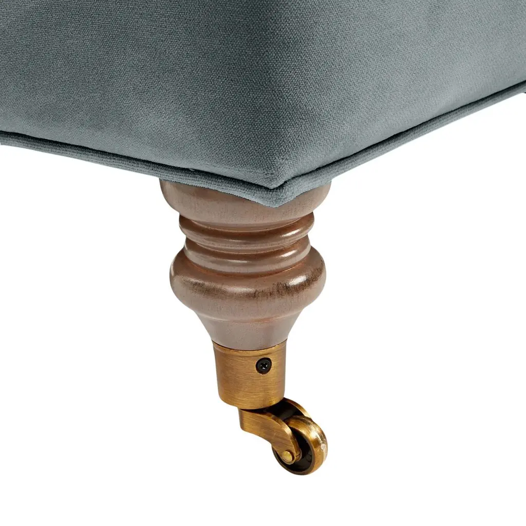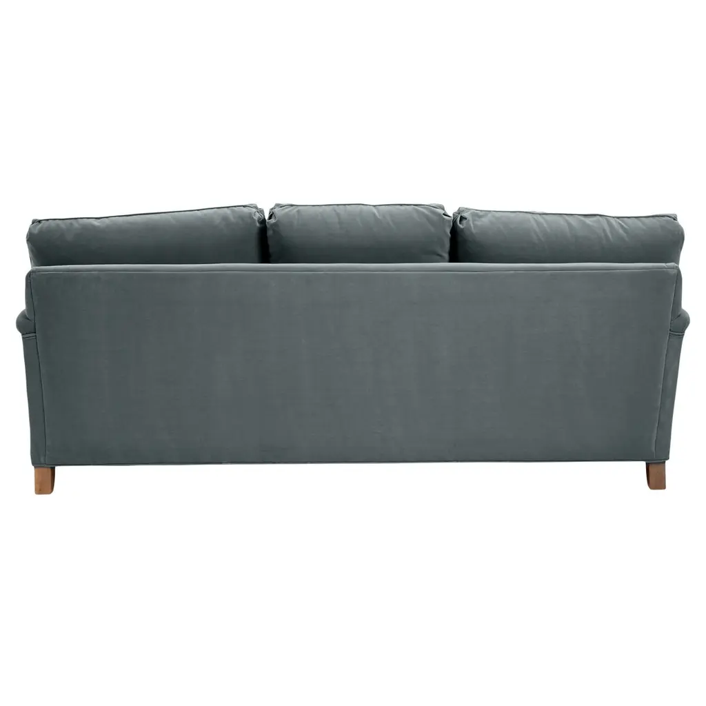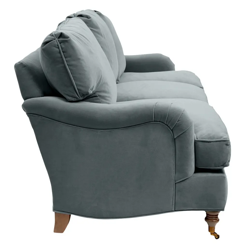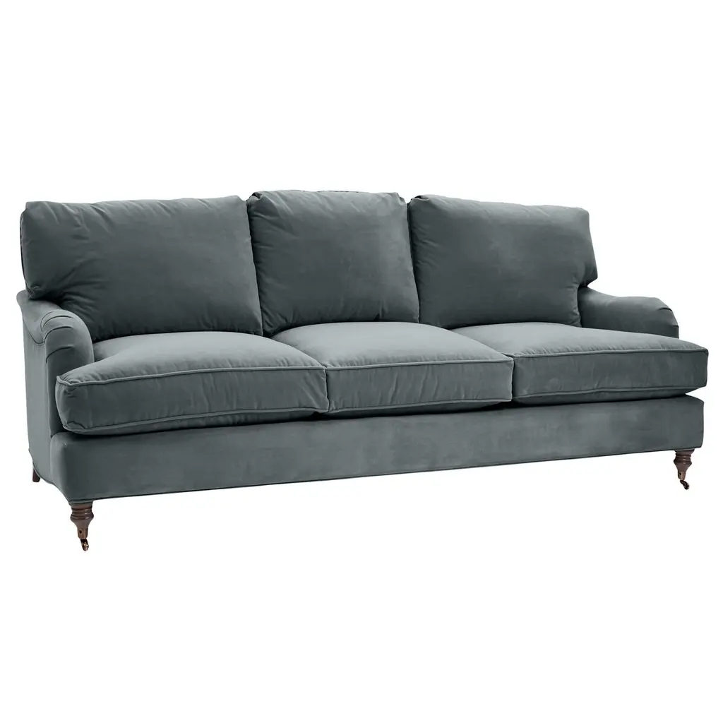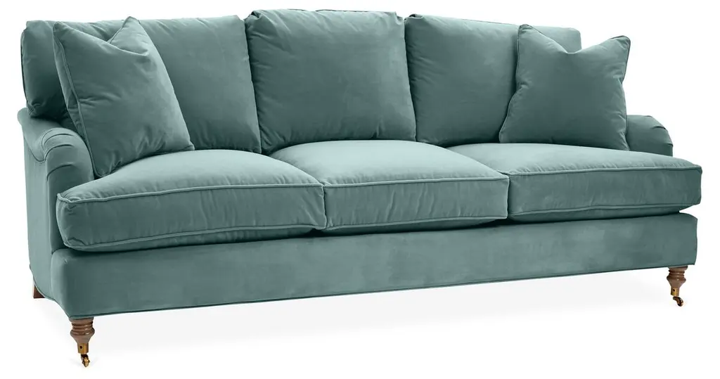 Available only at One Kings Lane: This elegant and inviting sofa is framed in kiln-dried hardwood with classic English arms and neatly tailored upholstery. A generous feather-and-down fill ensures long-lasting comfort and support, while finely turned front legs finished with caster wheels provide easy mobility and protect floors from scratching and marring. Two matching throw pillows are included. Made in the USA.