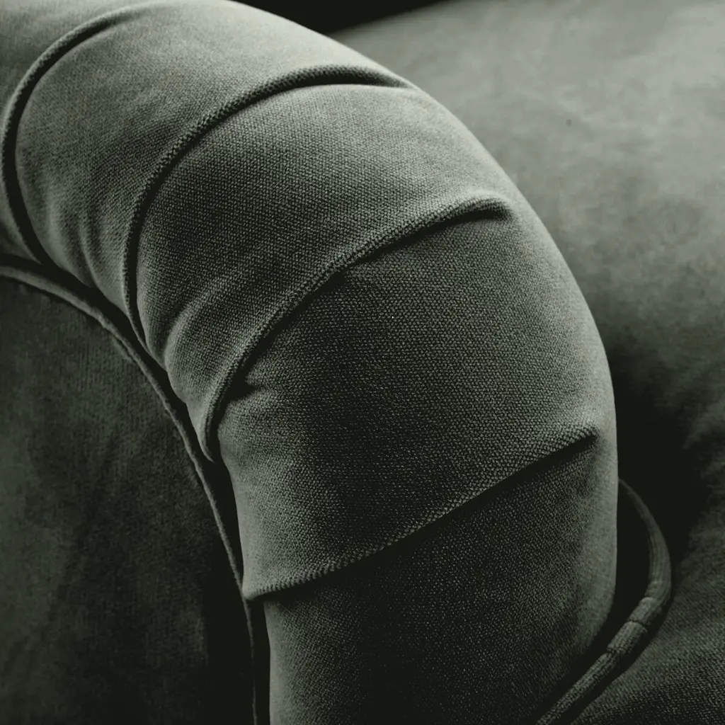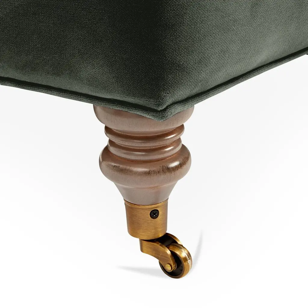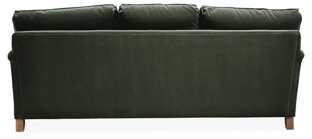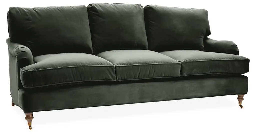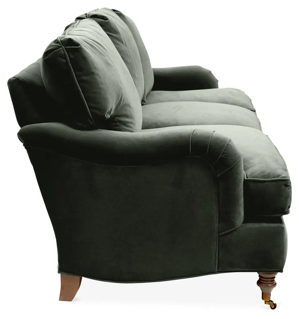 Available only at One Kings Lane: This elegant and inviting sofa is framed in kiln-dried hardwood with classic English arms and neatly tailored upholstery. A generous feather-and-down fill ensures long-lasting comfort and support, while finely turned front legs finished with caster wheels provide easy mobility and protect floors from scratching and marring. Two matching throw pillows are included. Made in the USA.