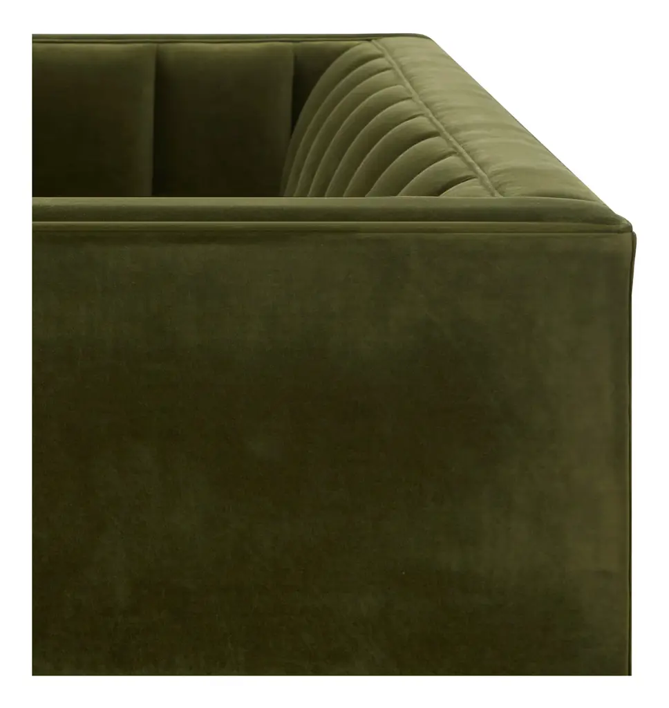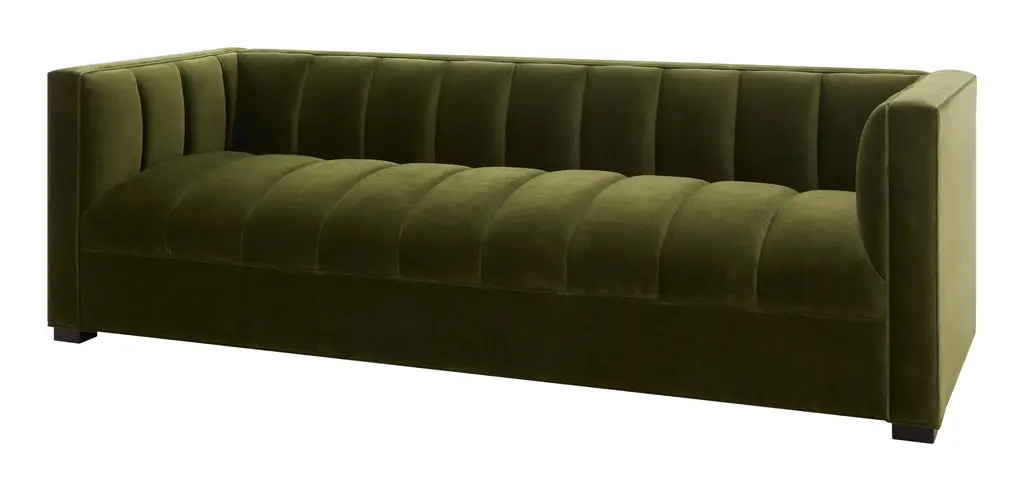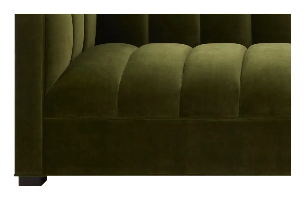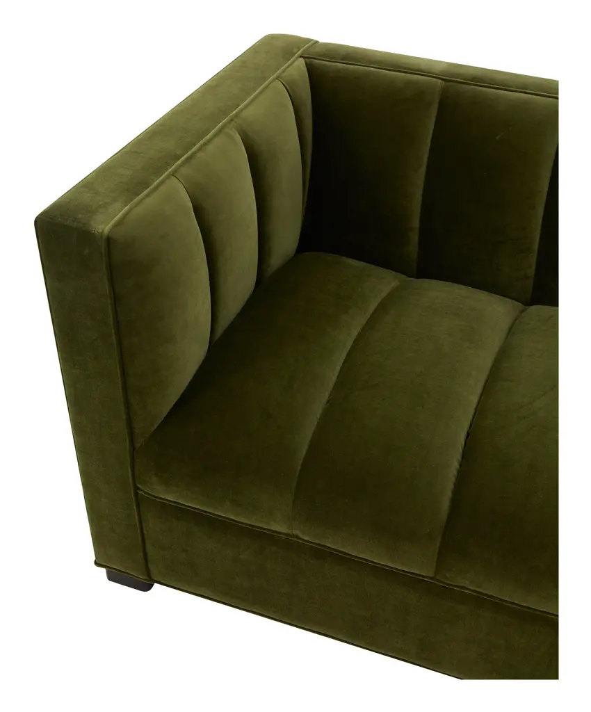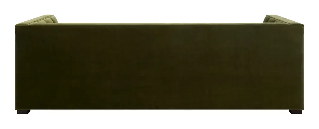Give your space a dose of chic sophistication with our Bryne Sofa. An updated take on the classic tuxedo-style frame, this enveloping sofa pairs a sleek, squared-off silhouette with rows of channel tufting and chunky recessed legs. Along with these good looks, it also sits comfortably thanks to its soft yet supportive bench seat, low-lying back and high, sheltering armrests. Perfect as an anchor piece in a cozy, modern living room, we also love it dressed up with luxe pillows in the sitting room. As Shown •upholstered in vance jade velvet •fabric content: 100% cotton•espresso wood finish•channel tufting•sustainable construction•custom options available •made in the USA Dimensions •89.75"W x 34"D x 28.5"H•seat width: 76"•seat depth: 24.5"•seat height: 18.25"