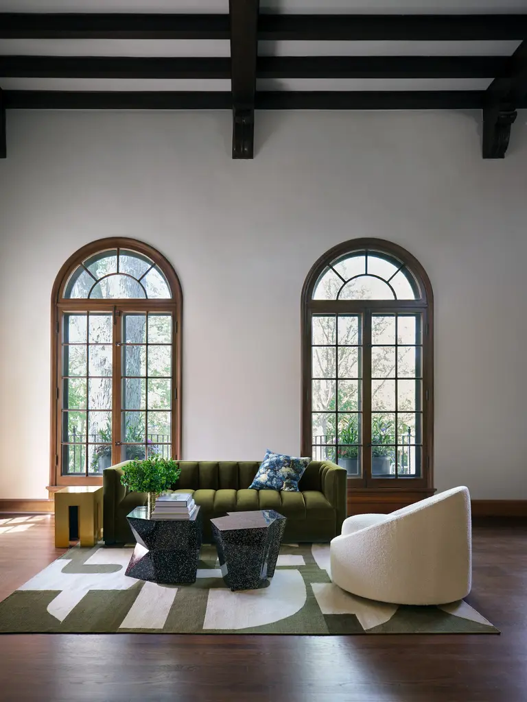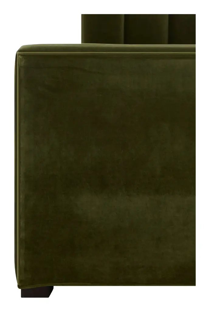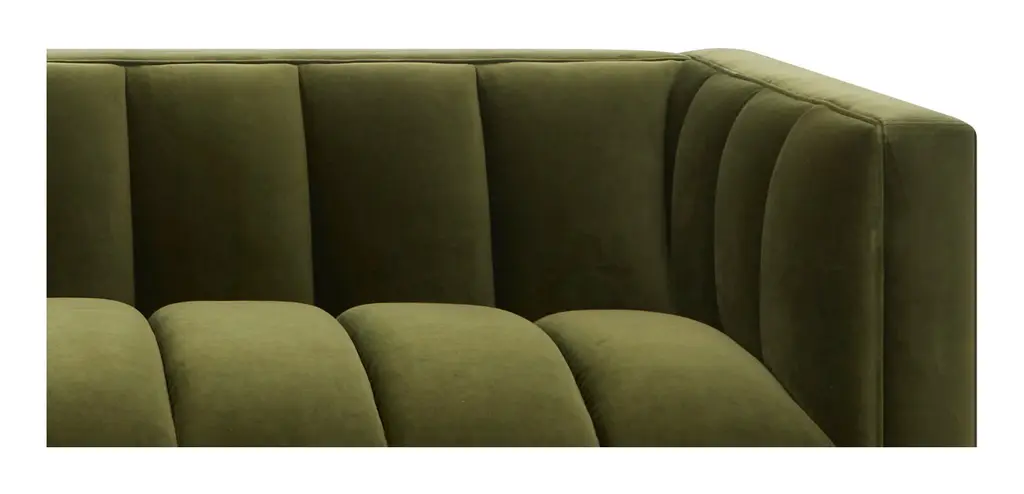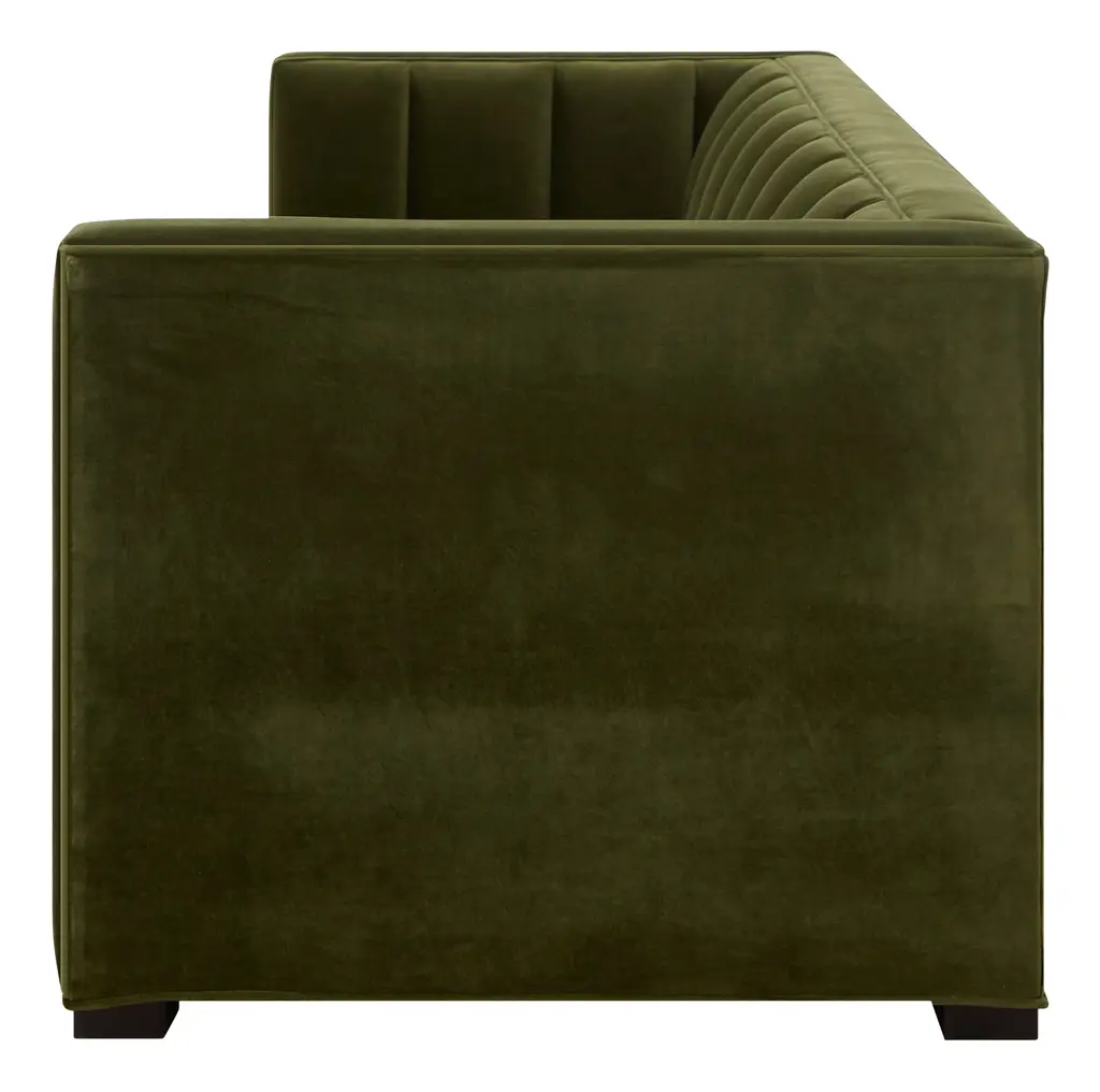 Give your space a dose of chic sophistication with our Bryne Sofa. An updated take on the classic tuxedo-style frame, this enveloping sofa pairs a sleek, squared-off silhouette with rows of channel tufting and chunky recessed legs. Along with these good looks, it also sits comfortably thanks to its soft yet supportive bench seat, low-lying back and high, sheltering armrests. Perfect as an anchor piece in a cozy, modern living room, we also love it dressed up with luxe pillows in the sitting room. As Shown •upholstered in vance jade velvet •fabric content: 100% cotton•espresso wood finish•channel tufting•sustainable construction•custom options available •made in the USA Dimensions •89.75"W x 34"D x 28.5"H•seat width: 76"•seat depth: 24.5"•seat height: 18.25"