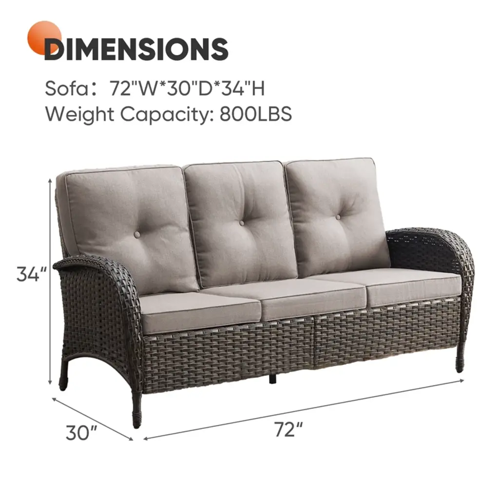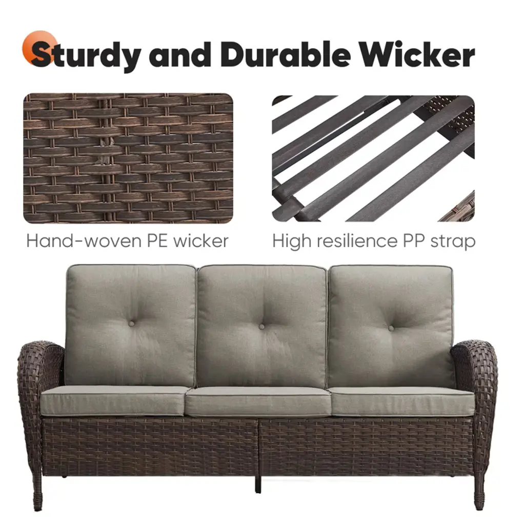 Relax in style with Buenhomino Wicker Patio Sofa¡ªa perfect blend of comfort and durability! This 3 Seater Rattan Sofa features a high backrest, hand-woven PE rattan, and plush thick cushions for ultimate relaxation. The powder-coated steel frame ensures stability, while weather-resistant materials make it ideal for outdoor use. Easy to assemble¡ªupgrade your patio, garden, or poolside today!
