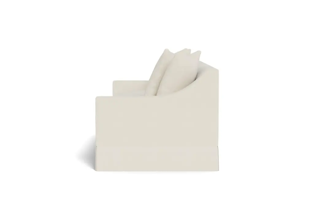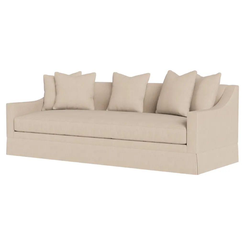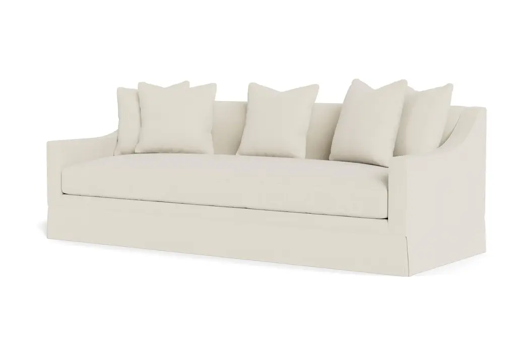 A handsome, modern skirted sofa with sloped arm. Sleek tailoring complemented by a single seat cushion and four loose 21" x 21" pillows. Great depth, wonderful for lounging. Four loose pillows. - Kiln-dried solid maple frame with double-doweled joints and corner blocks for superior strength. - Eight-way hand-tied coil spring suspension with a solid webbed base. - Spring down cushions include: individually wrapped steel coils with uniform weight distribution, downproof ticking and generous fill of down, feathers and fiber. These cushions pair the comfort of down with a slightly firmer and more tailored appearance.