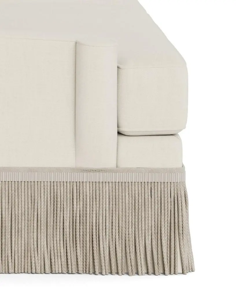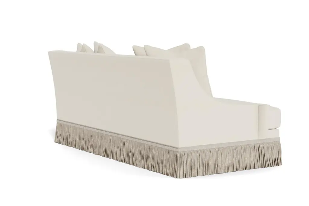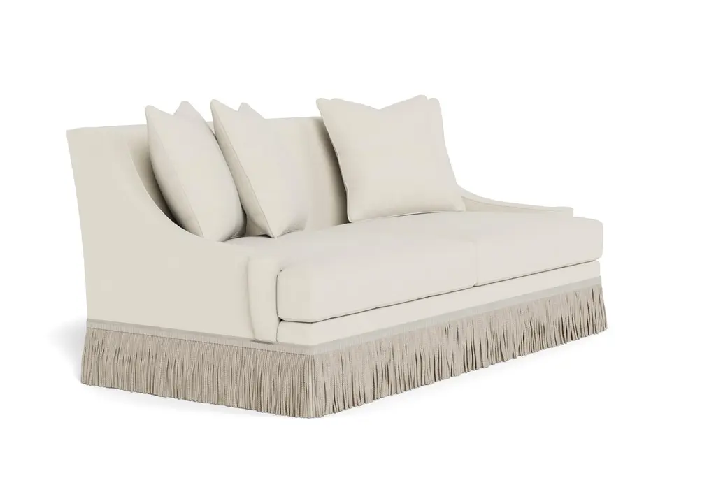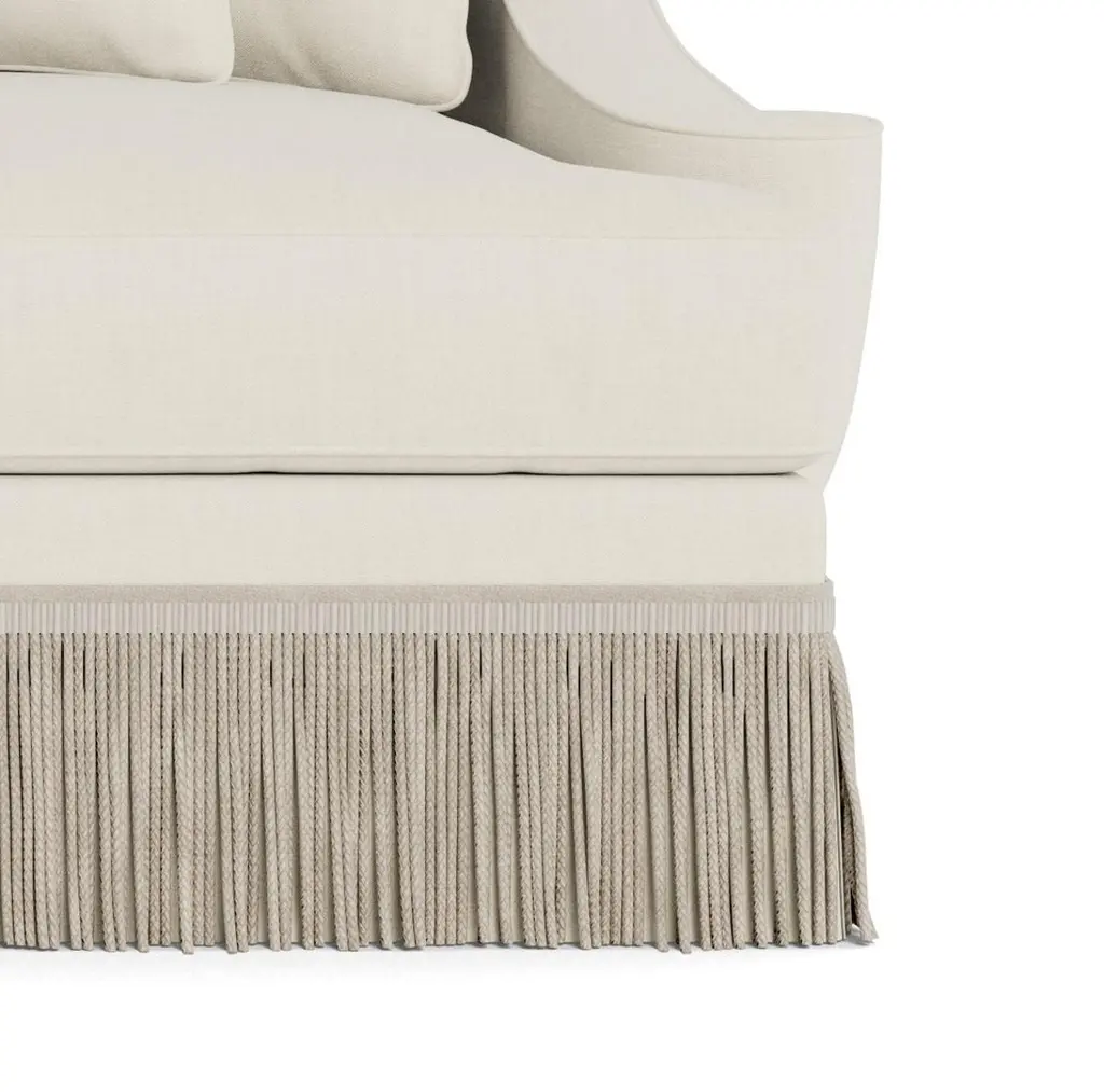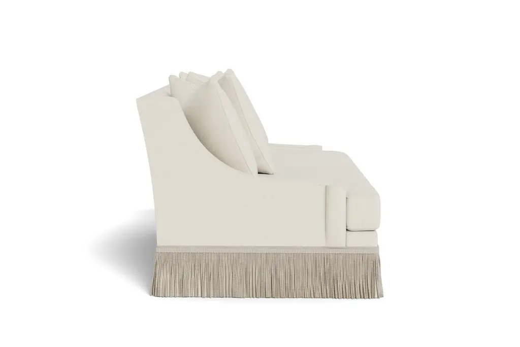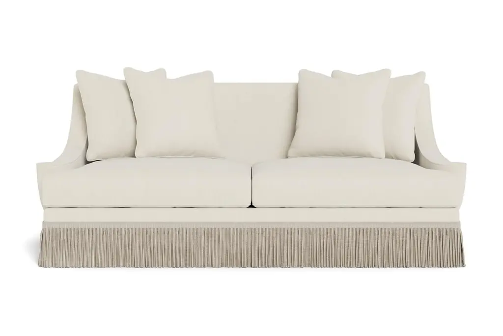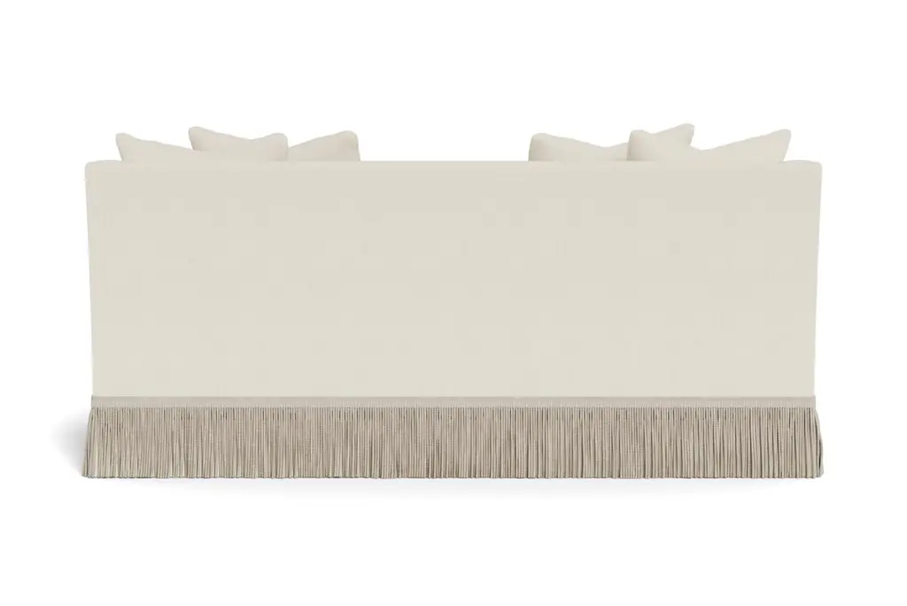 A deep, comfortable, and sophisticated sofa. Welcoming, curvaceous arms descend and slightly flare out, a sophisticated design complemented by 8.25" bullion fringe. Tight back, with four loose 21" x 21" pillows and two seat cushions. Cushions are spring down - individually wrapped steel coils with uniform weight distribution, down-proof ticking and generous fill of down, feathers and fiber. These cushions pair the comfort of down with a slightly firmer and more tailored appearance. Handcrafted in USA. Made to order in cream performance linen, a fabric able to be cleaned and used in high traffic areas. Returns are not accepted on made to order items.