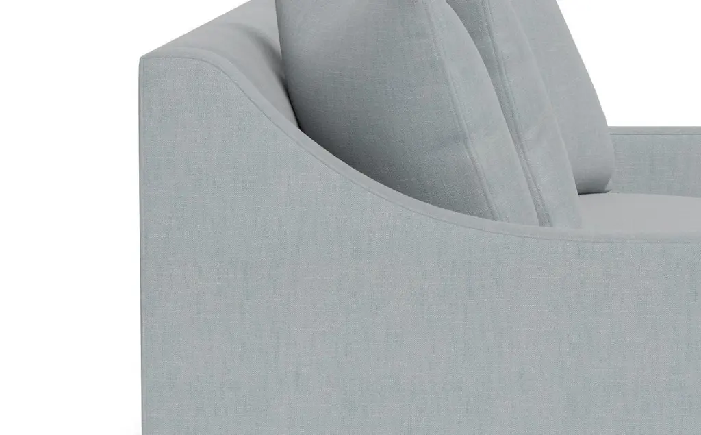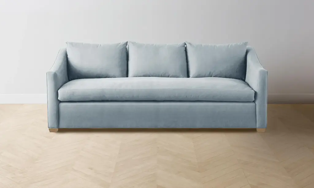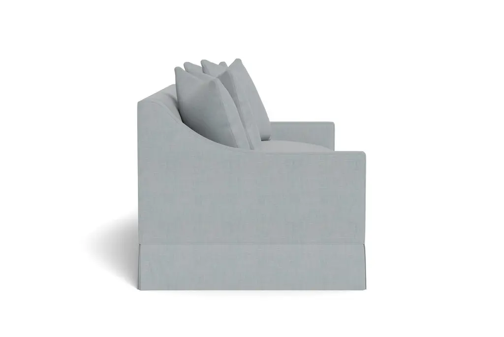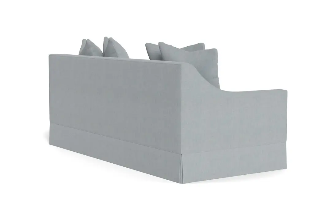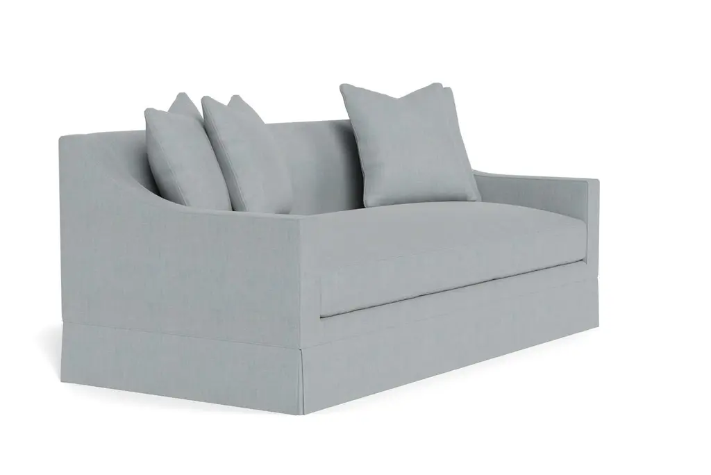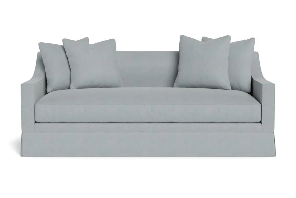 A handsome, modern skirted sofa with sloped arm. Sleek tailoring complemented by a single seat cushion and four loose pillows 21" x 21". Great depth, wonderful for lounging. Made to order in sky performance linen, a fabric able to be cleaned and withstand a high traffic area. Cushions are spring down - individually wrapped steel coils with uniform weight distribution, down-proof ticking and generous fill of down, feathers and fiber. These cushions pair the comfort of down with a slightly firmer and more tailored appearance. Also available in 96". Handcrafted in the USA. Returns are not accepted on made to order items.