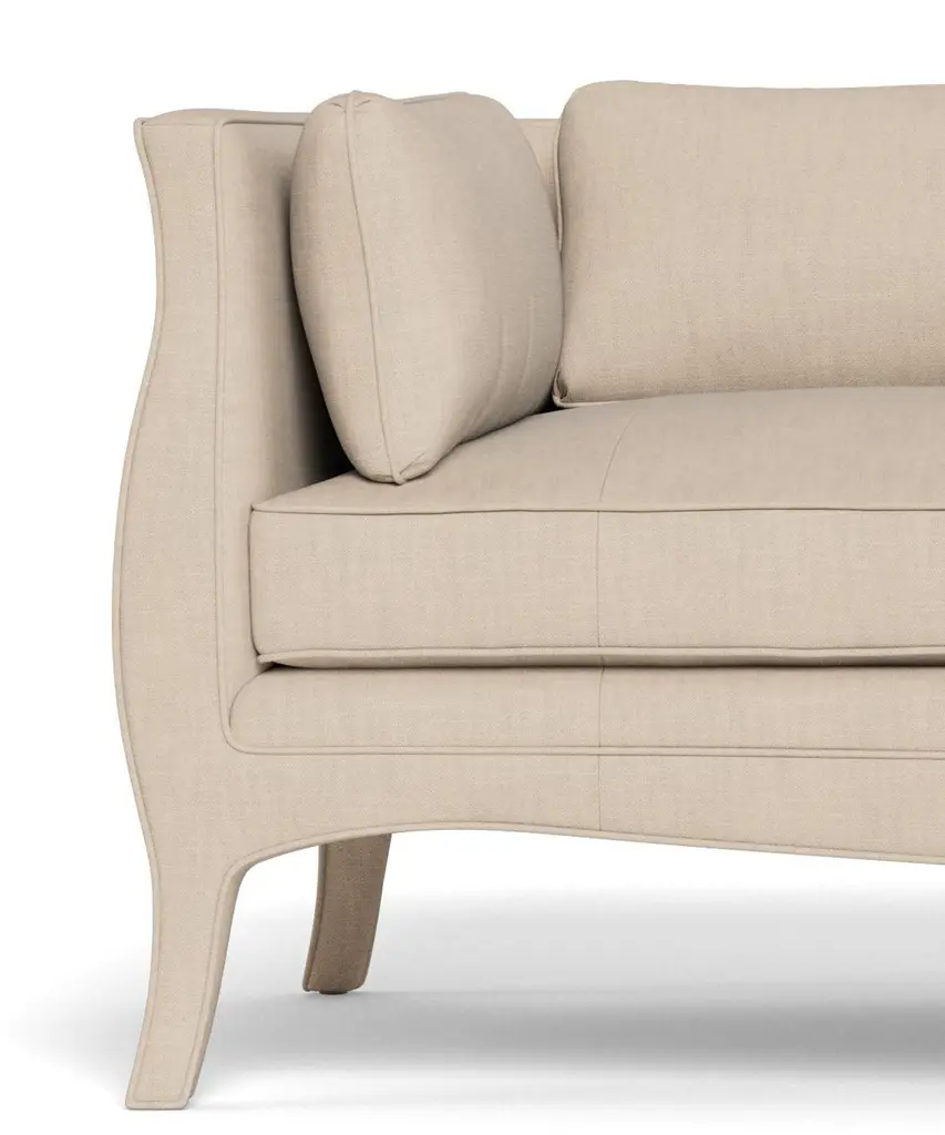 This piece, with its pretty lines and long, low form, is so tempting to sink into and when you do you’ll appreciate the irresistible softness, deep plush seat and perfectly sized plump cushions that envelop you. Ideal entertaining an intimate crowd, this sofa is well suited to linen and velvet. Made to order in sand performance linen, a fabric able to be cleaned and used in high traffic areas. Kiln-dried solid maple frame with double-doweled joints and corner blocks for superior strength. Eight-way hand-tied coil spring suspension with a solid webbed base. Cushions are spring down - individually wrapped steel coils with uniform weight distribution, down-proof ticking and generous fill of down, feathers and fiber. These cushions pair the comfort of down with a slightly firmer and more tailored appearance. Additional bolster pillows have a feather down fill. Handcrafted in the USA. Returns are not accepted on made to order items.
