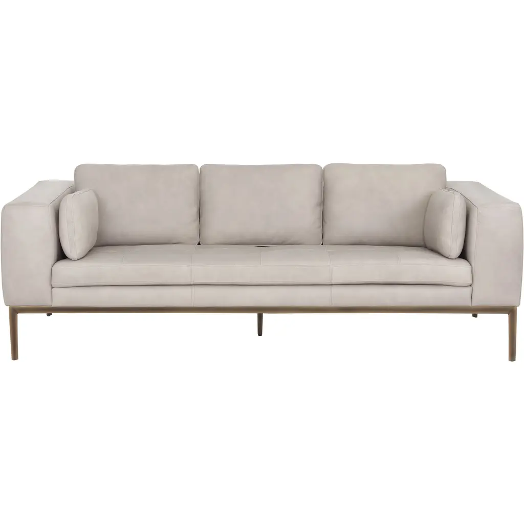 A masculine sofa with a modern design. Features an oversized seat and armrests with antique brass feet. Stocked in bali bone leather. Can be paired with coordinating armchair. Handle with Care: This design has been crafted with leather. Leather is a natural material as such markings, wrinkles, grooves and light scratches are acceptable and appreciated characteristics. No two pieces are alike. Visit our Product Care page for more information on how to ensure the lasting beauty of this piece.