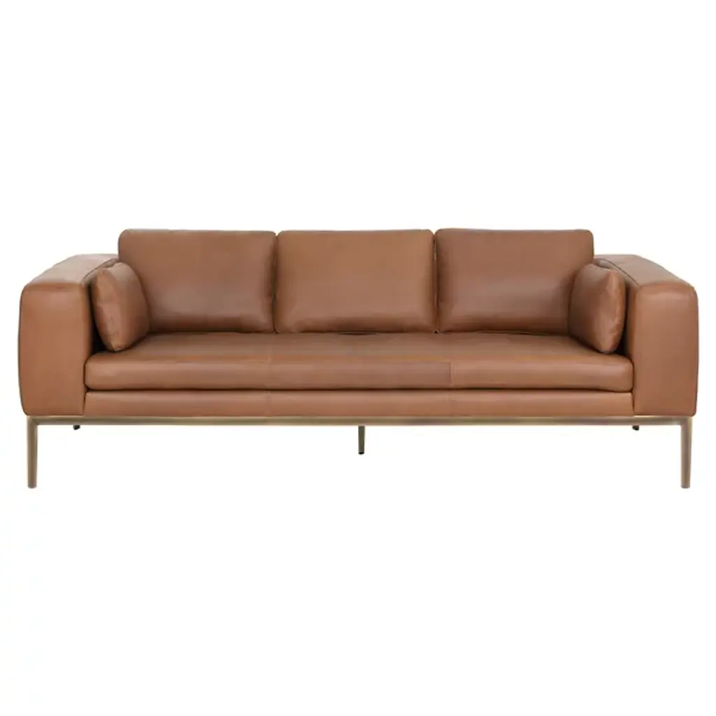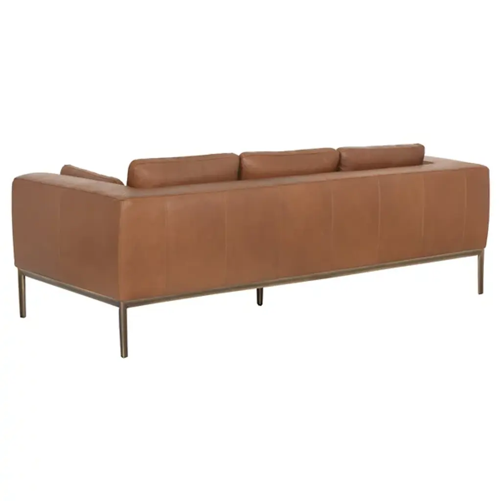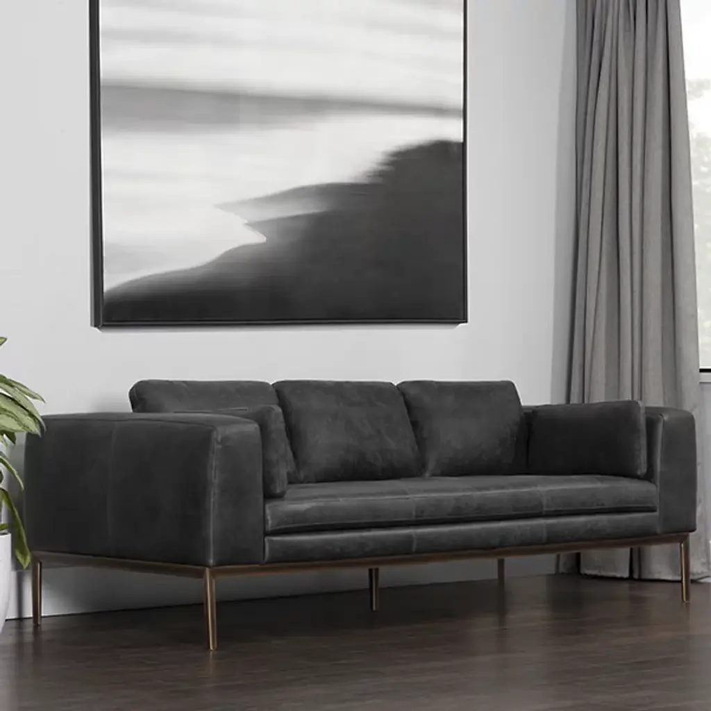 The Burr Sofa from Sunpan delivers commanding elegance through meticulously considered proportions. The generous design features expansive armrests and deep seating wrapped in premium bovine leather that develops distinctive character through natural markings and patina. Rustic bronze-finished steel legs elevate the sofa while providing a strong industrial foundation that enhances its contemporary appeal. This refined design brings a sophisticated presence accentuated with layers of exceptional comfort to modern living spaces.