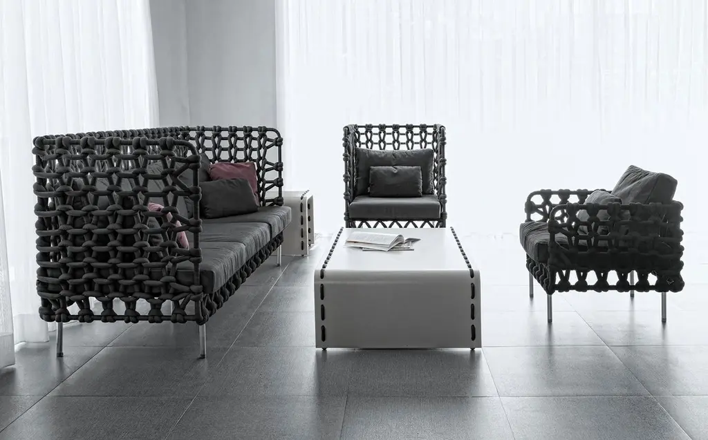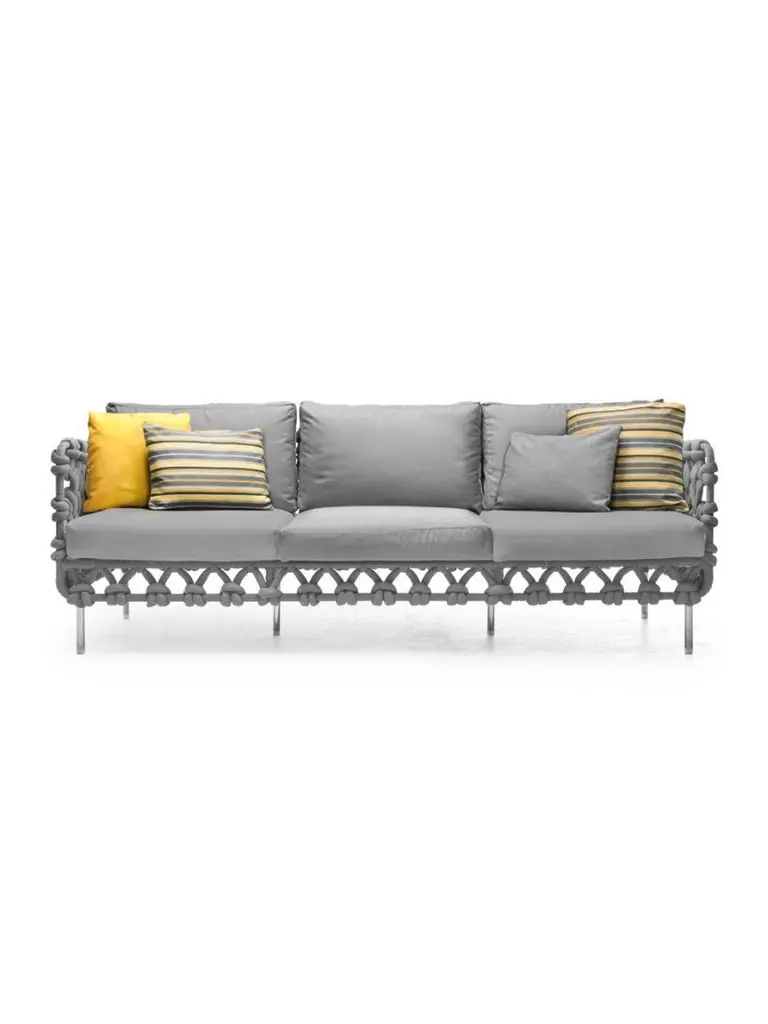 Cabaret sofa lowback by Kenneth CobonpueMaterials: Polyester fabric, urethane foam, steel, and stainless steel.Dimensions: 78cm x 214cm x H 64cm Cabaret wraps you in the warmth of its fabric layers like an oversized knit sweater. The innovative knotting and weaving technique used in the design lends sophistication to any room.Also available in other sizes and colors.Designer's BiographyKenneth Cobonpue is a multi-awarded furniture designer and manufacturer from Cebu, Philippines. His passage to design began in 1987, studying Industrial Design at the Pratt Institute in New York. While completing his studies, he apprenticed for a leather and wood workshop near Florence, Italy. He went on to study Furniture Marketing and Production at the Export-Akademie Baden-Württemberg in Reutlingen, Germany, under a private and state scholarship program, and subsequently worked in Bielefeld and Munich.Kenneth returned home to Cebu in 1996 to manage Interior Crafts of the Islands, Inc., a furniture design and manufacturing company founded by his mother Betty Cobonpue in 1972. Discovering that modern design could have a new face using natural fibers and materials, Kenneth created pieces of functional art, offering an alternative to the Western definition of modern design. Today, the Kennethcobonpue brand has become known globally for its unique designs and extensive roster of clientele, including Hollywood celebrities and members of royalty.With his masterful way of integrating nature, traditional craft and innovative technologies, designer and creative director Kenneth Cobonpue has earned international awards and recognition for his creative, organic, and expressive pieces. Working closely with some of the world’s leading designers, from household names to emerging talents, Kenneth has been pushing the envelope for design in the Philippines and sharing his vision to a global audience. Awards to his credit include five Japan Good Design Awards, the grand prize at Singapore International Design Competition, the Design for Asia Award of Hong Kong, the American Society of Interior Design Top Pick selection and the French Coup de Coeur award. Several of his designs were selected for several editions of the International Design Yearbook published in London and New York. Phaidon’s book entitled “& FORK” underscores Kenneth’s position as a leader of a new movement incorporating new technologies with crafts. In 2007, TIME magazine called him “rattan’s first virtuoso”. Kenneth was named the Designer of the Year in the first edition of Maison et Objet Asia held in March 2014 in Singapore.Kenneth reveals new work each year in the design shows from Milan to New York, and he speaks regularly about Southeast Asian design all over the world. He has also appeared in European television and in countless international magazines and newspapers around the world. Various Cobonpue designs have also appeared in full-length feature films and television, such as Oceans 13 and CSI.