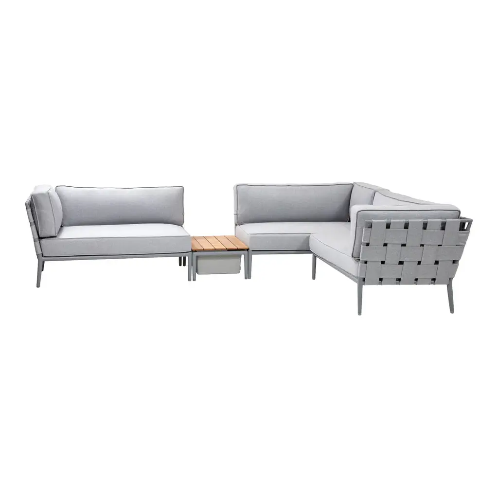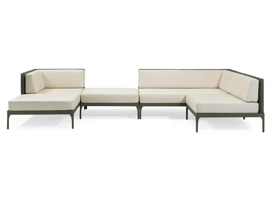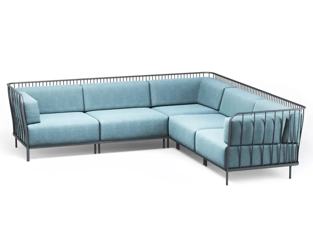 Cabla is a modular, upholstered garden sofa with a stainless steel frame. Available in a two or three seater version.Cabla, design Lucidi-Pevere, is a modular upholstery system. It is born from the skilful meeting of two worlds in which functionality and aesthetic value are equivalent. On the one hand, the metal soul of the stainless steel structure fruit of EMU's historic know-how, essential and timeless in design. On the other, the comfort and chromatic richness of fabrics and cushions specially designed for the collection and dedicated to the outdoor world. Cabla is a modular and assemblable upholstery system designed to obtain numerous configurations thanks to just 3 modules: single linear seat, chaise longue and armrest. Through a very intuitive fastening system, it is possible to compose armchairs and sofas of different shapes and sizes, which with the addition of the chaise longue ensure a totally relaxing experience. The name Cabla takes its inspiration from its maximum compositional ductility and its ability to adapt to a wide variety of uses, particularly environments near the sea thanks to the use of stainless steel for the structure. The collection is completed by coffee tables in wire mesh to be offered in combination.