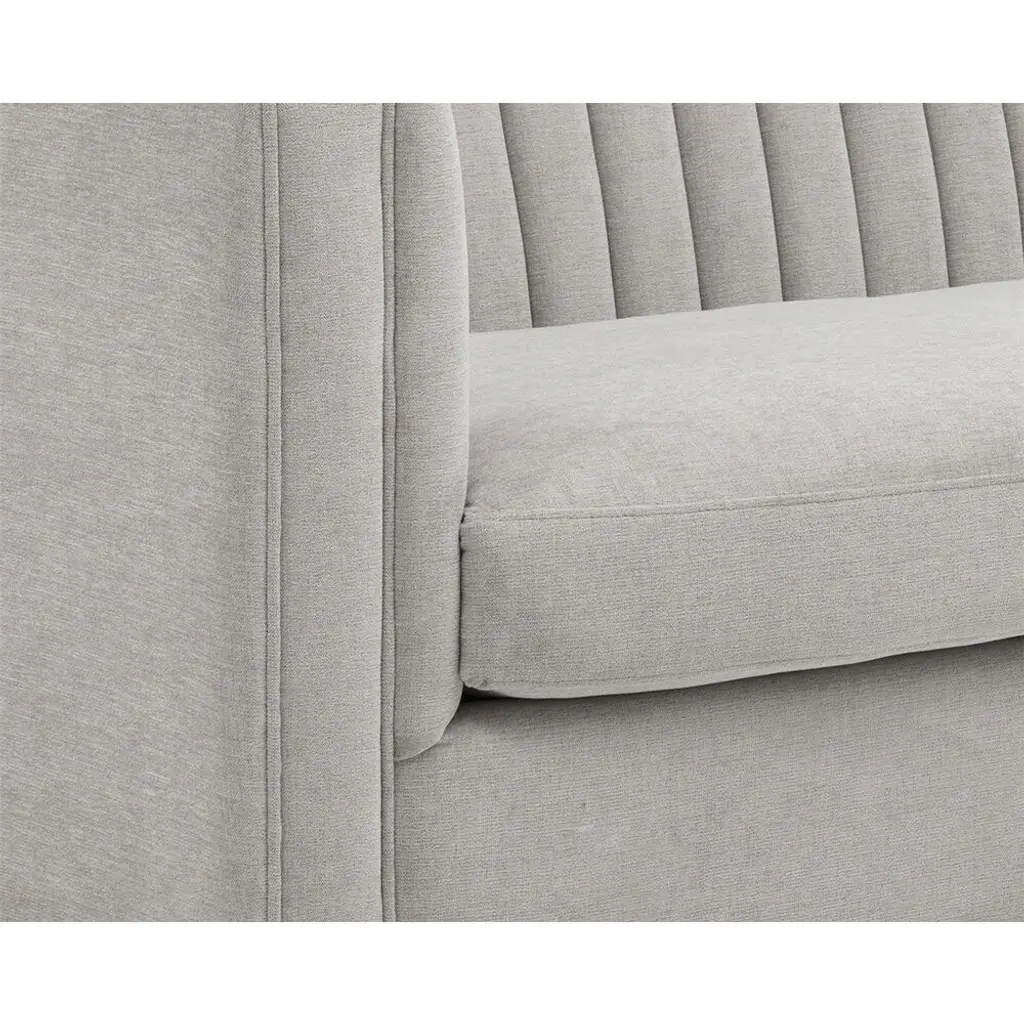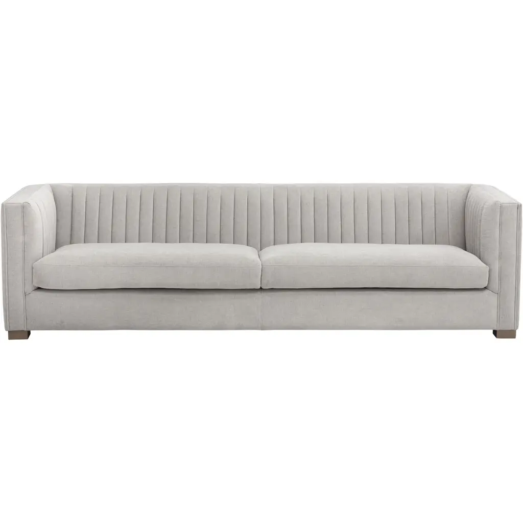 Make a statement with this modern sofa featuring striking channel tufting on the seatback. Stocked in our hemingway silver fabric with antique brass feet. Suitable for residential and commercial environments.