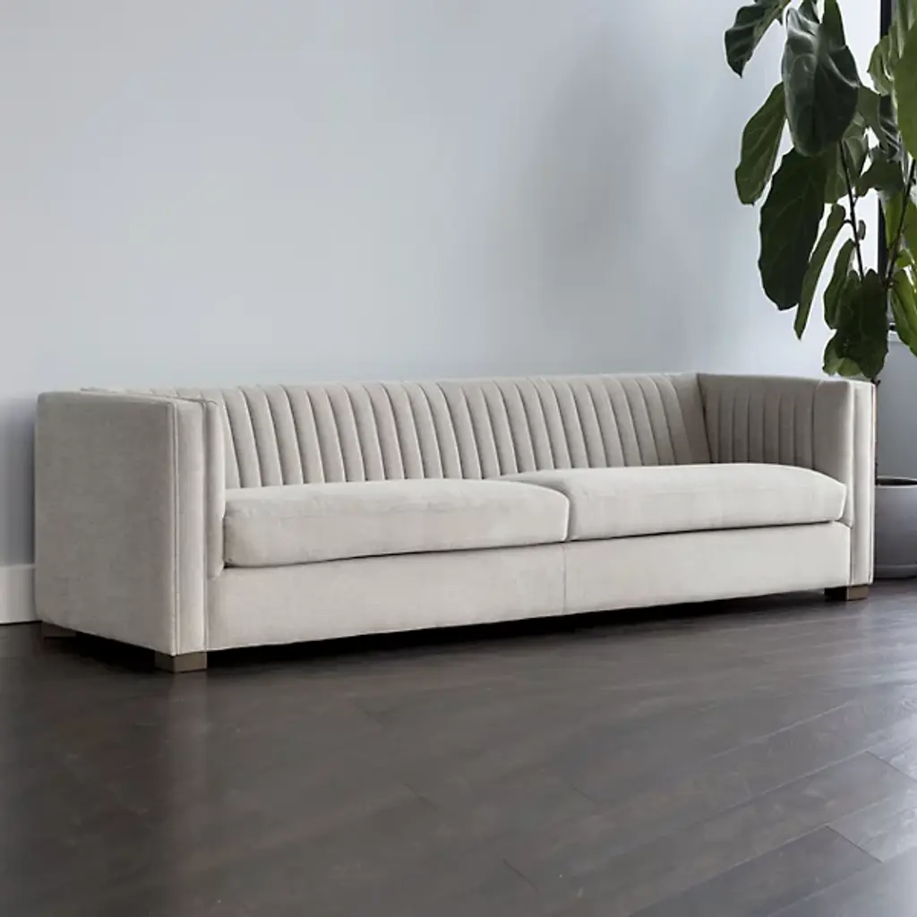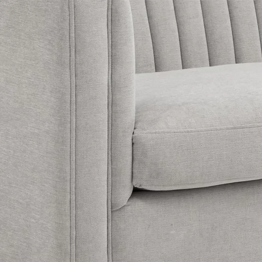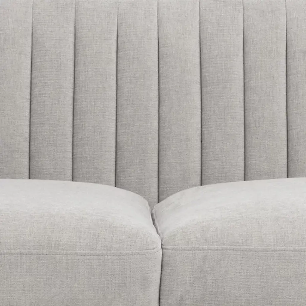 The Caitlin Sofa from Sunpan is designed to make a bold statement with its striking channel tufting on the seatback. Upholstered in our luxurious Hemingway silver fabric, this sofa exudes elegance and comfort. The addition of antique brass feet provides a sophisticated contrast, enhancing the overall aesthetic of the piece. Perfectly suited for both residential and commercial environments, this sofa elevates your decor and offers a stylish and inviting seating solution, making it an eye-catching centerpiece in any room.