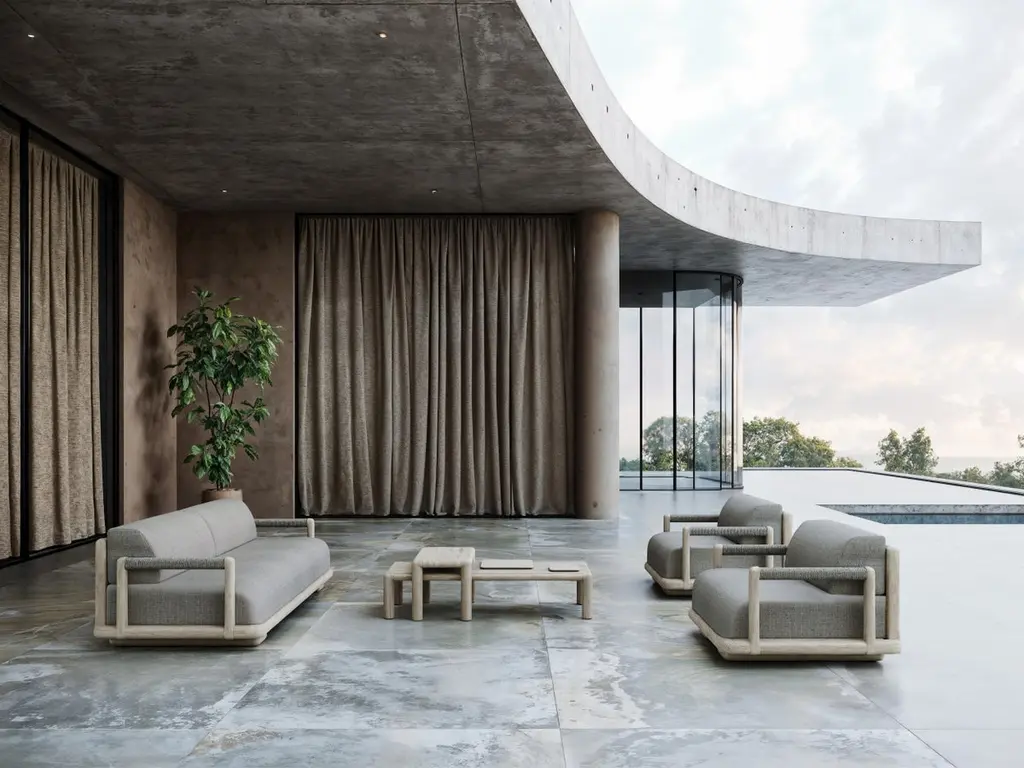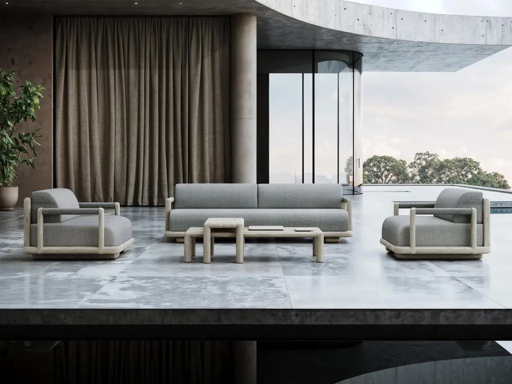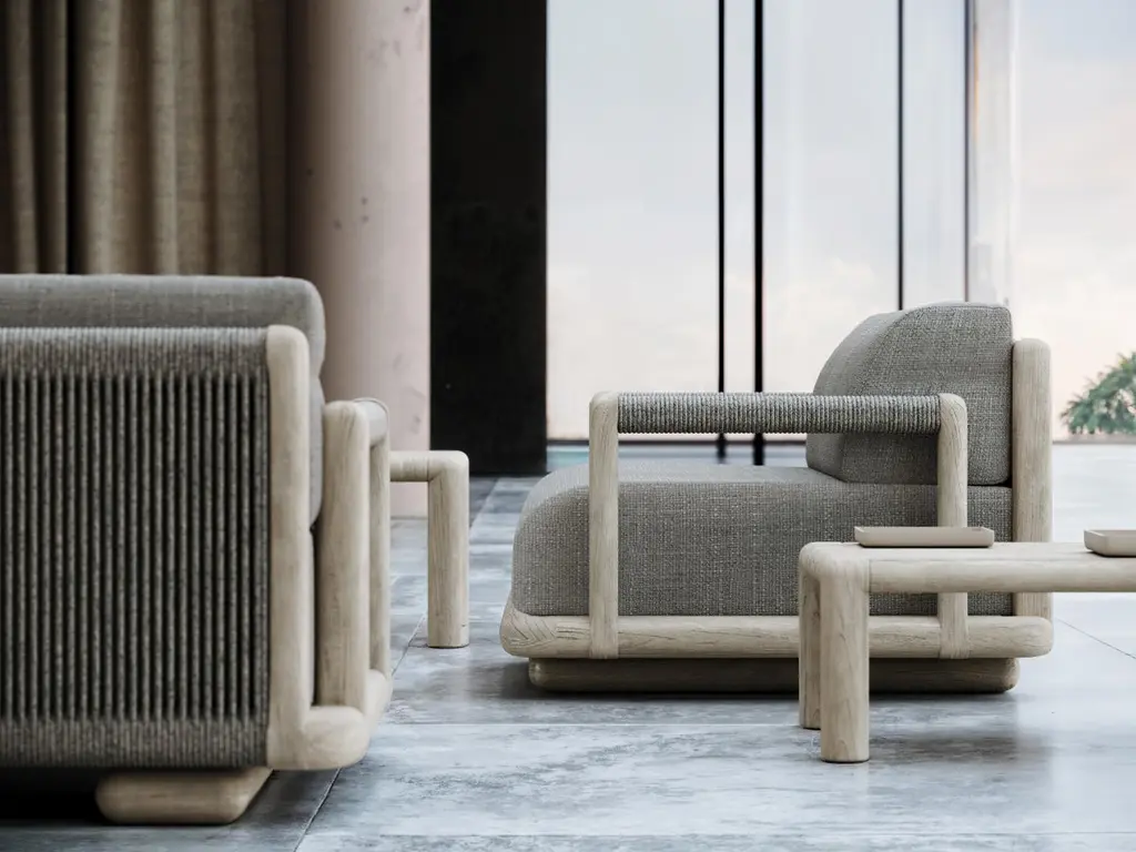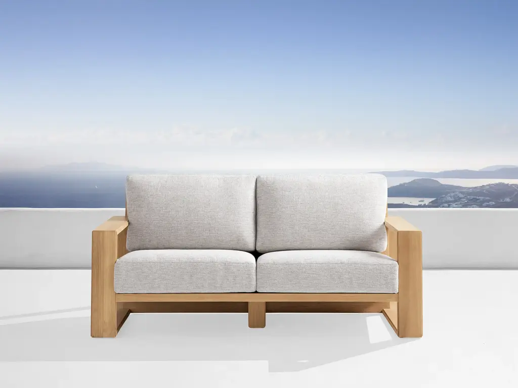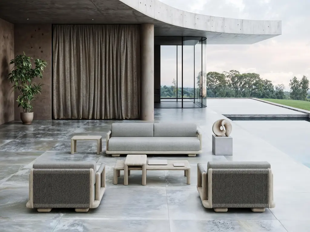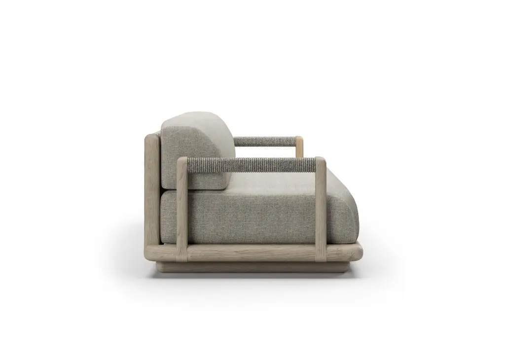Caleo-Ash Teak Wood Frame, Rope And Ethereal Fabric Two-Seater Sofa by SNOCDimensions: D 100 x W 195 x H 65 cm. SH: 42 cm.Materials: Teak wood, rope, and Ethereal fabric. The Caleo Collection embodies understated luxury, blending contemporary form with timeless materials. Designed for both outdoor settings, this modular lounge series prioritizes comfort and adaptability, offering sleek, minimalist lines that define the space while providing unmatched flexibility. Crafted with a refined Ash and Natural Teak wood frame, the collection’s modularity invites creative configurations, allowing each piece to seamlessly adapt to different environments. Upholstered in soft, durable fabrics, the seating offers a tactile warmth that contrasts beautifully with the solid structure, making it a perfect blend of softness and strength.SnocSince their foundation in 2004, SNOC’s history has been interwoven with that of international design. Each chapter written with care, each product reflecting its passion. The company understands that a real story exists behind each object and behind that story, a real person desiring something more. Their ever-developing methodology focuses on defining the core of a brand and utilizing those characteristics to help nurture its soul, aiding in forging real connections. This approach , results in their unique “work in progress” style: original, versatile solutions that in their signature blend of sound, vision and design best-suit every environment and situation, arousing a range of emotions on a daily basis as well as standing the test of time.Driven by functional research, an inclusive project and product culture, and deep care for the environment, we exist as the timeless yet present essence of outdoor furniture design elevating private and public space a like with thoughtfully presented, endlessly adaptive creations.