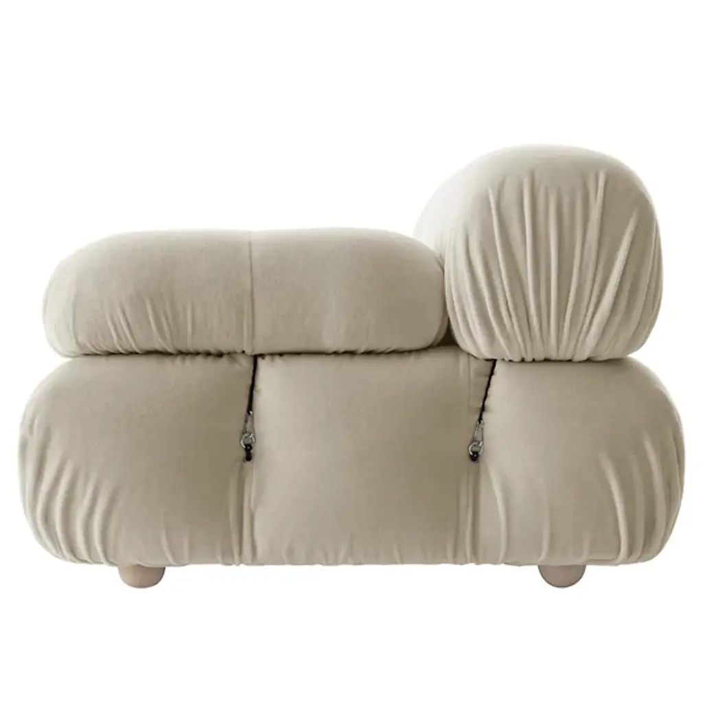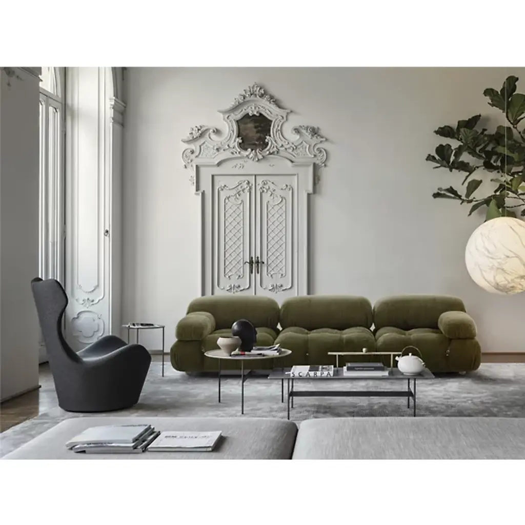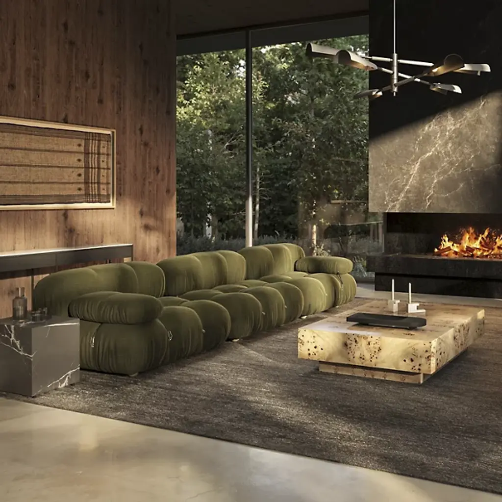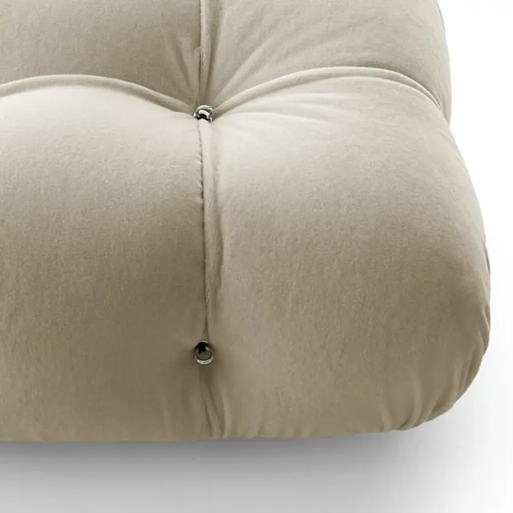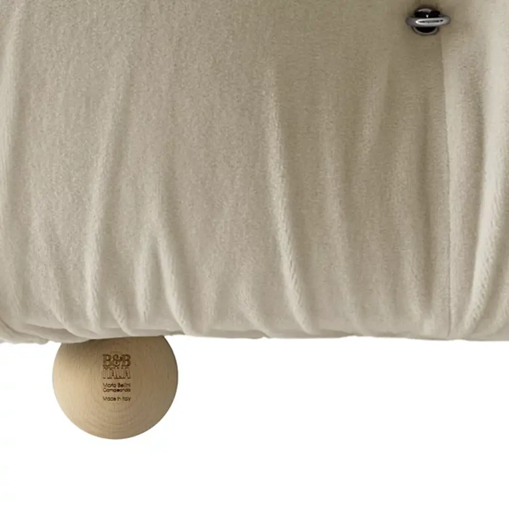The inviting Camaleonda Sofa from B&B Italia, a genuine icon since its inception in the 70s, now boasts enhanced comfort and sustainability. Suggesting the chameleon in its name and adaptability, this piece underscores designer Mario Bellini’s blend of organic form and Italian sensibility. This sofa’s natural shapes are filled with layered padding and wrapped in a soft removable cover for recycling. The capitonné-style cover creates elegant tufts for brass rings and carabiners to slot into. The units hook together to furnish any size space. The sofa sits low, and the spherical wood feet create a floating effect.