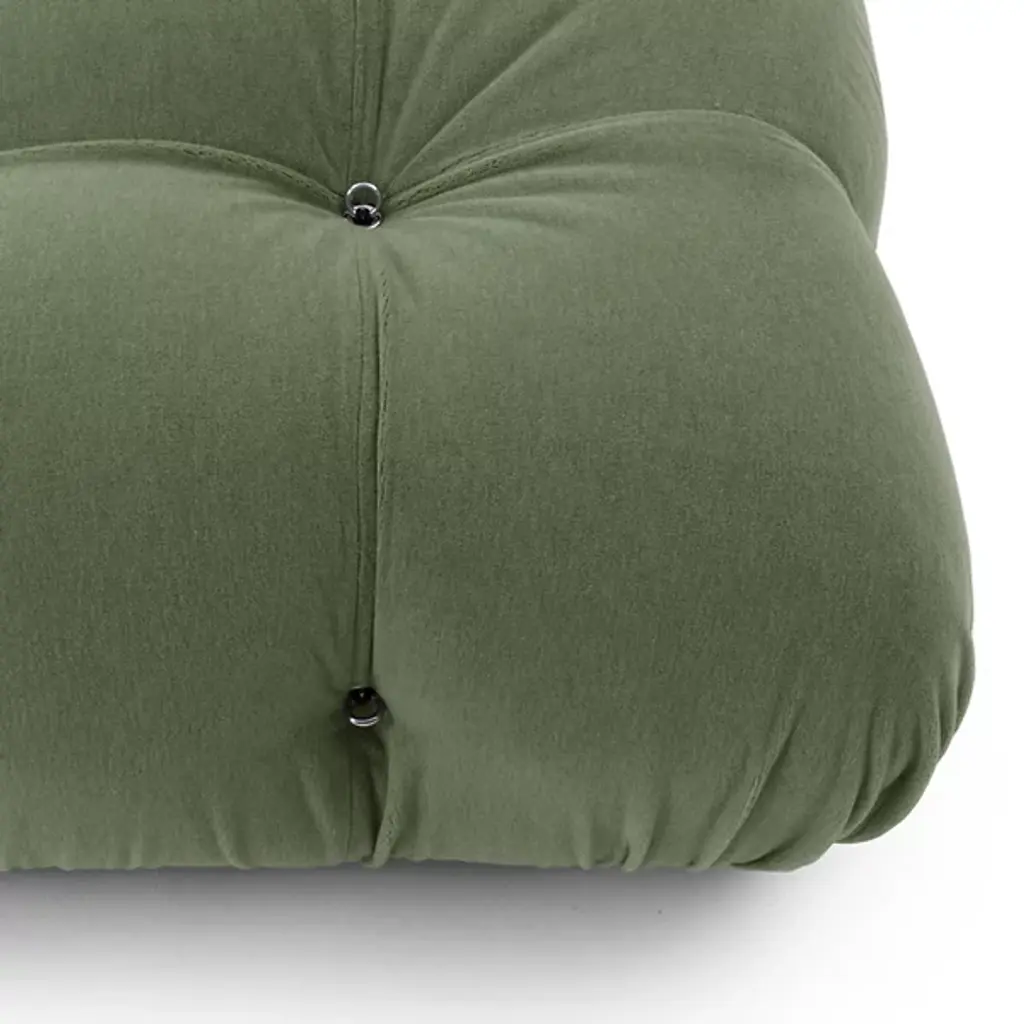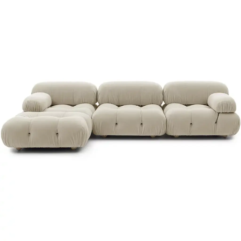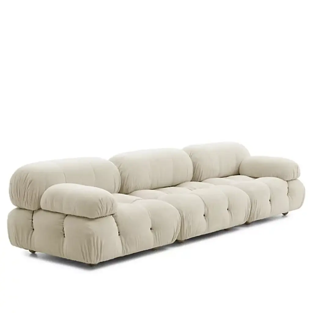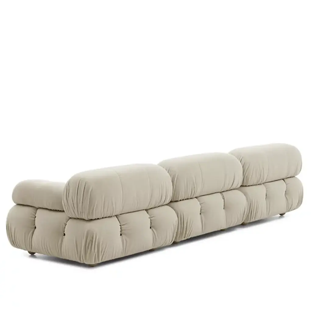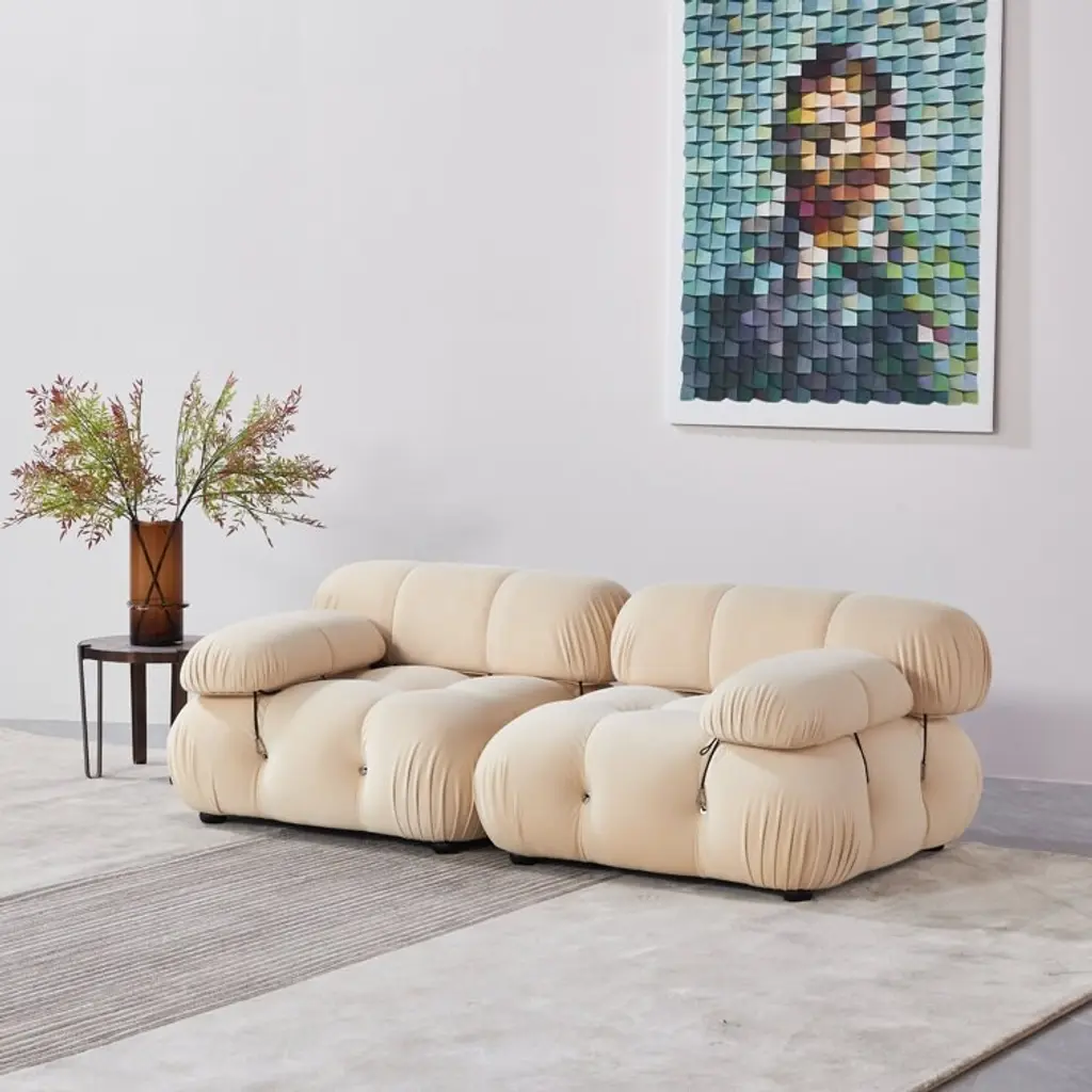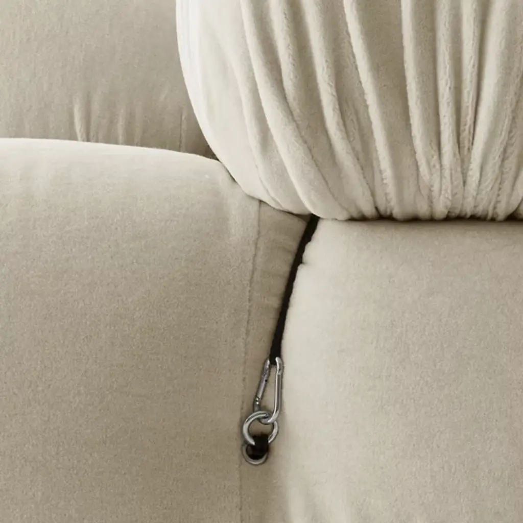 The inviting Camaleonda Sofa from B&B Italia, a genuine icon since its inception in the 70s, now boasts enhanced comfort and sustainability. Suggesting the chameleon in its name and adaptability, this piece underscores designer Mario Bellini’s blend of organic form and Italian sensibility. This sofa’s natural shapes are filled with layered padding and wrapped in a soft removable cover for recycling. The capitonné-style cover creates elegant tufts for brass rings and carabiners to slot into. The units hook together to furnish any size space. The sofa sits low, and the spherical wood feet create a floating effect.