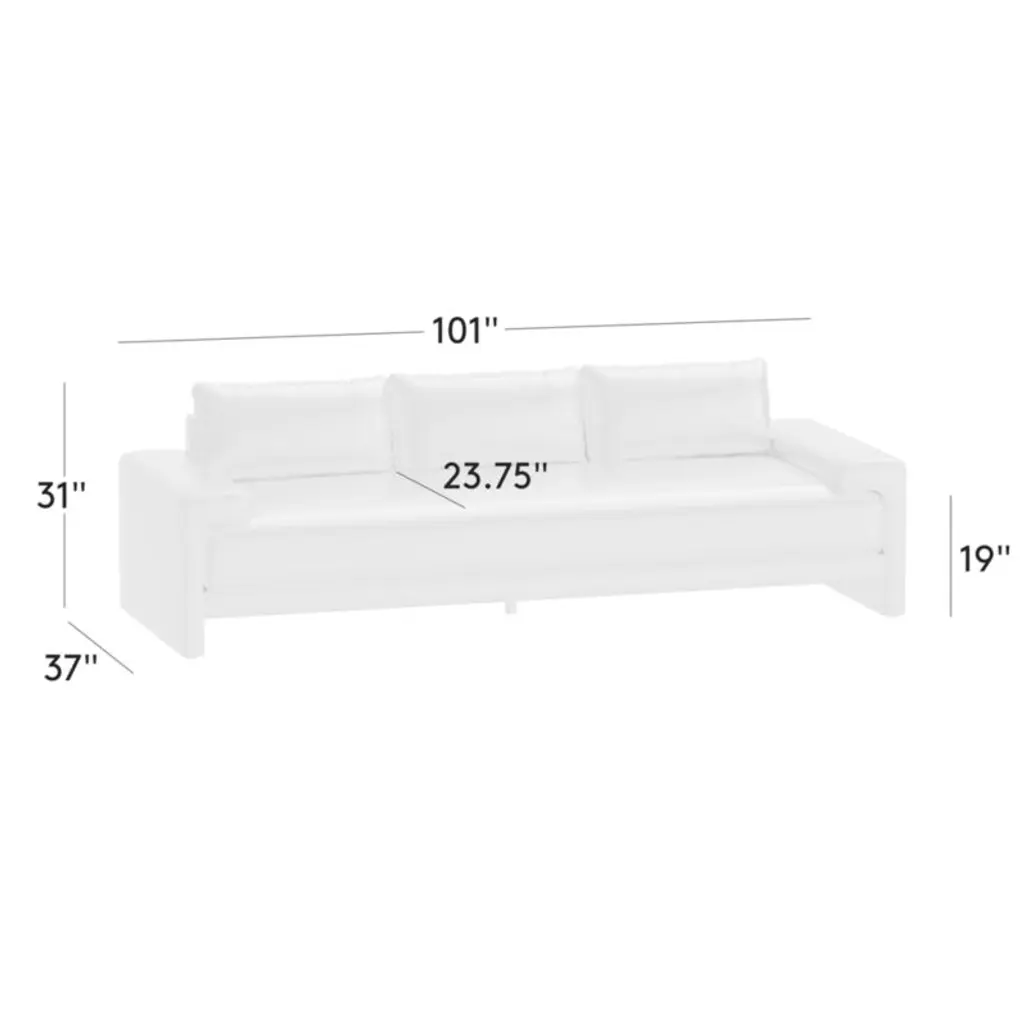 Barcelona-based Mermelada Estudio puts a slightly '70s spin on this vintage-inspired sofa, upholstered in moss green velvet for a modern-meets-livable take. Wraparound arms add architectural interest, while three loose back cushions keep it comfortable. CB2 exclusive.