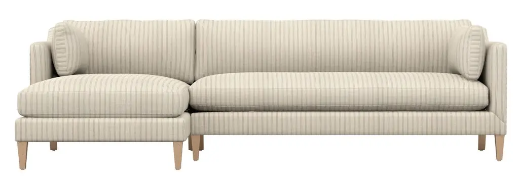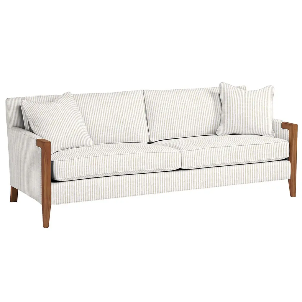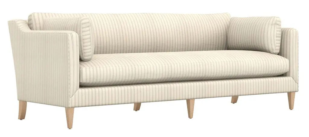 Designed by us and available only at One Kings Lane: This sofa's striped upholstery looks like linen, but it's washable, eco-friendly, and stain-resistant, making this a great choice for households with pets, kids, or spill-prone adults. The streamlined arms and tapered legs give the sofa a fresh yet timeless appeal. The handcrafted, kiln-dried hardwood frame ensures that the sofa can withstand years of use, while the feather-and-down cushion fill provides long-lasting comfort. Two matching pillows are included.