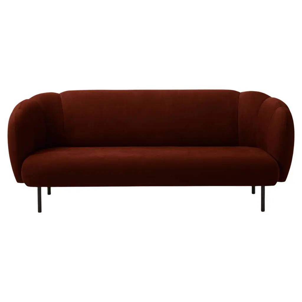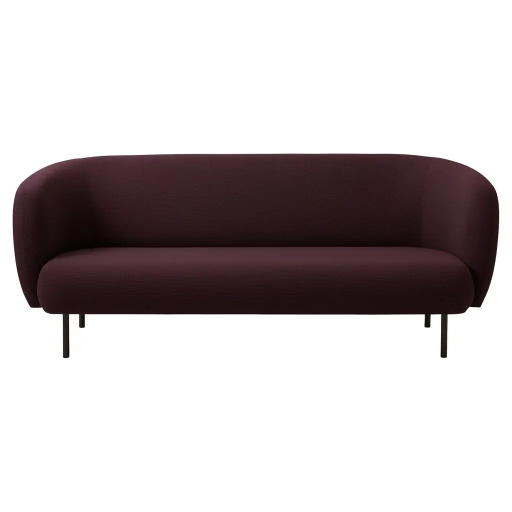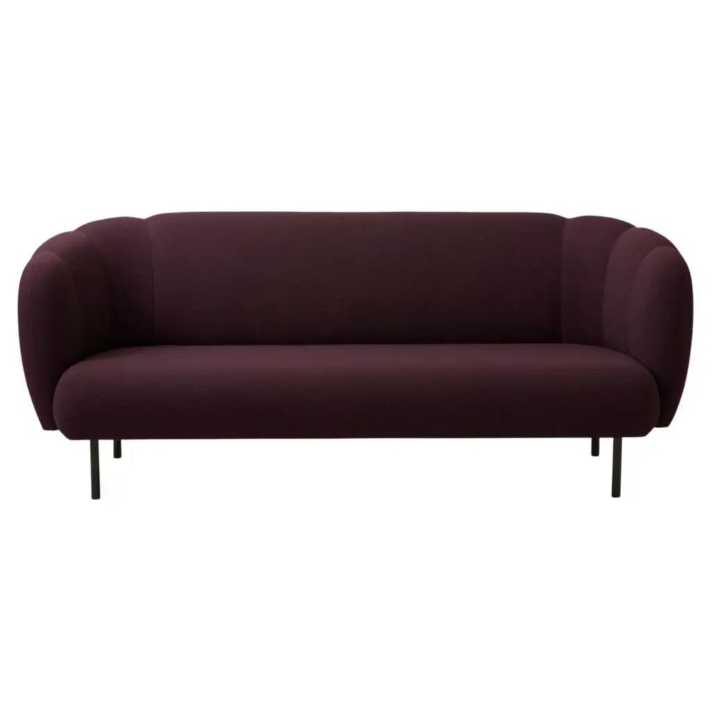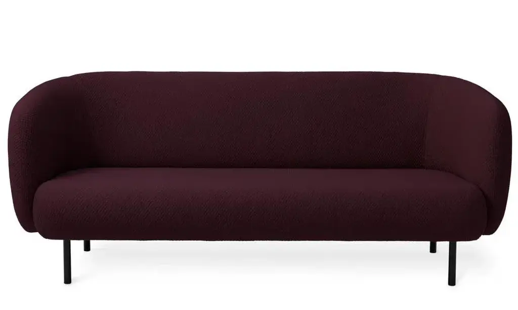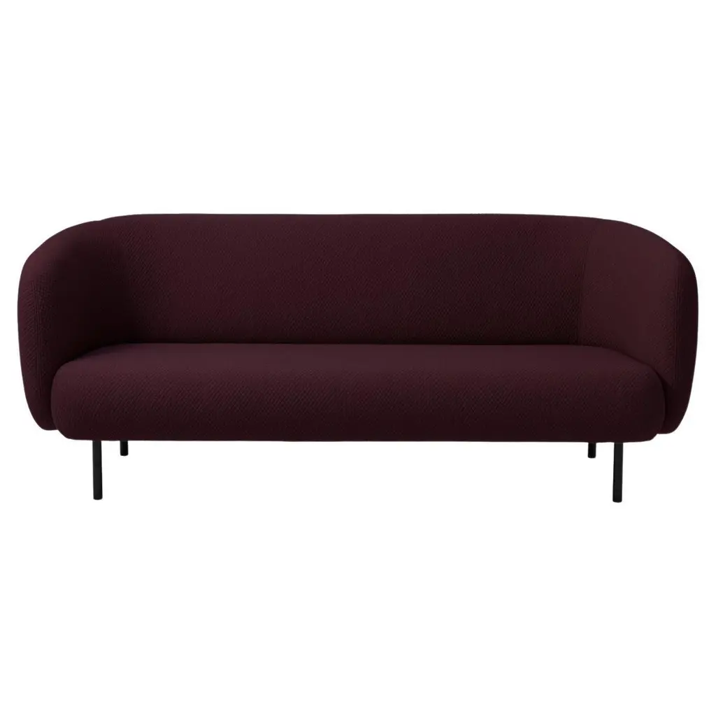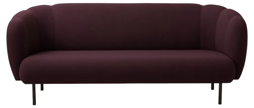 Caper 3 seater Mosaic Dark Bordeaux by Warm Nordic Dimensions: D206 x W84 x H 63 cm Material: textile upholstery, wooden frame, powder coated black steel legs. Weight: 55.5 kg Also available in different colours and finishes. An elegant sofa with an organic design inspired by the puffed sleeves and layered designs of haute couture. Its soft lines and chic details make the Cape sofa a natural focal point, preferably in the company of the armchair in the same range. Both items of furniture are available with or without visible stitching.