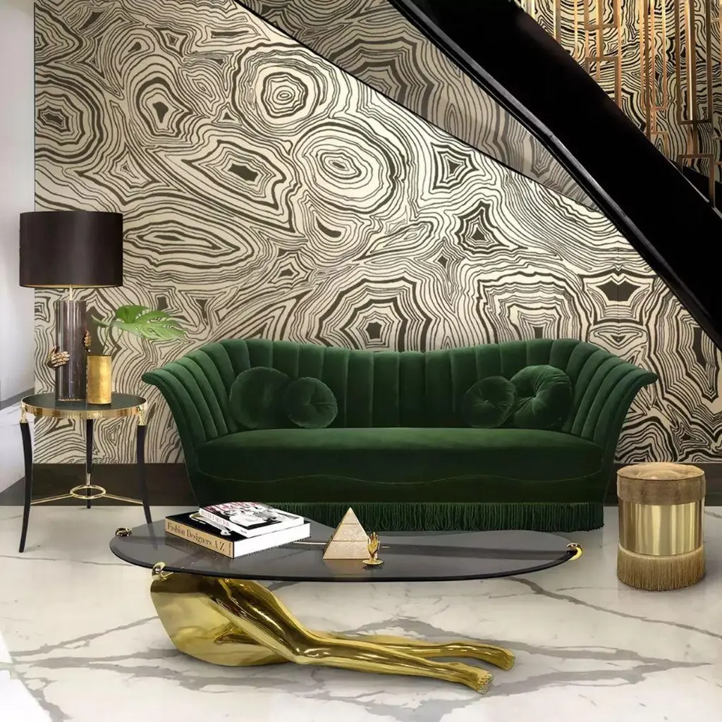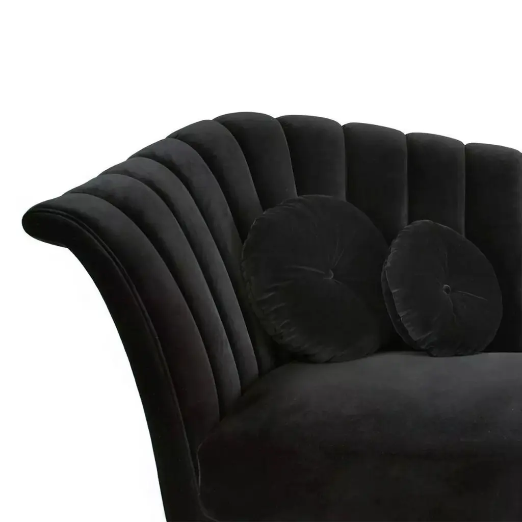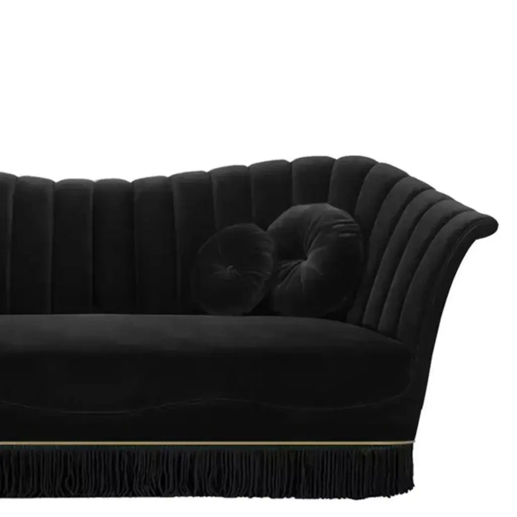 Flirty and unpredictable like a modern woman, the Caprichosa voluptuous sofa design mimics a woman's most desirable curves. Fitted like a little black dress in delicious upholstery fabric with a fringed skirt.Materials & Finishes: Upholstery: Lux Velvet Deep Black 0968 from the KOKET Textiles collectionBase: Bullion TasselPillows: Lux Velvet Deep Black 0968 from the KOKET Textiles collectionClean & Care: Care for textiles by vacuuming or lightly brushing. Maintain textiles by keeping them away from direct sunlight. Rotate and flip cushions when vacuuming for even wear. The nap of high pile textiles such as velvets may become crushed or lose its original pile height. We recommend light steaming to lift the pile to its original height. The textile should also be brushed with a de-linting brush to maintain its pile. Water based or solvent cleaner may cause discoloration or staining. We recommend that stained or soiled textiles be professionally cleaned.