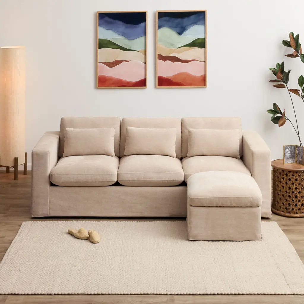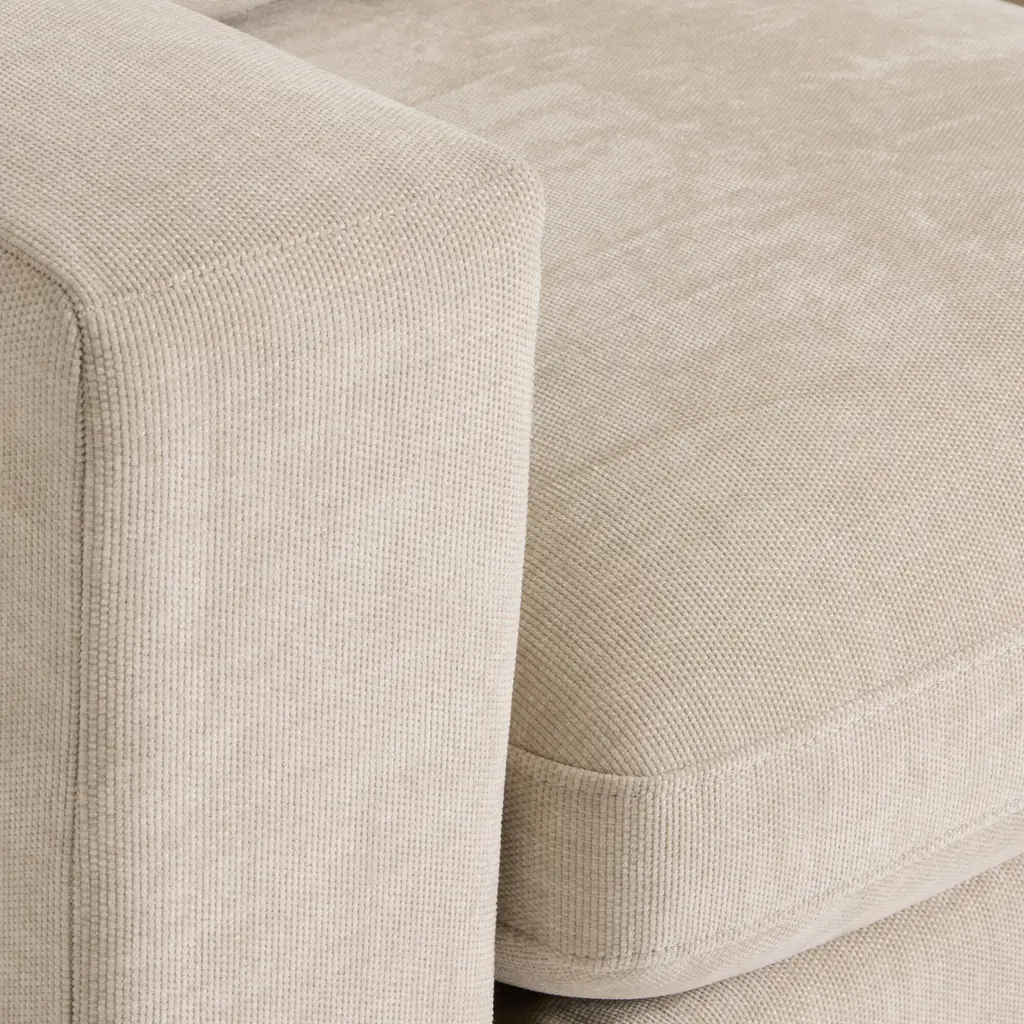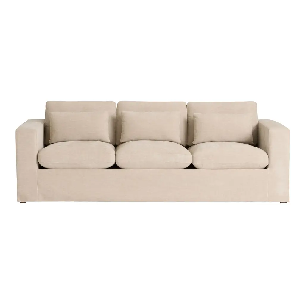 Tailored with textural upholstery in an ivory and tan mélange, our Carlyle sofa graces a modern track-arm profile with the skirted base of a faux slipcover. This classic three-over-three couch softens the transitional versatility of its clean, rustic style with the wonderful sink-in comfort of plush cushions and supportive lumbar pillows. This elegant, expansive centerpiece looks at home in any setting, from traditional to contemporary.
