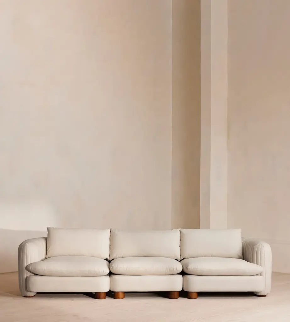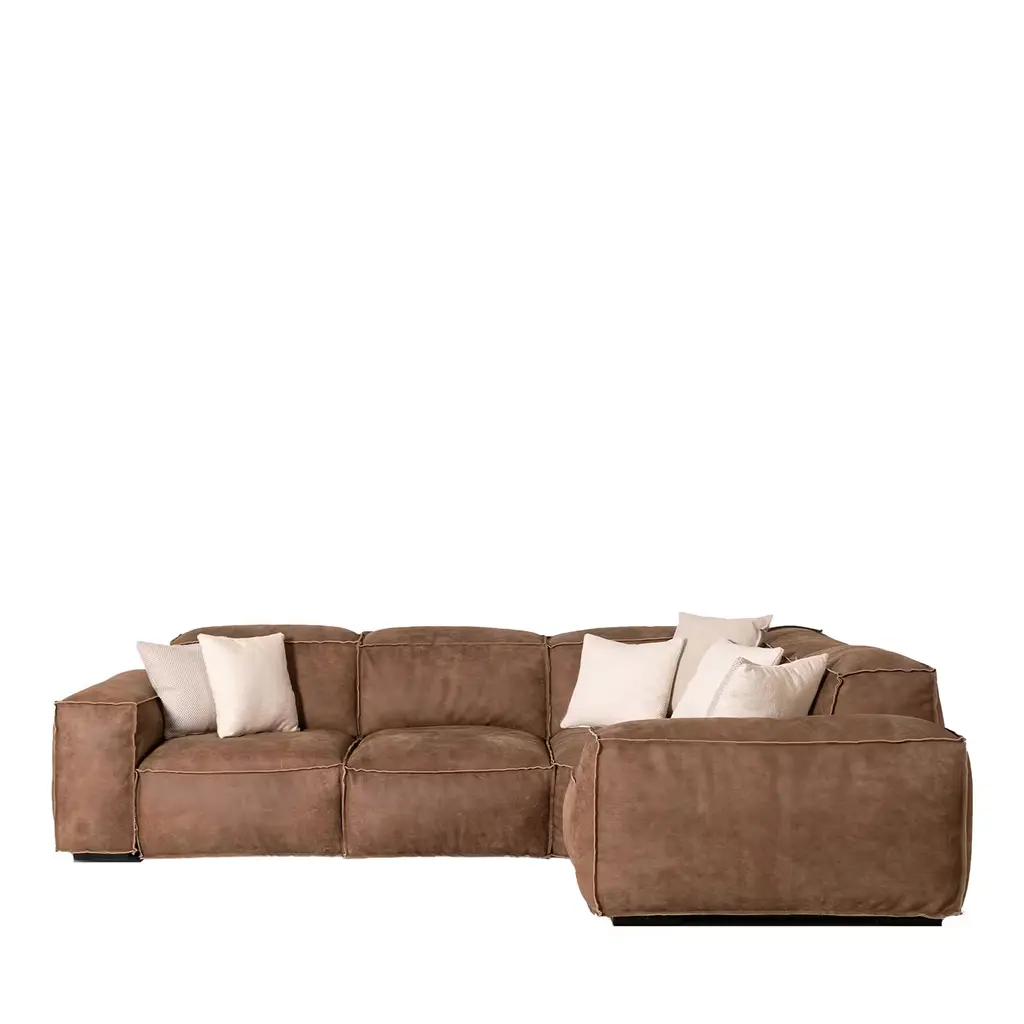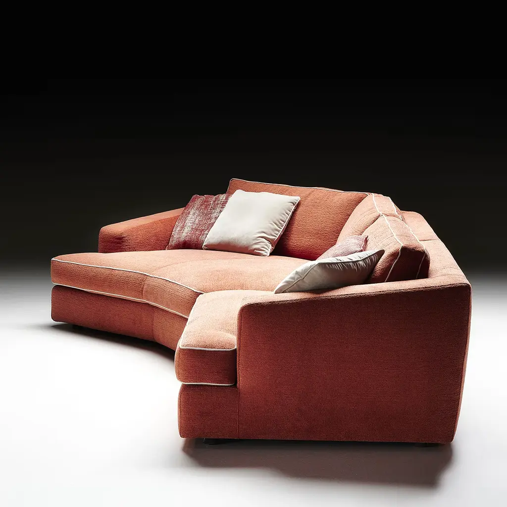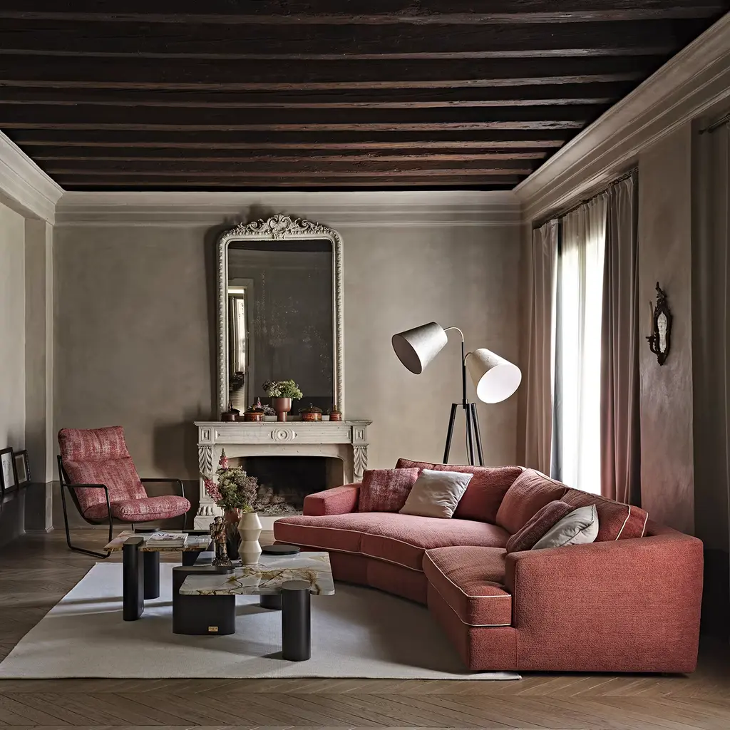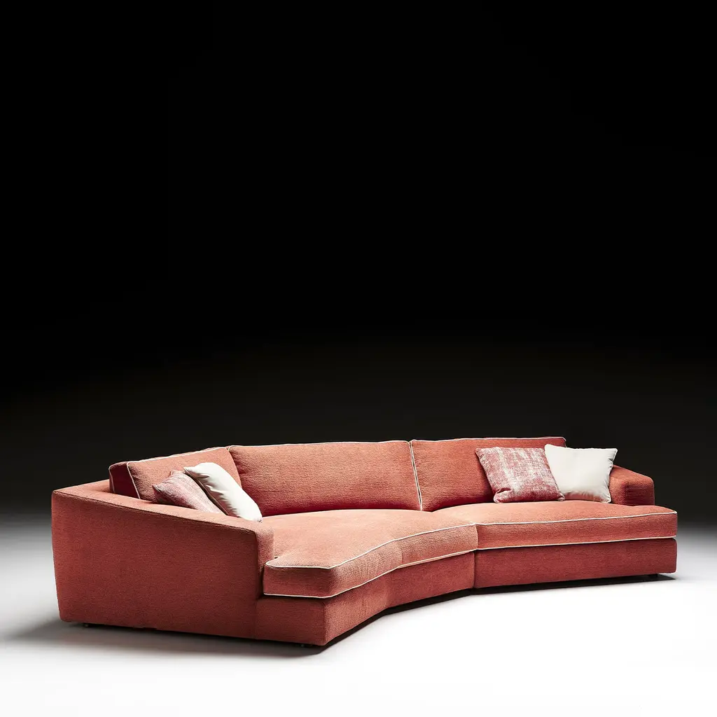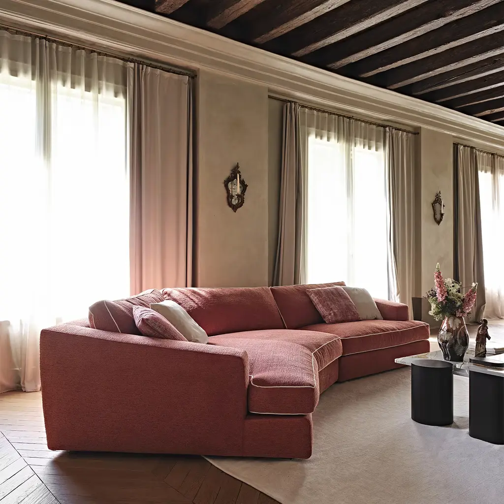 Subtly statuesque, this modular sofa is sure to take center stage in wide living areas thanks to its clean yet generous volumes sealed by removable red fabric upholstery. The fir and poplar frame is complemented by high-resilience polyurethane foam, which adds to ultra-soft back and seat cushions stuffed with European goose down with a central memory foam insert. A crossed elastic belt system completes the piece.
