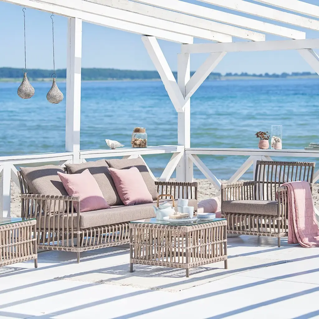 The Exterior collection is made from our signature AluRattan which consists of a strong aluminum frame woven with ArtFibre, allowing some of our most popular pieces to be used outdoors and to withstand all weather conditions. The Caroline Sofa can be found in natural rattan in our Originals collection, but its subtly tropical aesthetic makes it perfectly suited for use in a sun-filled spot on a terrace, deck, patio, or in a garden. The maintenance-free AluRattan material in the Exterior version makes this outdoor use possible.