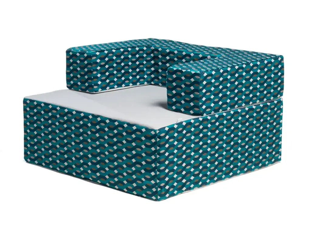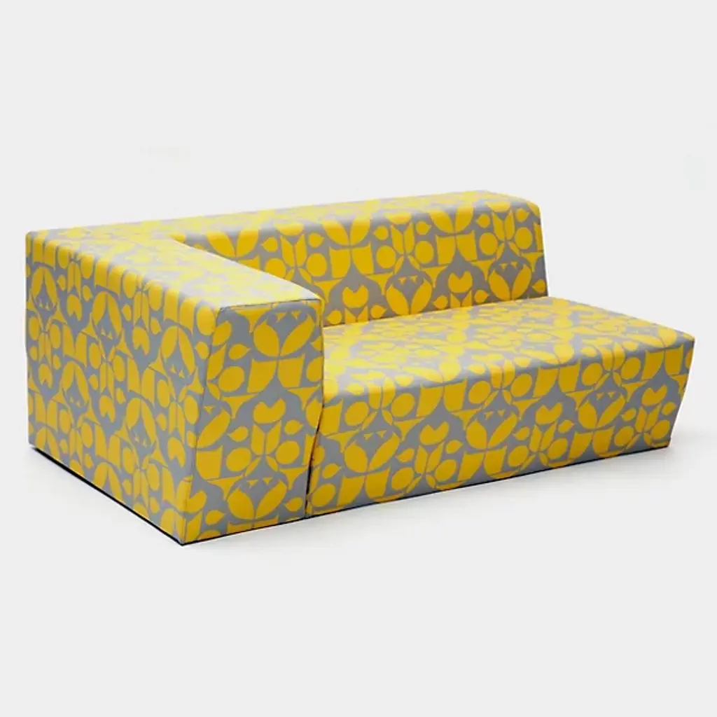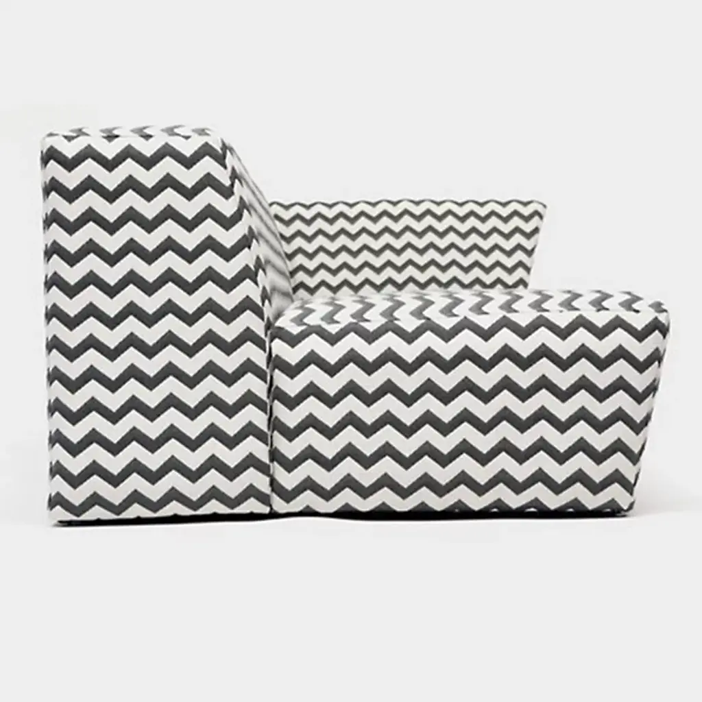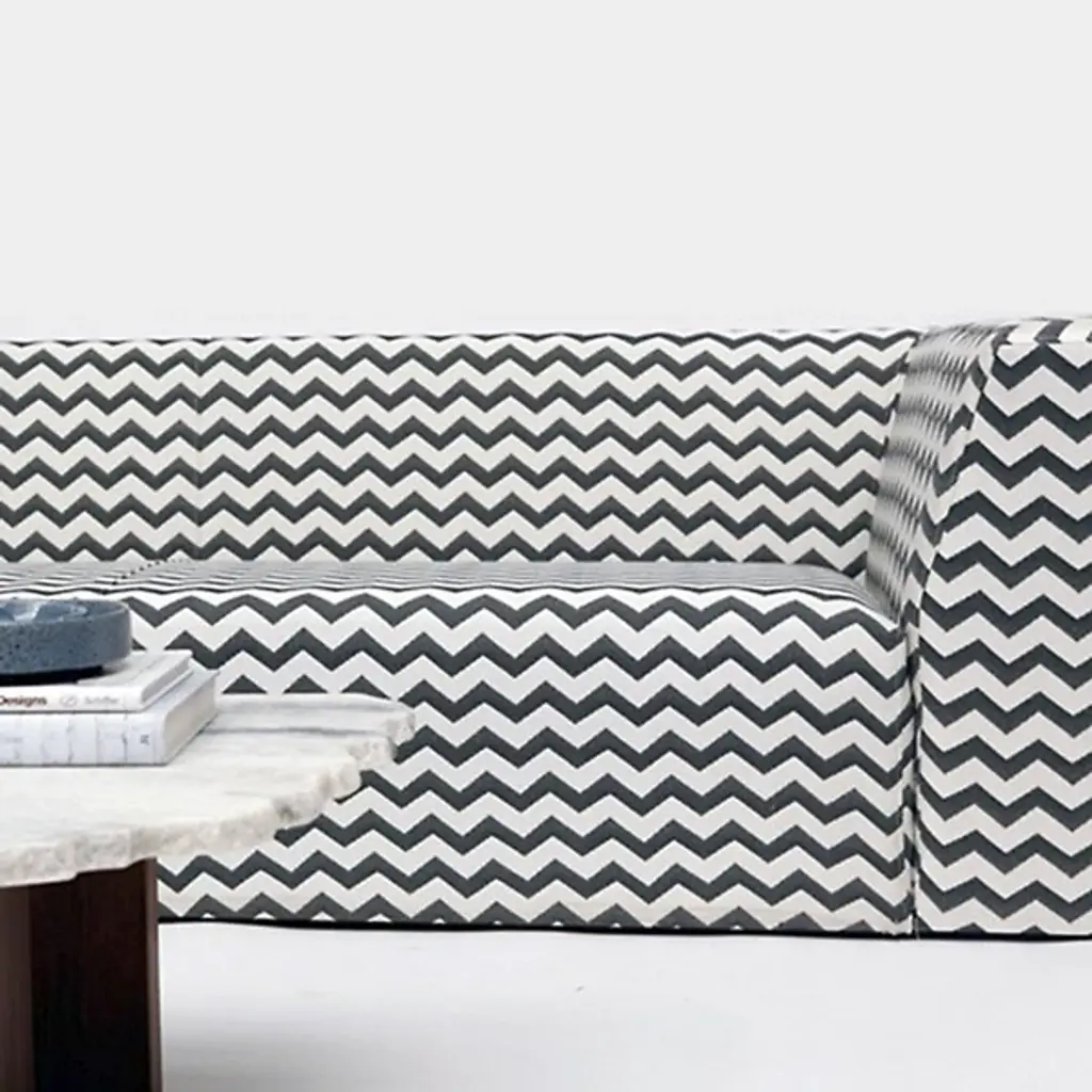 Made in Los Angeles by ARTLESS. Caroline Zig Zag Sofas, offered by Artless, was conceived as an archipelago of low, deep, cushioned volumes. These simple yet angular forms were designed with the utmost comfort in mind while the fabrics patterns and color would provide a burst of contrast to any environment. Not available in brown, taupe, mocha or even plain vanilla. Available in several different sizes and upholstery options. Also in the Caroline Ottoman , an option to make a complete set.