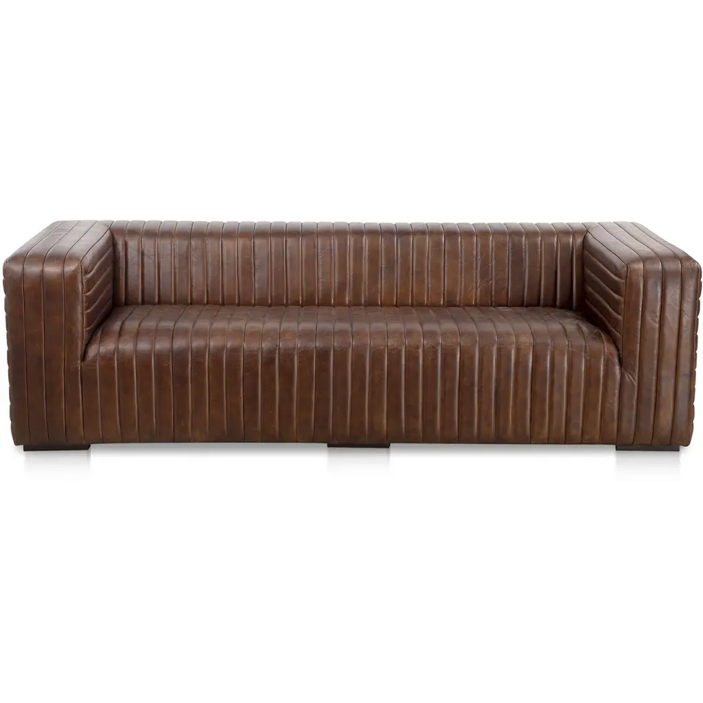 Decadent and deserving of a double-take, Castle is defined indulgence. Wrapped in premium, channel-stitched top-grain leather, Castle's foam with spring support cushioning sits firmly in a solid wood frame for a blocked, uncomplicated industrial style—stately, bold and versatile.