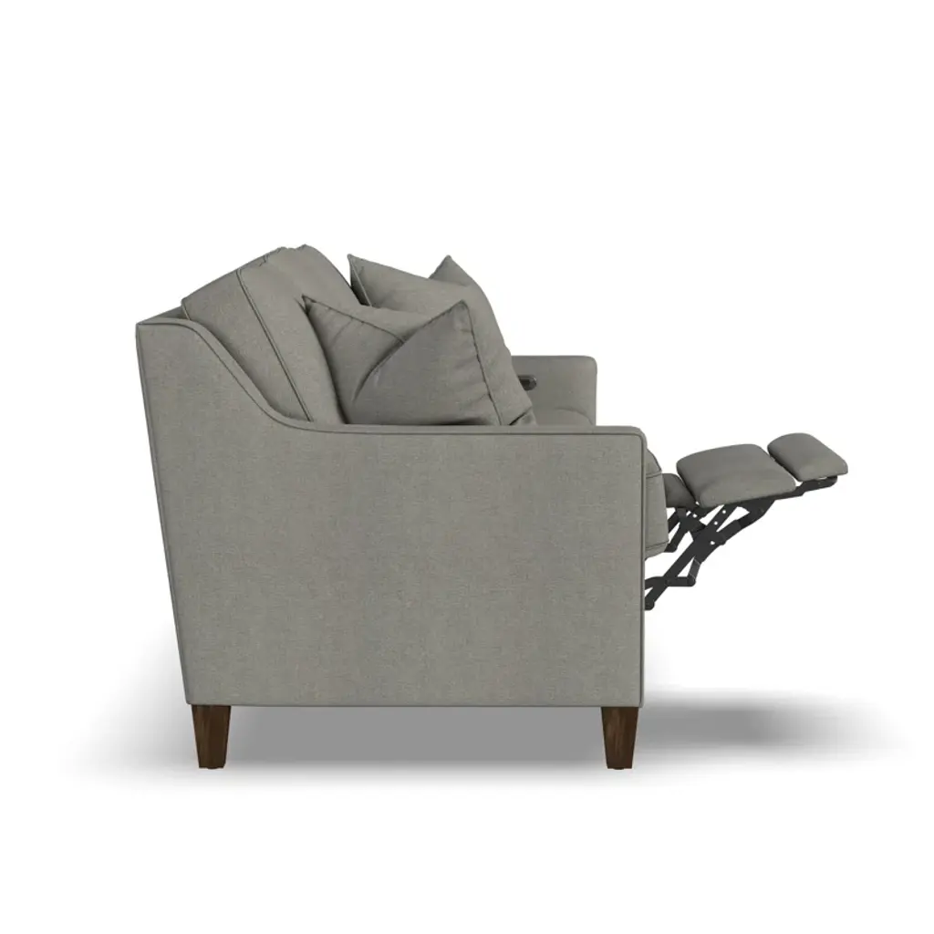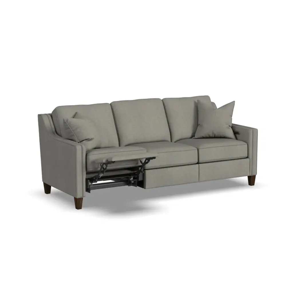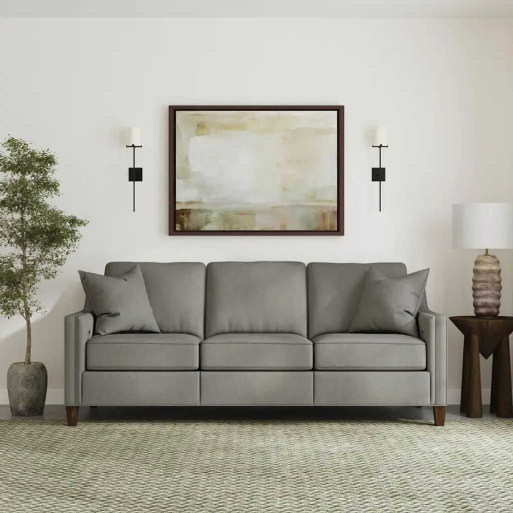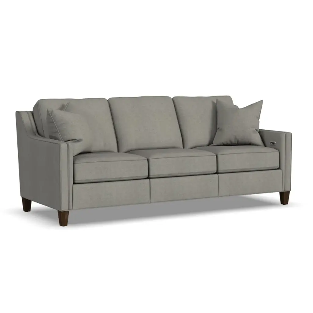 Simplicity and elegance meet ultimate comfort with the Caterina power inclining sofa. With a distinctive profile featuring sloped, tapered track arms and attractive welt detailing, Caterina has the look of a classic stationary sofa but offers the enhanced functionality of power incline for ease of relaxation. A hidden footrest extends for leg support, while our patented Blue Steel Spring technology creates a firm but flexible texture for support and comfort. With generous relaxation space, this frame sits on sleek, walnut, square-tapered legs and is expertly tailored in a comfortable polyester performance fabric.