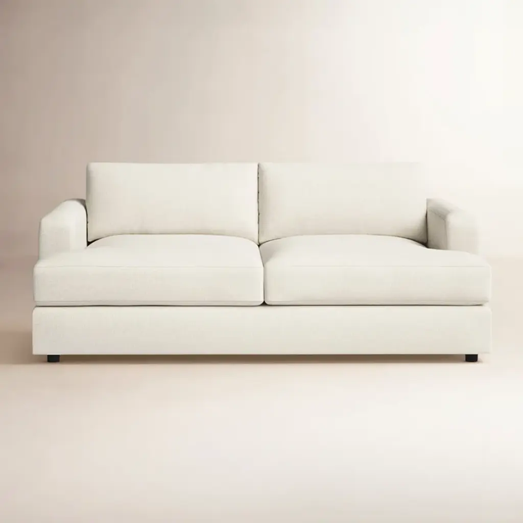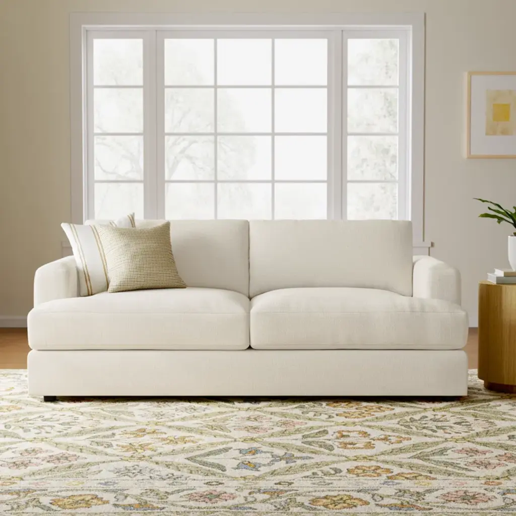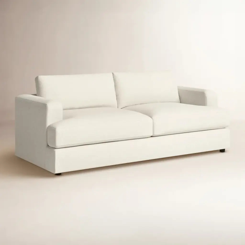 Traditional design. This 3-person sofa has a frame crafted from wood with recessed arms and a cushion back. Integrated sinuous springs padded with a foam-down blend fill ensure comfort and support. Select from a wide variety of upholstery fabrics and shades - from a bright canvas to a neutral linen - to compliment your decor. The flange edge adds a tailored touch.