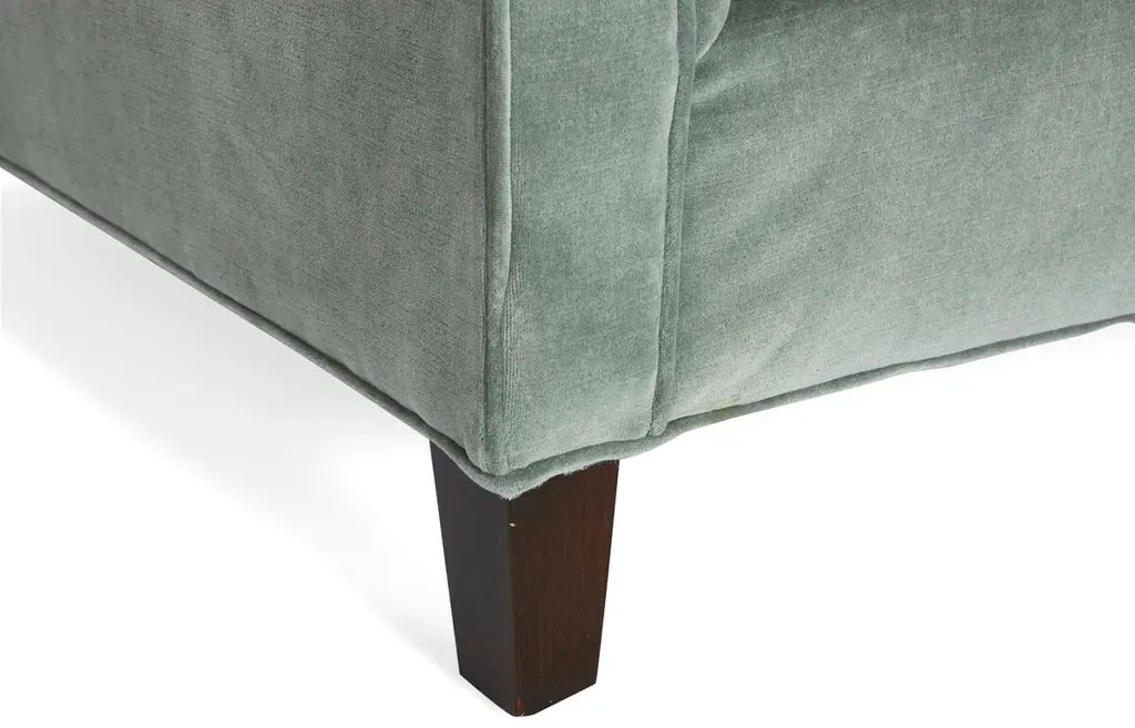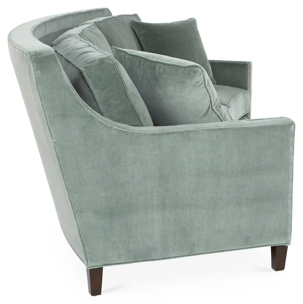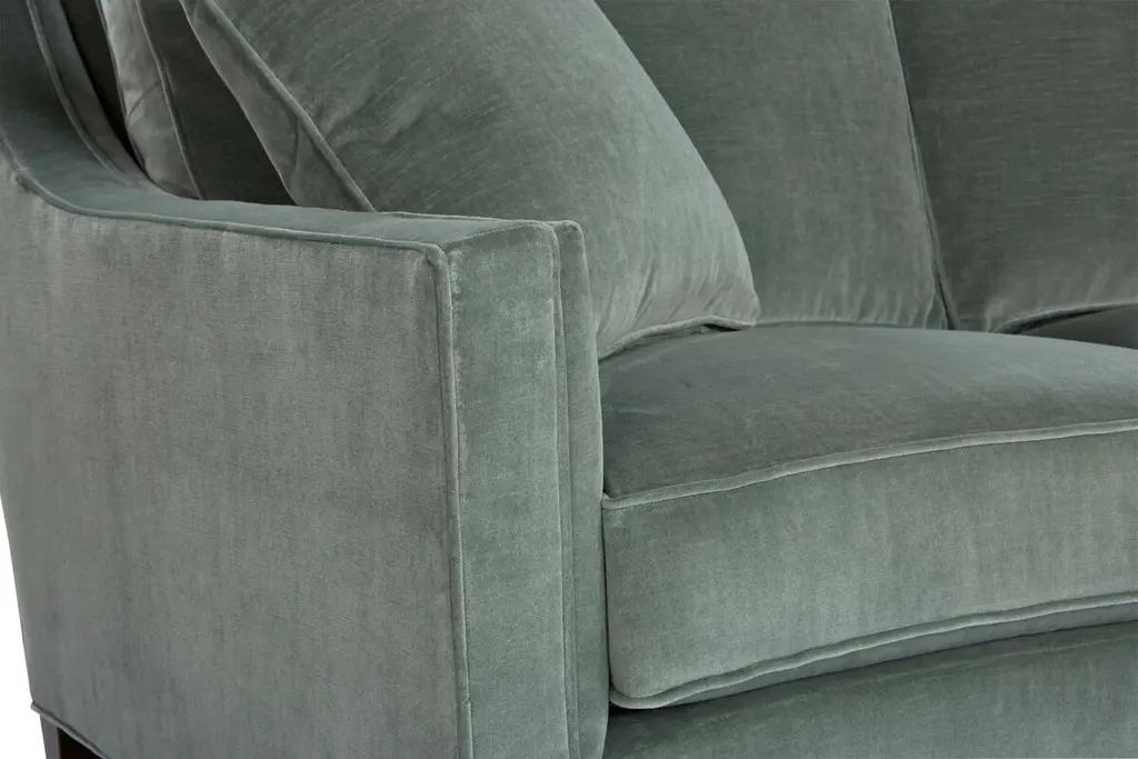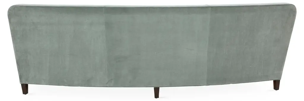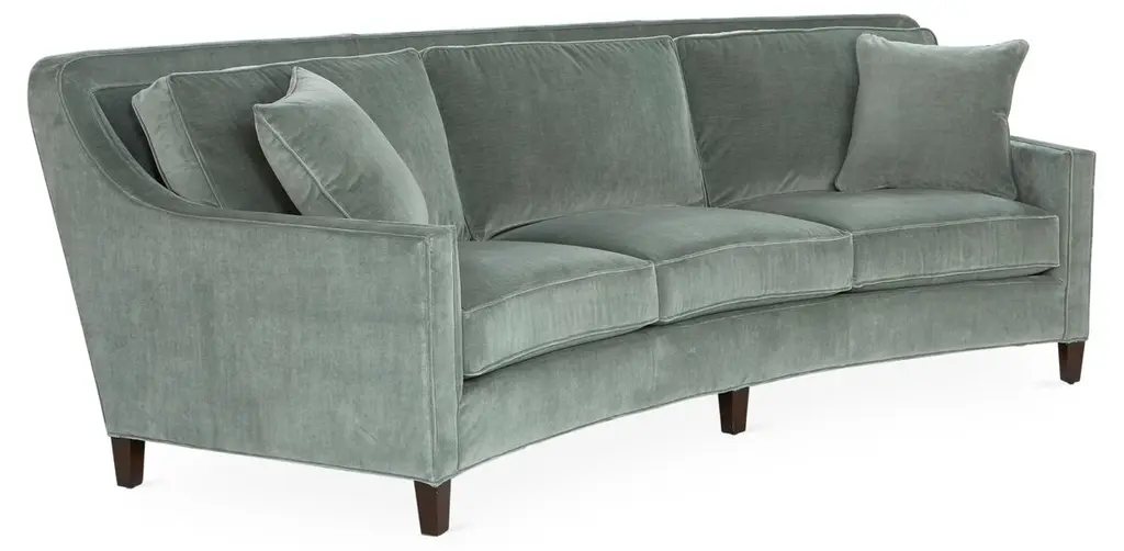Available online exclusively at One Kings Lane:Designed with a curvy seat back, swooping arms, and foam fill wrapped in a blanket of polyester and fiber, this luxe velvet sofa envelopes guests in comfort and style from all angles. Kiln-dried hardwood legs elevate the look for added strength and durability. Two matching throw pillows included. Handcrafted in the USA.