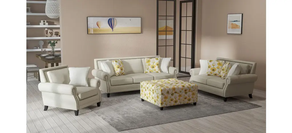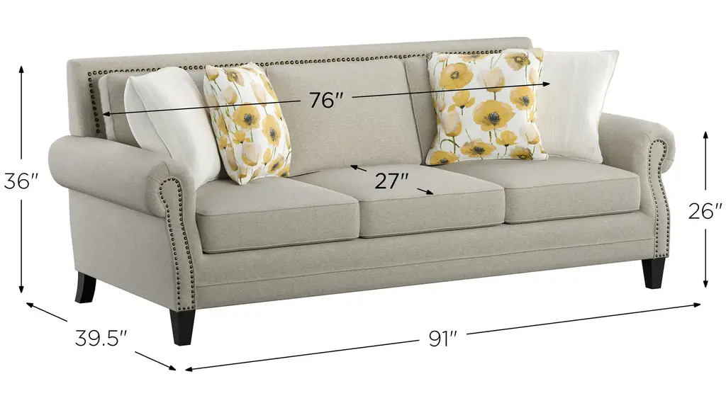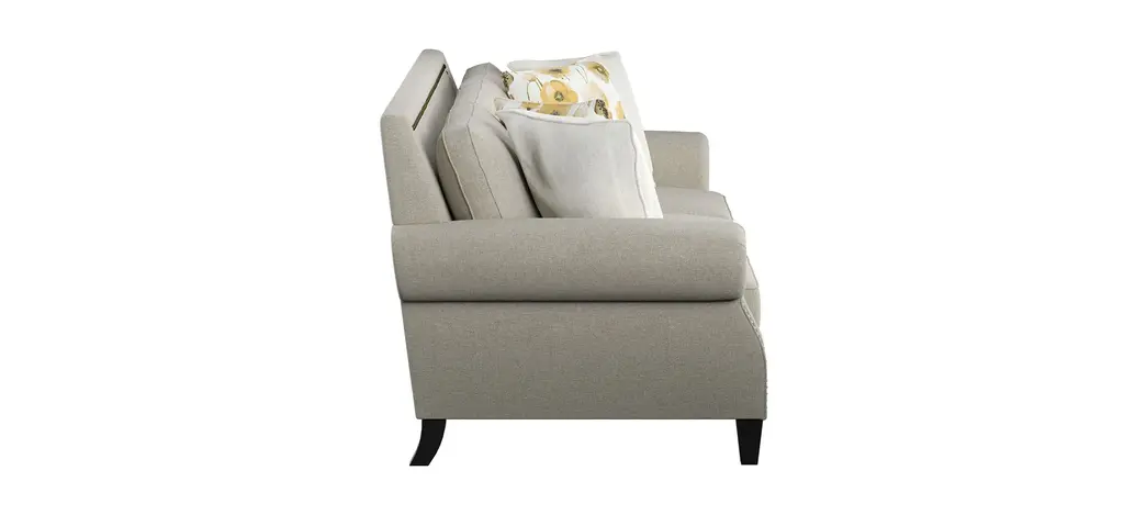 The Celia Saxon sofa livens up a traditional setting with a pop of color. The contrast of bronze nail head trim against beige fabric highlights the elegant shapes of rolled arms and tapered solid wood legs. With the warm hues of the golden poppy storage ottoman and accent pillows, Celia Saxon sofa proves that traditional is still stylish.