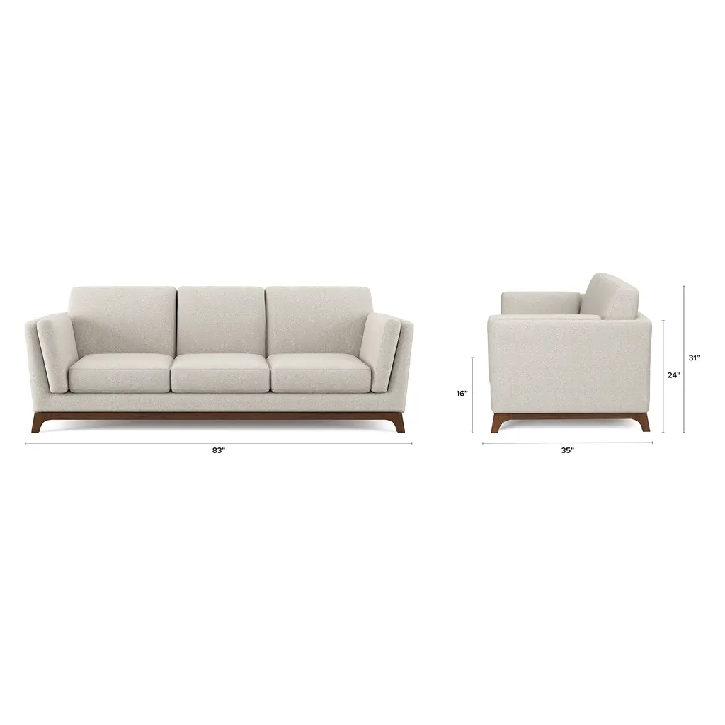 Take a load off. Intentionally designed to sit low to the ground, the Ceni Sofa is a contemporary take on a vintage silhouette. Designed with loose cushions, track arm rests, and a solid wood base, the Ceni features a firmly padded back cushion and medium-firm seat composed of sinuous springs and foam for a deep-seated lounge experience. A bit of bounce relaxes for increased comfort overtime.