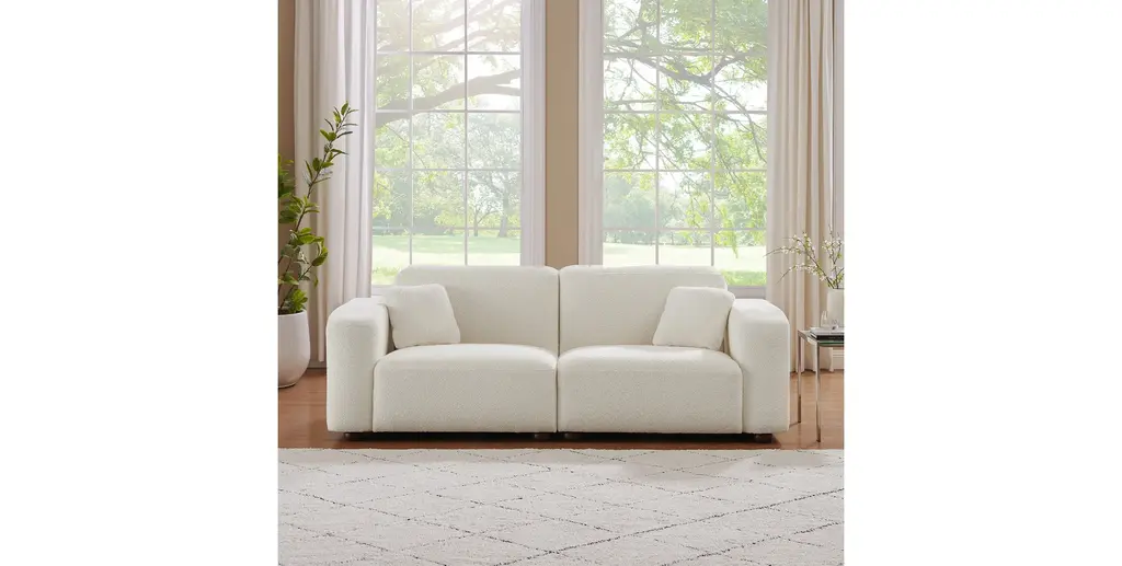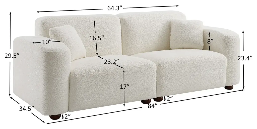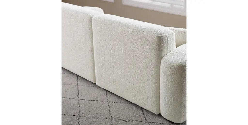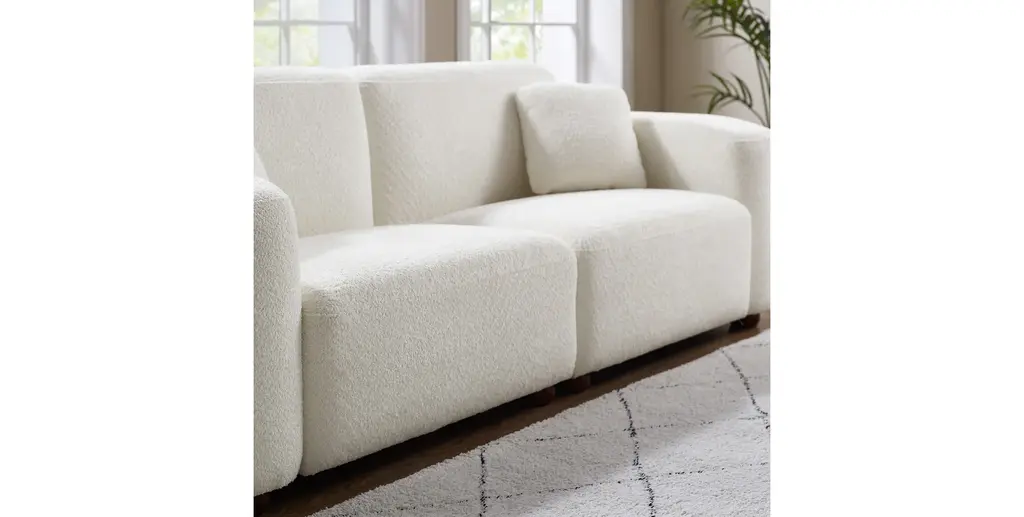 Earthy tones, environment-friendly materials, and playful, bulbous forms define this oyster faux shearling/ linen blend sofa a luxurious comfort where a tubular holds the sofa's soft cushions and gives the sofa a flowing look. The finite possibility of compositions makes this a personal modular sofa free to transform according to space.Solid timber and engineered hardwood bench-made frame with reinforced joinery.Hand-finished upholstery available in a variety of faux sheep skin.Seat and cushions are made with high-resiliency foams and high-gauge sinuous springs for support.10 Solid rubber wood chess legs lay on the bottom.Dye lots may vary depending on time of purchase.Comes in 2 Boxes