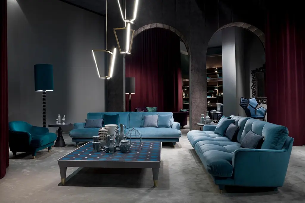Century Light Blue Quilted Sofa With Satin Brass Tips Covered With Velvet