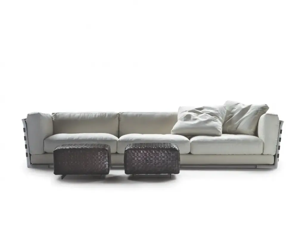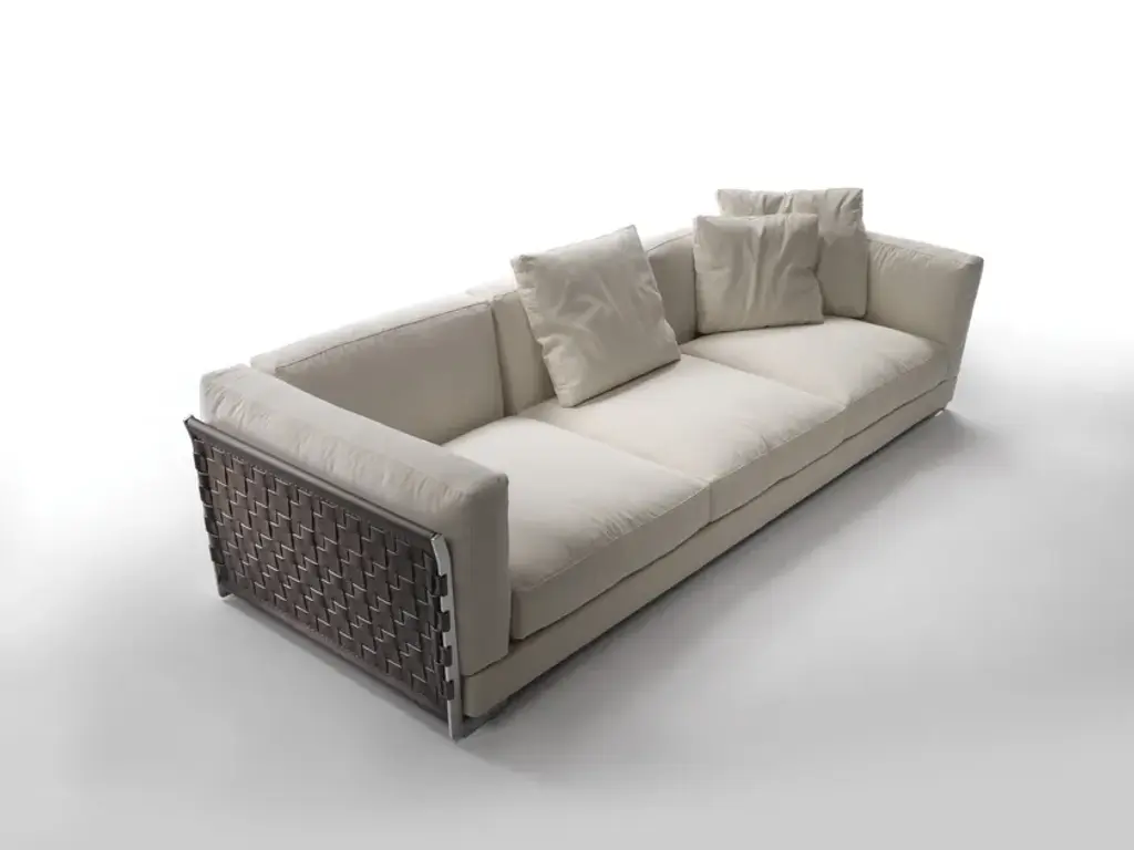 The Cestone 3-seater sofa was designed by Antonio Citterio for Flexform in 2008. The designer focused in particular on the back and sides of the sofa, both made of a metal frame covered in woven leather with a damier pattern, contrasting with the seat elements, which are upholstered and soft.The great attention to the sofa's back is instead the feature that makes it ideal for placement in the centre of the room: the upholstery can be in woven leather, made with two different weaves and thicknesses of leather strips. The metal frame can have a satin, chrome, burnished, champagne-coloured or black chrome finish, while the leather is available in many colours, white, black, grey, Bulgarian red and different shades of brown; a suede version is also available. You can also opt for an upholstered fabric version.The base is made of painted metal and solid wood, with a polyurethane foam padding covered with a protective fabric cover. The back cushions are made of sterilised and certified goose down, with an insert of non-deformable material, so that the correct shape is maintained for a long time.The Cestone sofa was designed to be placed at the center of the living room. In the spotlight are the sofa’s back and sides, parts that cannot usually be counted on to bring added value. Instead, the back and sides of the Cestone sofa are made up of a metal structure upholstered with woven strips of cowhide. Two options of the irregular woven pattern, with strips in two different widths, are available. The cowhide strips can be closely woven, forming a compact surface; or more loosely woven, allowing the underlying upholstery fabric to show through. The resulting ‘checkerboard’ pattern makes a strong visual statement in aesthetically pleasing contrast to the soft, perfectly-proportioned upholstered parts. The Cestone sofa can be paired with its eponymous coffee tables, with top in Canaletto walnut or ash, in a broad range of stains that create a delightful textural contrast with the warmth of the cowhide.TECHNICAL SPECIFICATIONSBackrest and armrest with satined, chromed, burnished, champagne or black chromed metal and hide leather panels: russian red (5008), white (5007), olive (5006), black (5005), dark brown (5004), dark brown extra (5013), grey (5003), sand (5001), tobacco (5015). also available in black suede (6005), dark brown suede (6004), olive suede (6003), sand suede (6001). Seat frame in metal and wood with polyurethane padding covered with protective fabric lining and metal joint elements. Base metal frame epoxy powder coated Backrest, armrest and seat cushions filled with down and resilient inner core. Throw pillows down-filled on request with upcharge Upholstery removable fabric or leather covers. On request with upcharge leather armrest/backrest with close mesh net, or full panel in hide leather russian red (5008), white (5007), olive (5006), black (5005), dark brown (5004), dark brown extra (5013), grey (5003), sand (5001), tobacco (5015). also available in black suede (6005), dark brown suede (6004), olive suede (6003), sand suede (6001)MATERIALS Frame: hide leather - suede - metal finishes Upholstery: cashmere - cotton - leather - nabuk - linen - mixed composition - velvet