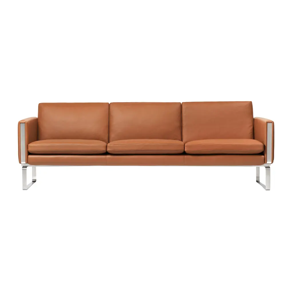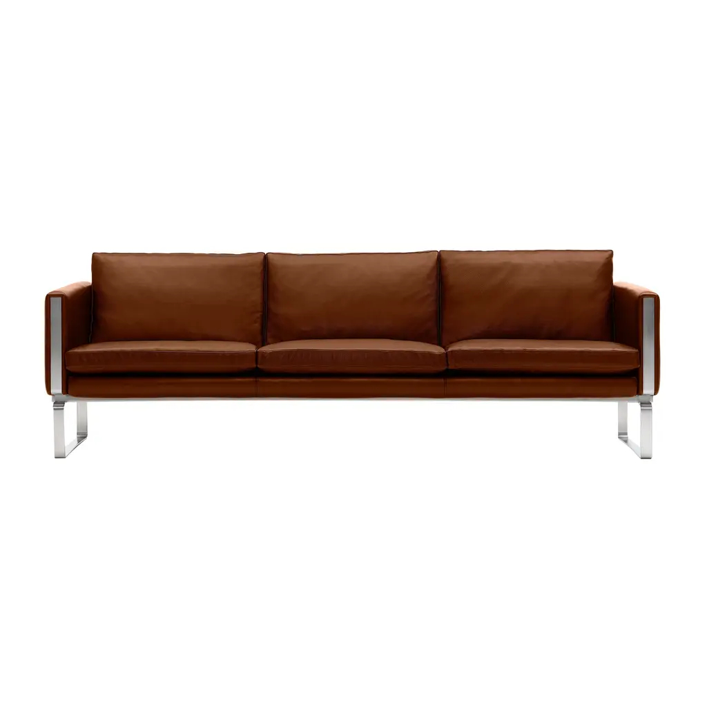 Modern luxury doesn't get any better than Hans J. Wegner's series of sublime leather-clad sofas with gleaming stainless steel appointments. Available in 2, 3 and 4-seater models, the seating is faultlessly handmade over a beechwood frame and features fully upholstered turnable cushions fashioned from a foam core surrounded by European down and cold foam. Ever timeless, Wegner's design from 1970 was reintroduced in 2008 for the 100th anniversary of the founding of Carl Hansen & Søn..