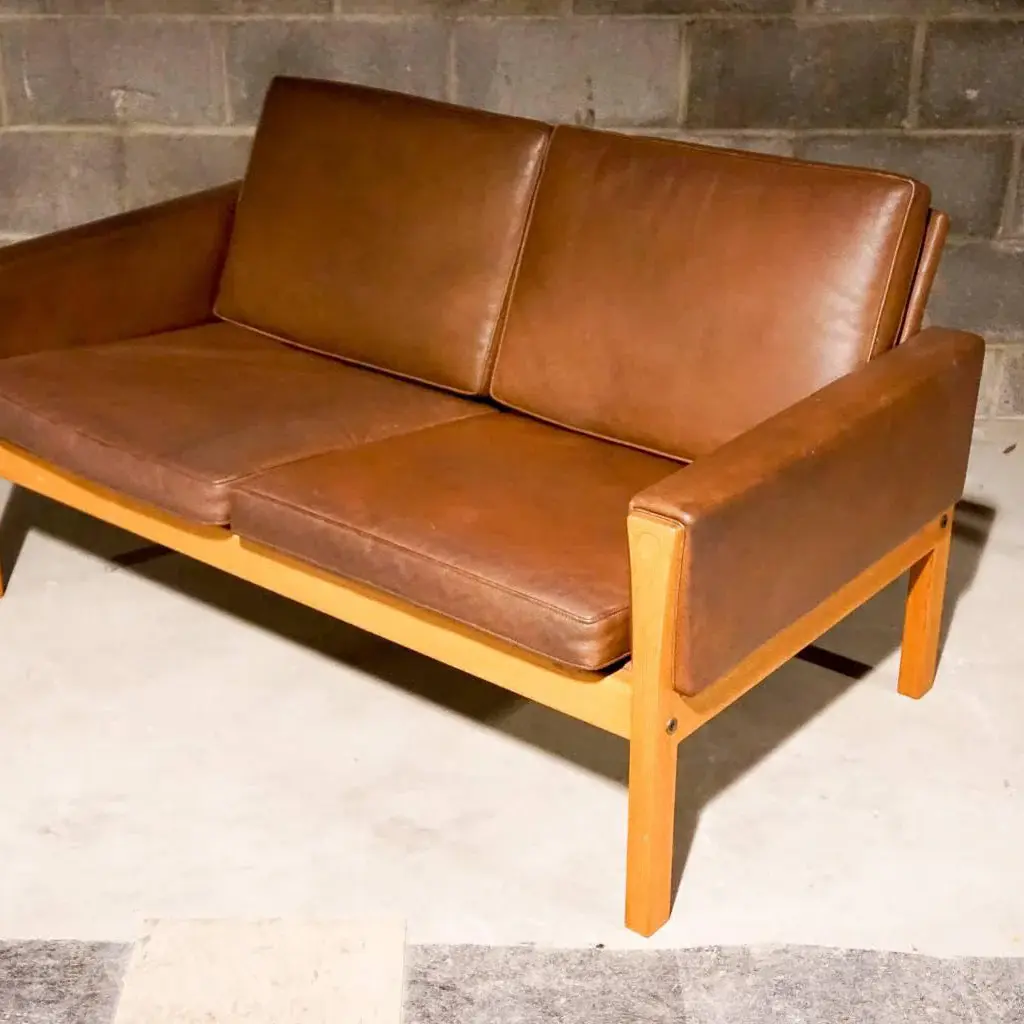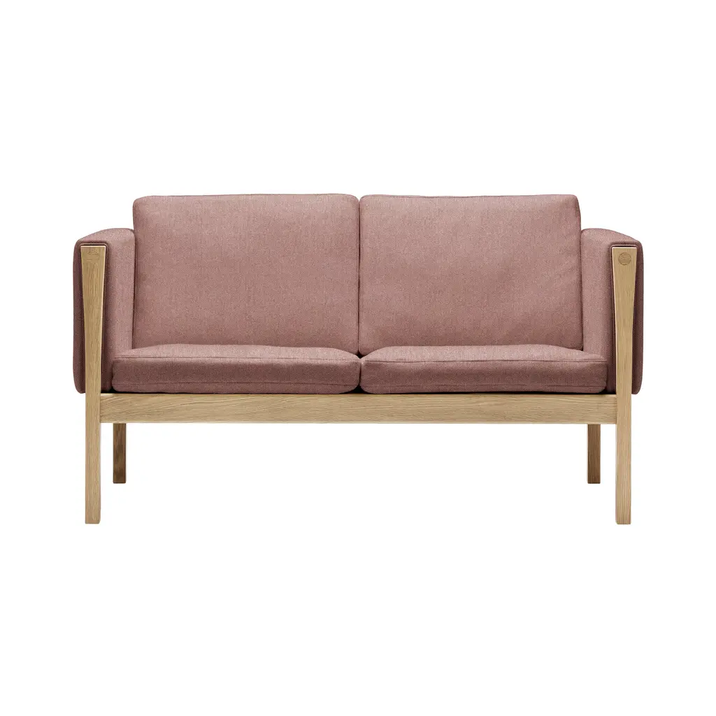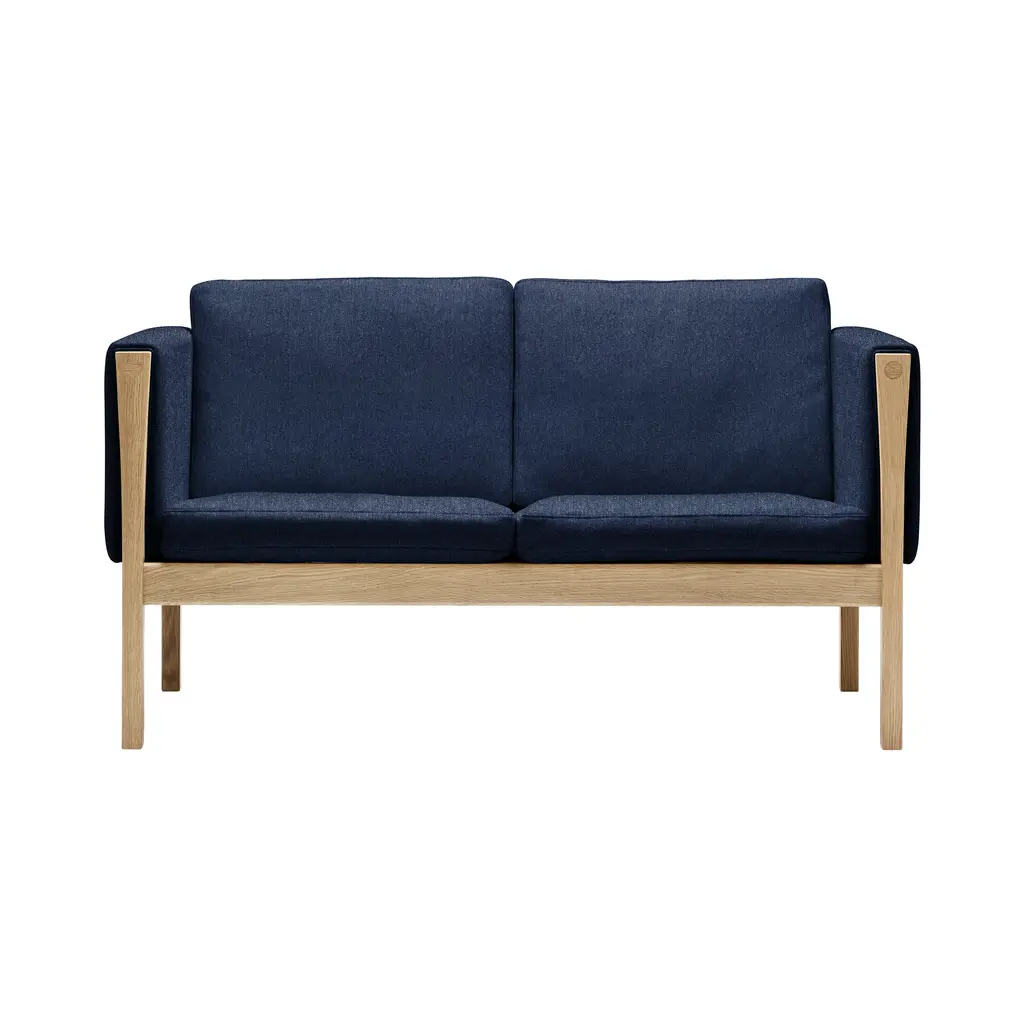 The 2-seater CH162 is built upon a solid oak or walnut frame, its vertical and horizontal lines softened by upholstered cushions made of a foam core surrounded by European down and cold foam. Hans J. Wegner's innovative design merged satisfying comfort with his characteristic emphasis on making structural elements visible, down to the enlarged wooden plugs in the armrests—concealing construction screws while bringing attention to the seating's clean, elegant shape.