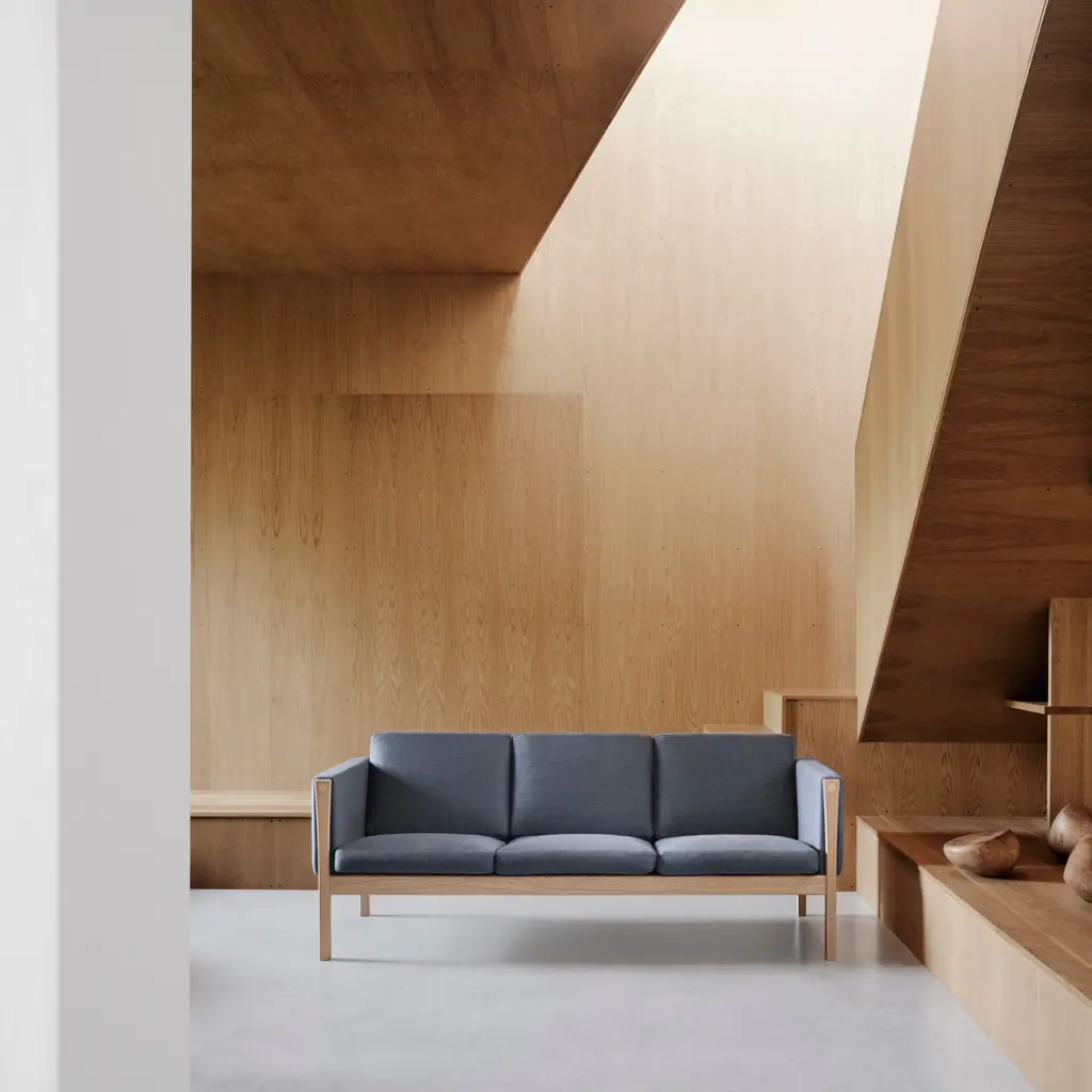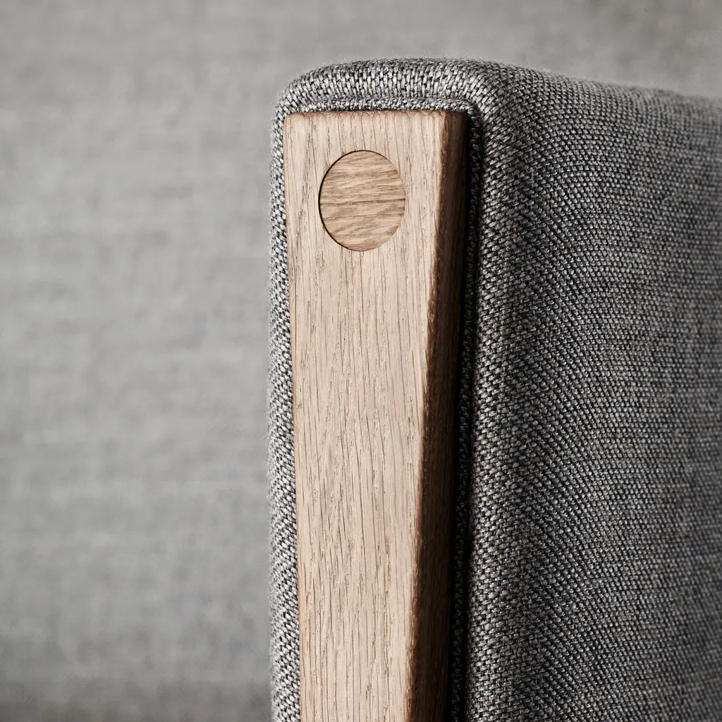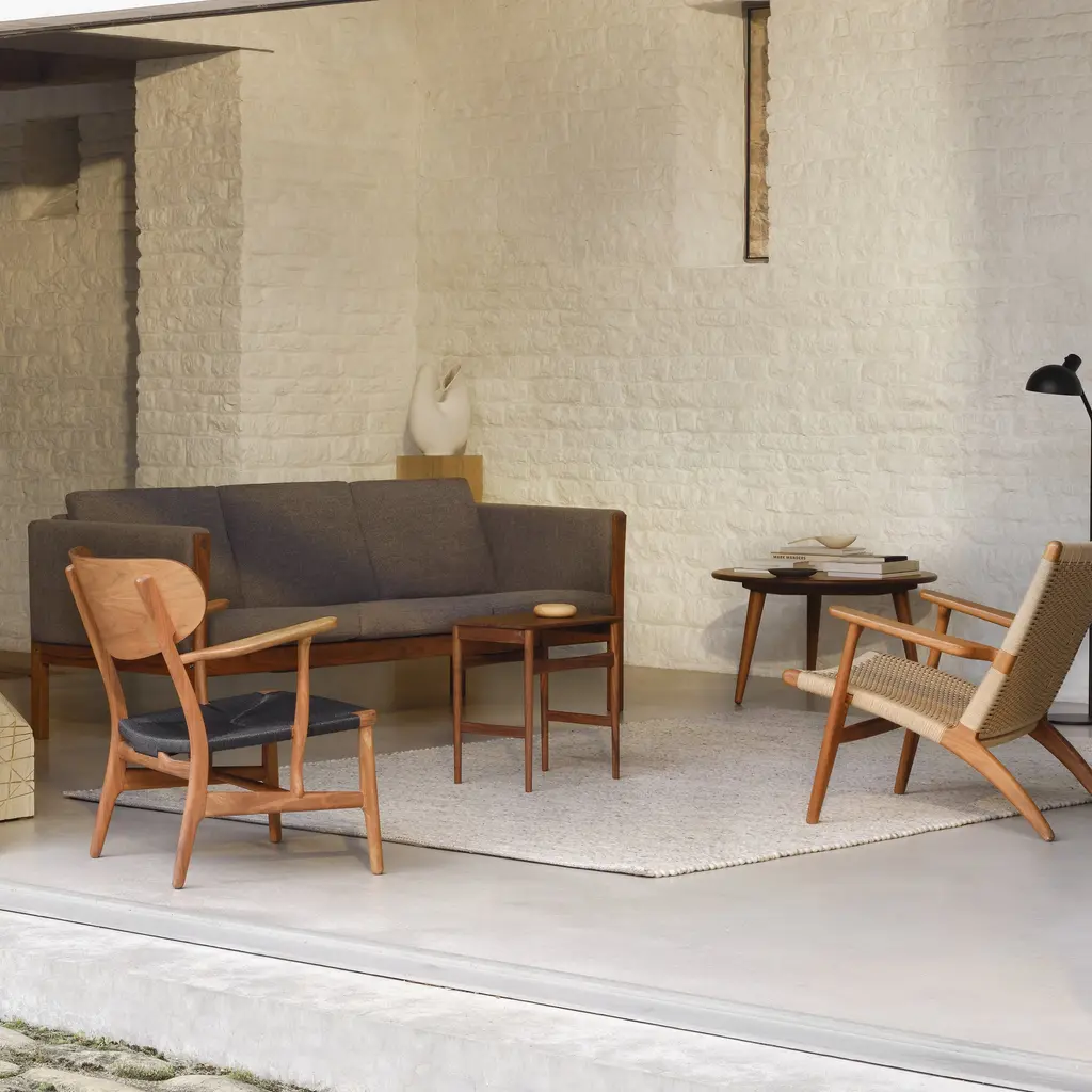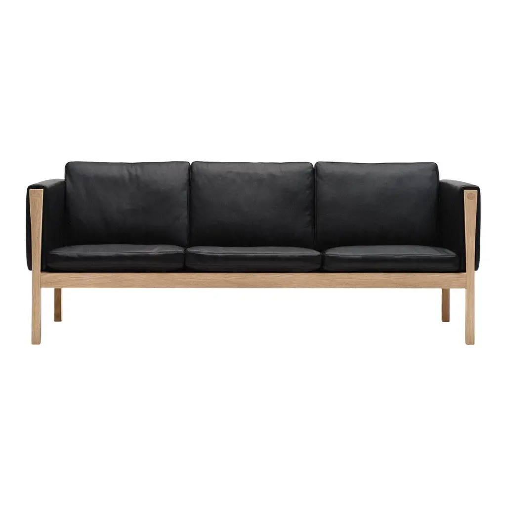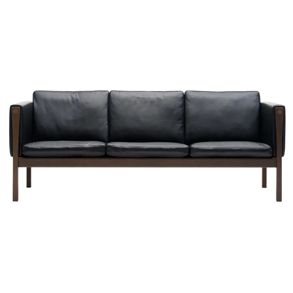 With its solid oak or walnut frame softened by upholstered cushions, Carl Hansen & Søn offers a 3-seater version in CH163. Designer Hans J. Wegner's innovative seating made with a foam core surrounded by European down and cold foam delivers both extended comfort and a pleasingly clean-lined silhouette. In his characteristic manner, structural elements are hinted at in the enlarged wooden plugs in the armrests that hide construction screws and provide a refined punctuation point.