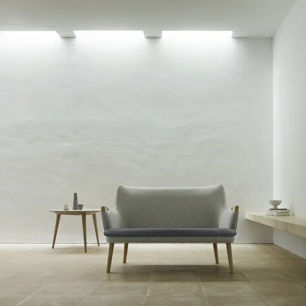 The CH72 Sofa is characterized by a slim, fully upholstered frame, loose cushions, and round, tapered legs in solid wood.