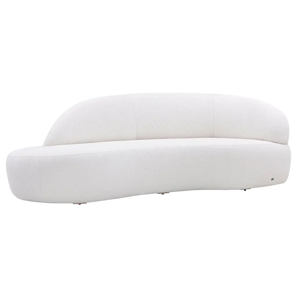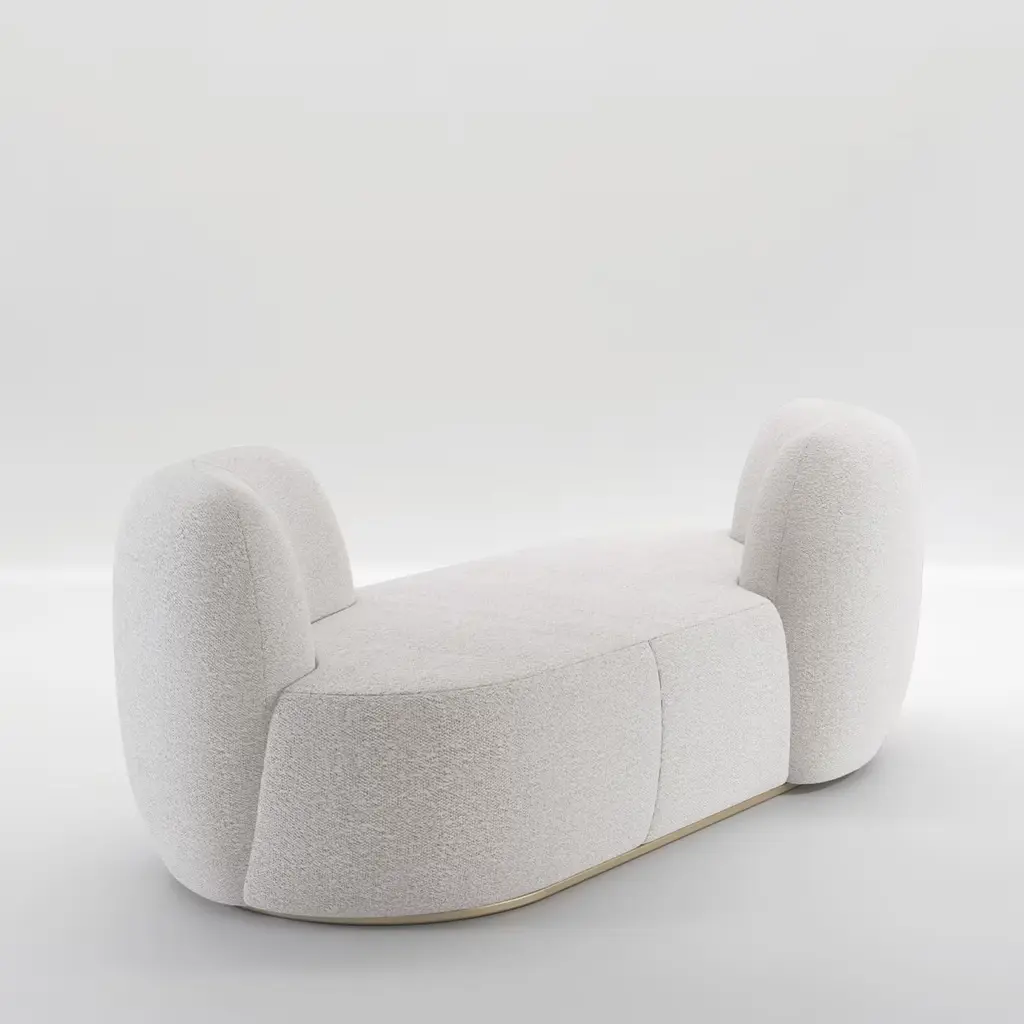 The Chapter Two Love Seat by Artefatto Design Studio features soft curves, offering comfort from both sides with its two identical backs. It is upholstered in Special Bouclé Pearl Bush fabric, providing a luxurious texture, while the base boasts a Satin Brass metallic effect, adding a touch of elegance. Chapter Two combines style and functionality for any modern setting.