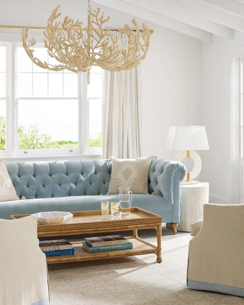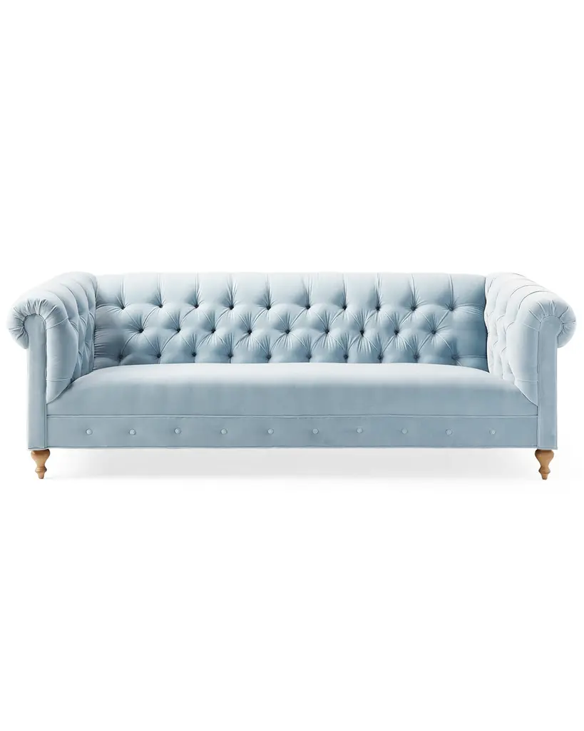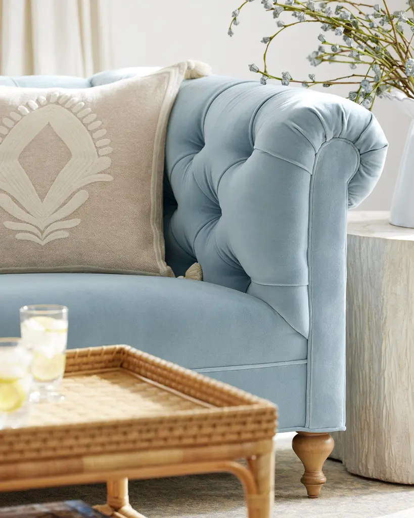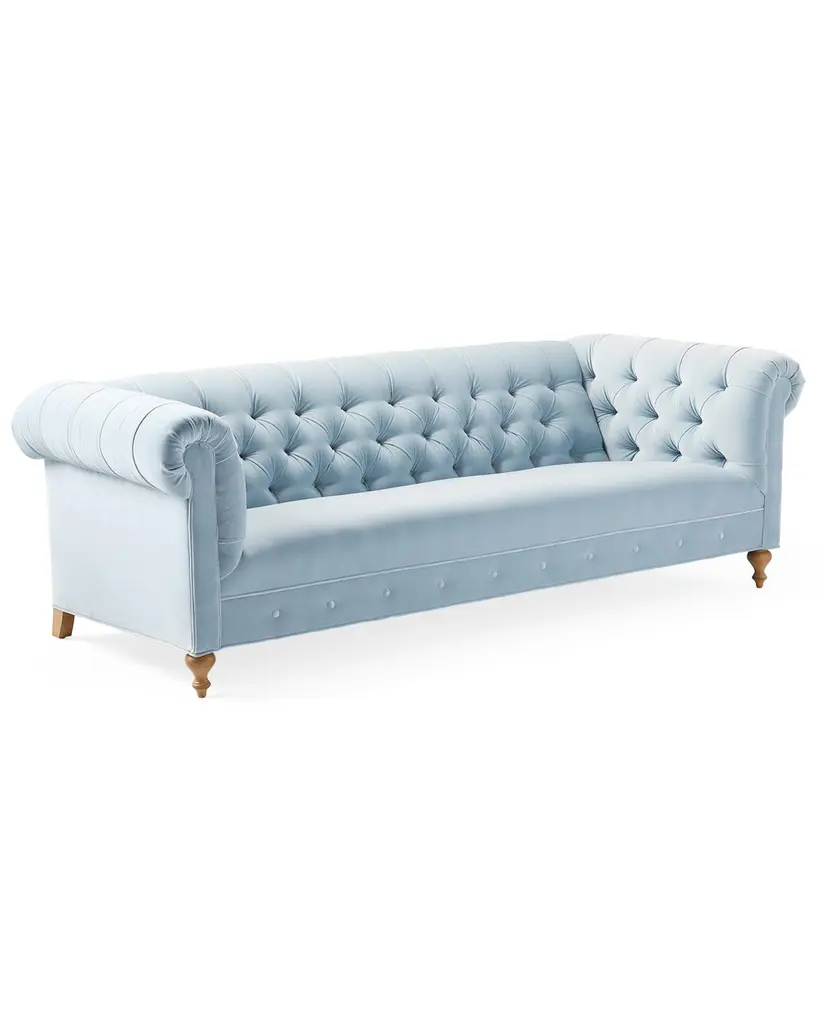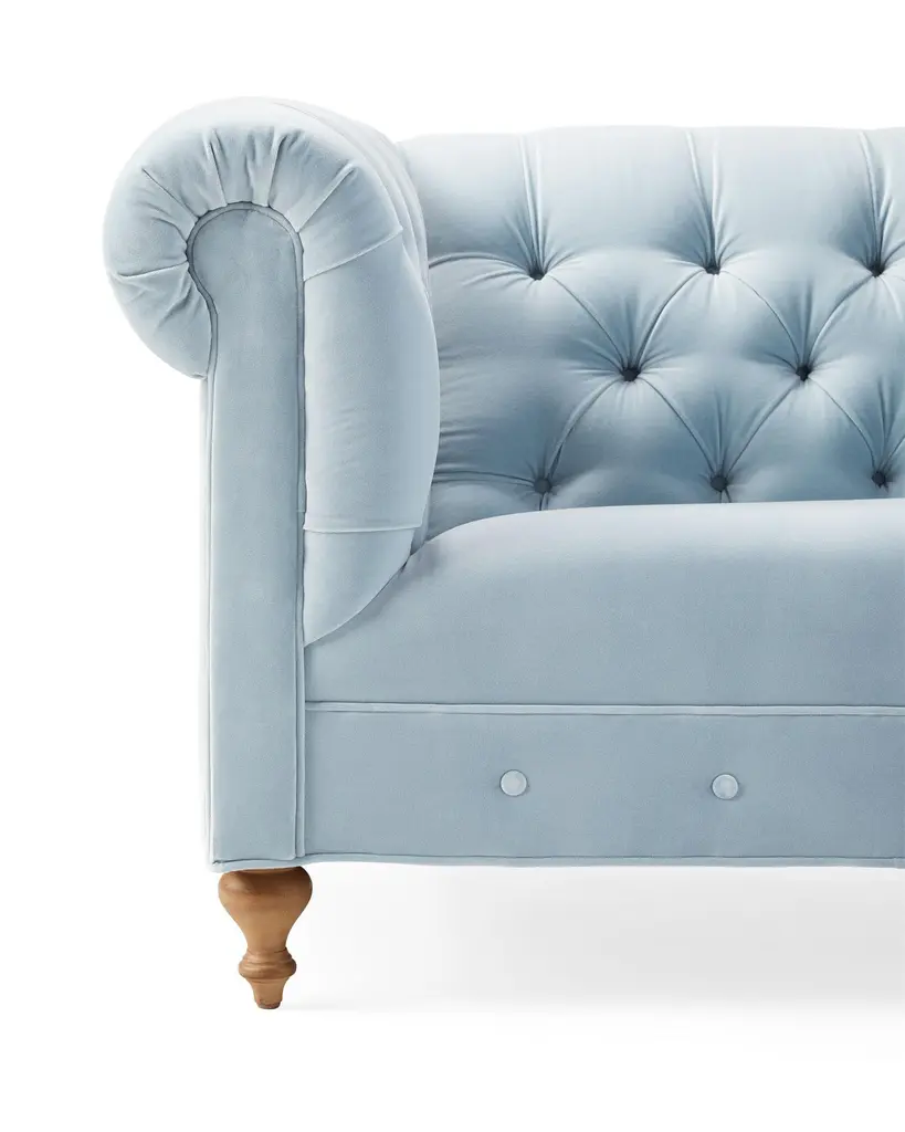 A nod to the classic Chesterfield, masterly crafted inside and out. Wistful curves, button tufting, and wood-turned legs in a lustrous cotton velvet.