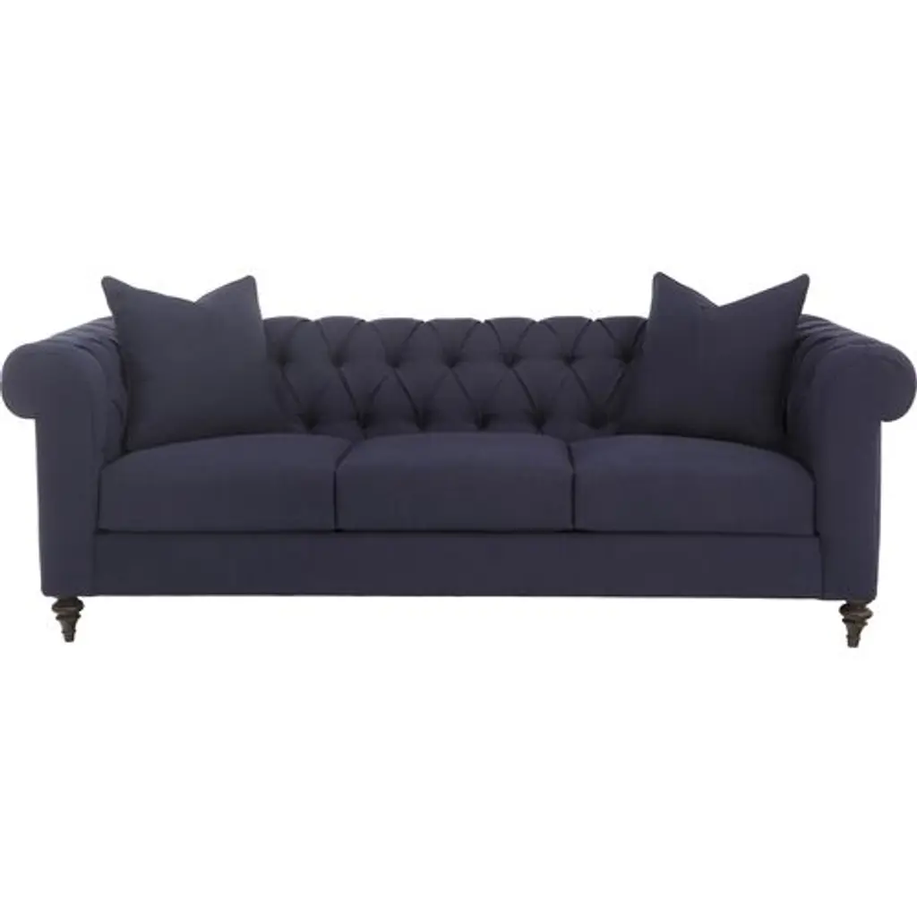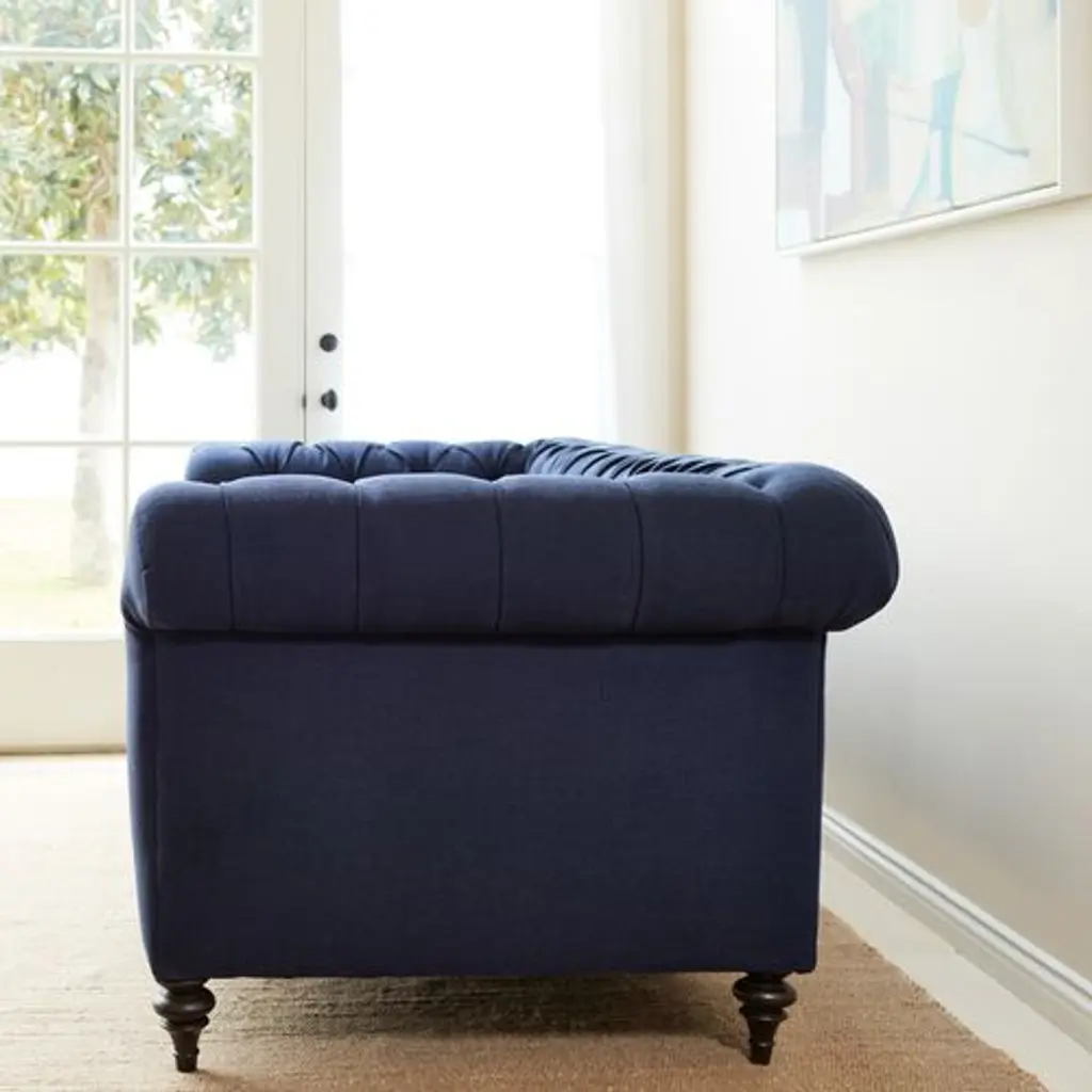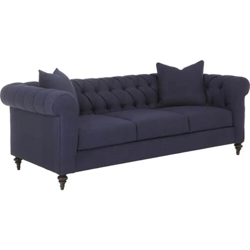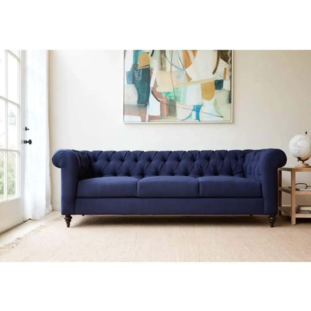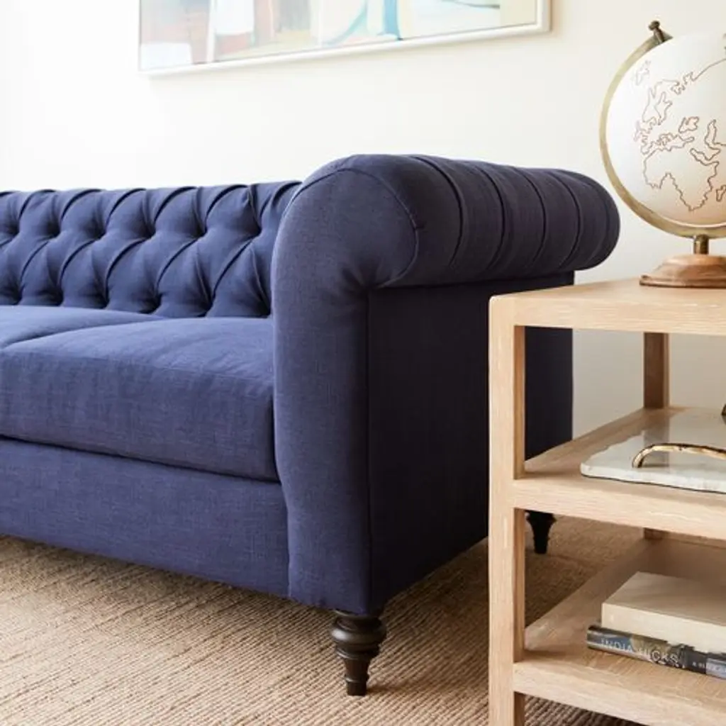 Designed by us and available only at One Kings Lane: With their prominent rolled arms and diamond tufting, chesterfield sofas instantly add timeless elegance to a room. This one brings exceptional comfort too, thanks to extra high-resilience foam cushion fill wrapped in plush down.Also of note: • The upholstery looks like Belgian linen, but it’s water-repellent and stain-resistant, making it practical even for households with kids, pets, or spill-prone adults. • The frame is made with kiln-dried hardwood to withstand years of use. • The turned wood legs add to the overall sophistication.• Comes with two 22” square pillows.Fabric swatches: To receive a complimentary fabric swatch, email <a href="mailto:interiordesign@onekingslane.com">interiordesign@onekingslane.com</a> with your name, mailing address, and phone number as well as the product SKU and the fabric name (limit: 3 swatches).