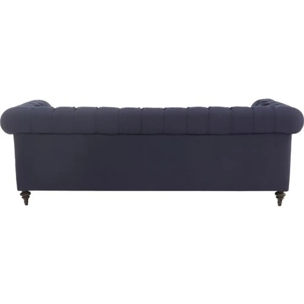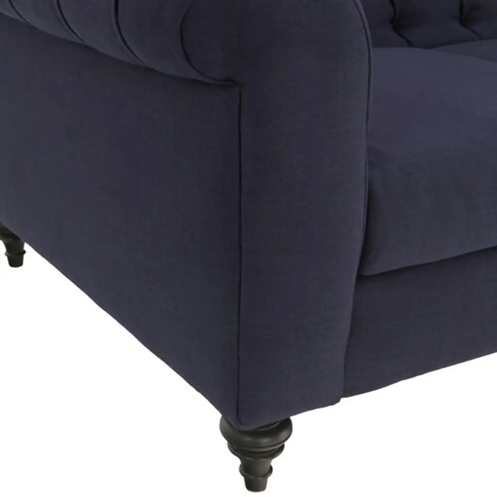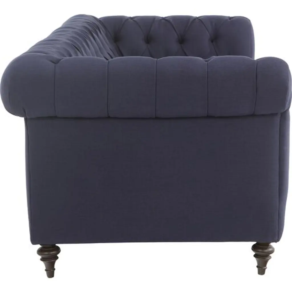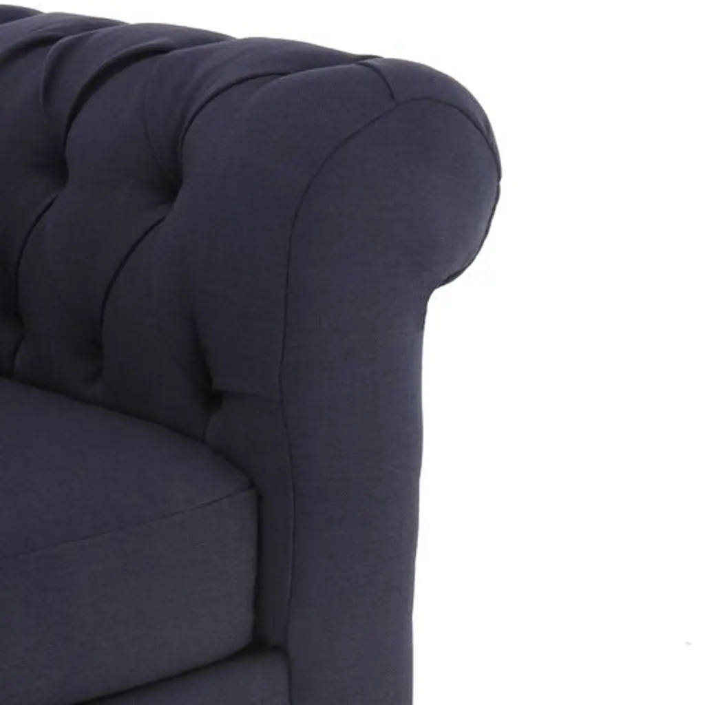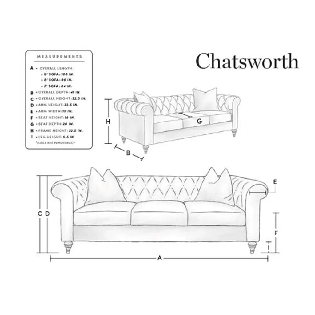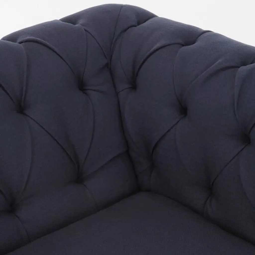 Designed by us and available only at One Kings Lane: With their prominent rolled arms and diamond tufting, chesterfield sofas instantly add timeless elegance to a room. This one brings exceptional comfort too, thanks to extra high-resilience foam cushion fill wrapped in plush down.Also of note: • The upholstery looks like Belgian linen, but it’s water-repellent and stain-resistant, making it practical even for households with kids, pets, or spill-prone adults. • The frame is made with kiln-dried hardwood to withstand years of use. • The turned wood legs add to the overall sophistication.• Comes with two 22” square pillows.Fabric swatches: To receive a complimentary fabric swatch, email <a href="mailto:interiordesign@onekingslane.com">interiordesign@onekingslane.com</a> with your name, mailing address, and phone number as well as the product SKU and the fabric name (limit: 3 swatches).