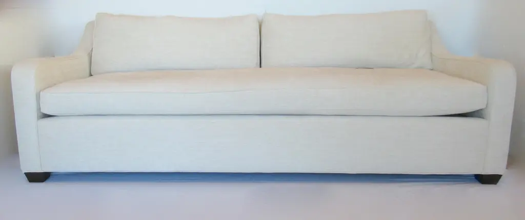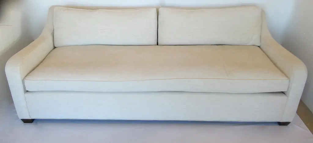 C.2015: Custom made Stark Sofa, with sloped arms. A down and feather inserts, 2 seat-back cushions, with one full seat cushion, ALSO down and feather, with brown mahogany finish to feet. This timeless shaped sofa has been upholstered in a "To the Trade textile by Kravet, a gorgeous chenille which is cotton, silk, rayon and viscose, and has been-knit-backed for durability to form. All down and feather seat back,(2 cushions and one full seat cushion. Self welted details throughout. There are 2 of these lovely, casual and sophisticated, yet refined sofas. with simplicity, and panache. Each SOLD SEPARATELY. From a Living Estate, Palm Beach Island, Florida. They were re-upholstered up and before Florida Install 3 4 rs ago. ** WE slotted a photo of what the room looks like with both the sofa's to gage size conformity to a space, which has 3 distinctive sititing/living room/family room/cocktail area for entertaining, in a successive order and adjacent to one another, which makes for a larger entertaining area for many, NOT including the wonderful, Blue Chip Art and Decorative pieces within the image.** The beauty of ready to go and ship, with NO TARIFFS is tantamount to one's timeline/install dates, and that also goes to Interior Designer's with that in mind, or New Hme Buyer's and existing. Main Dimensions: 93.50"W x40"D x 31.50"H. Arm Height: 24.50"H. Seat Height: 21"H. Int. Seat Width: 86"W. Int. Seat Depth: 27"D. (Self Welted Detail, Sloped Arms, Brown Mahogany Finish on Feet). Thank you for looking, as WE LOOK to ANY and ALL OFFERS, Accordingly so, per our Clients approval.