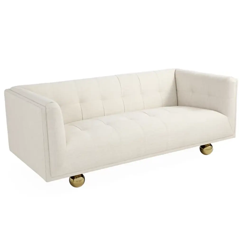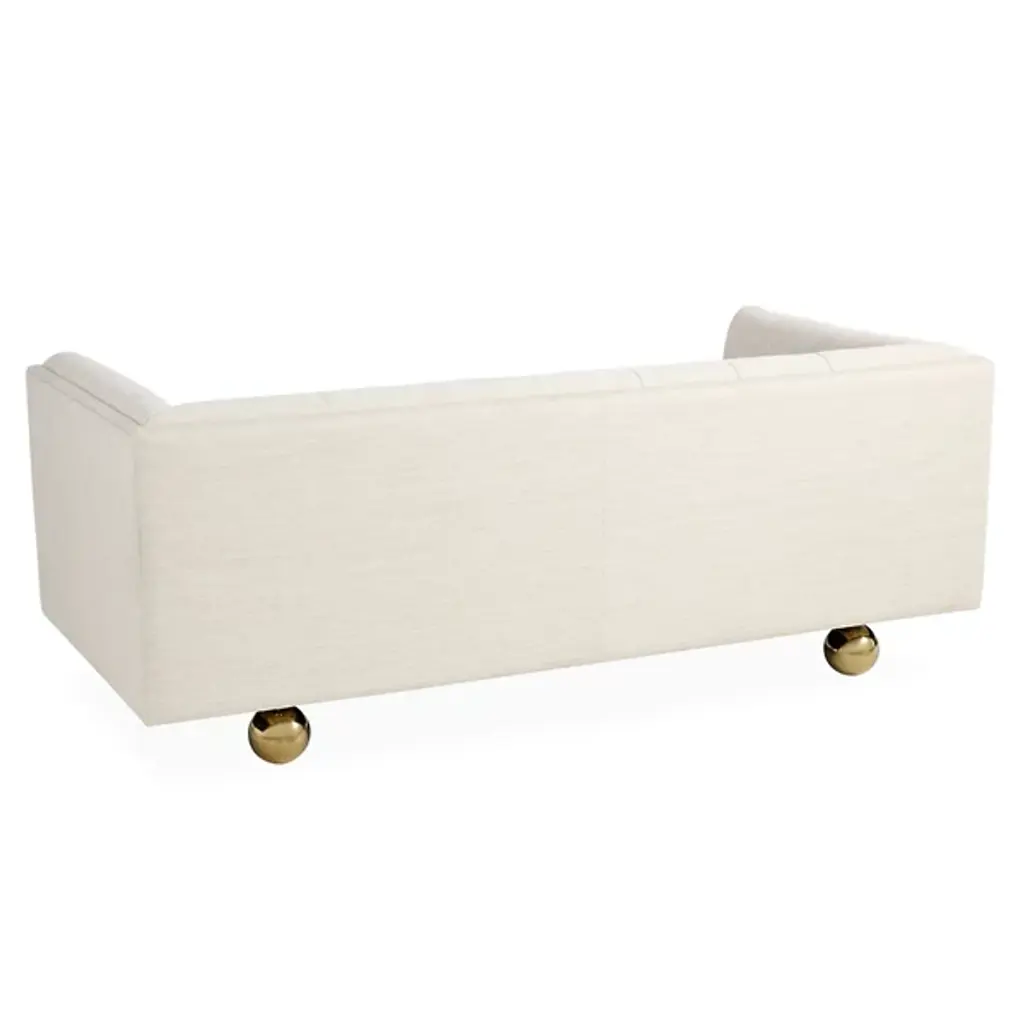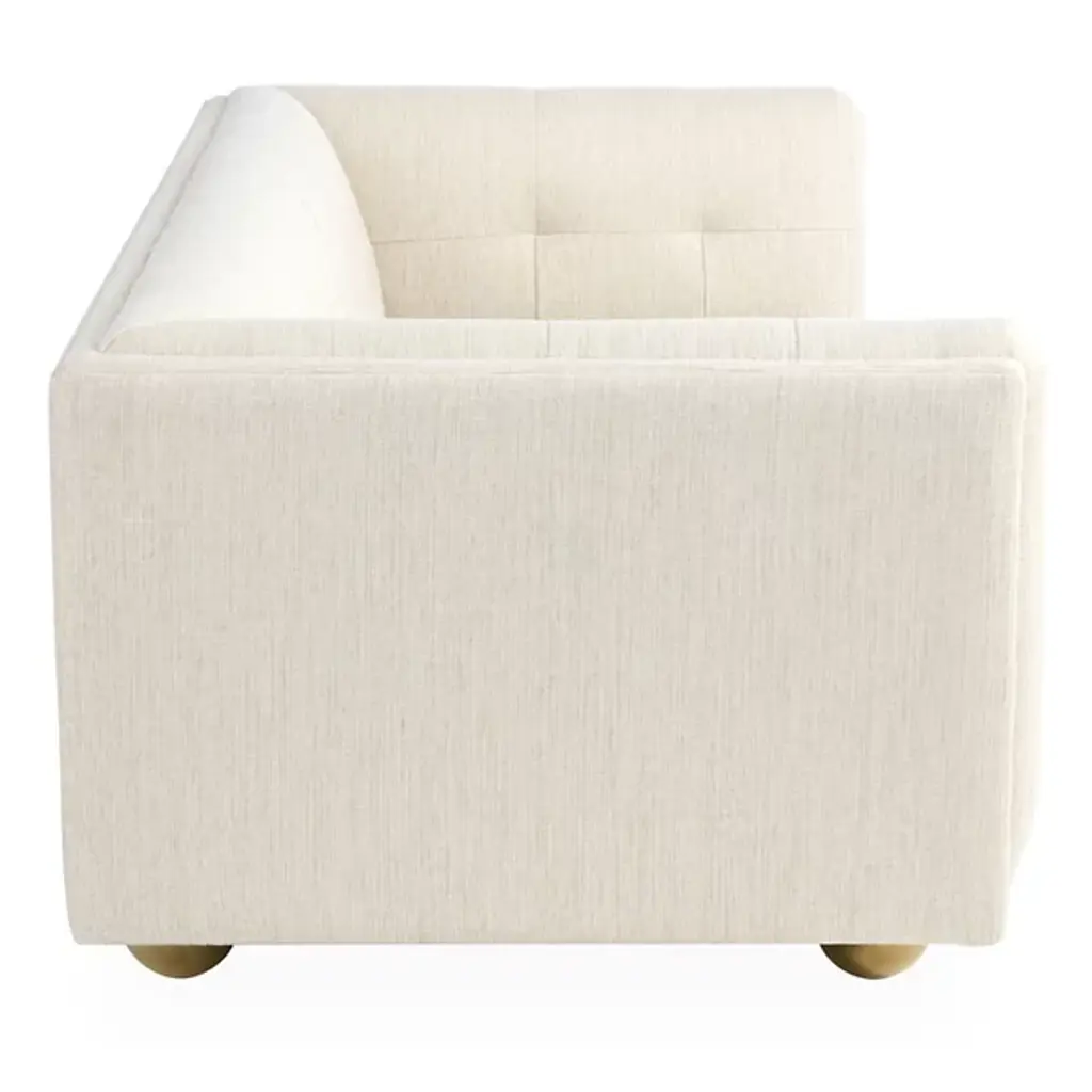 Upstyle indoor living spaces with the modish modernity of the Claridge Apartment Sofa from Jonathan Adler. A sprightly spin on the classic Chesterfield form crafted for more compact spaces like trendy lofts and others, it balances atop prominent brass globes instead of the traditional wood, extending a contrasting rectangular form upward. The curving upholstery presents tufted elegance with a refined modern look and plenty of depth, showcasing Adler’s impeccable craftsmanship and irreverent sense of luxury.
