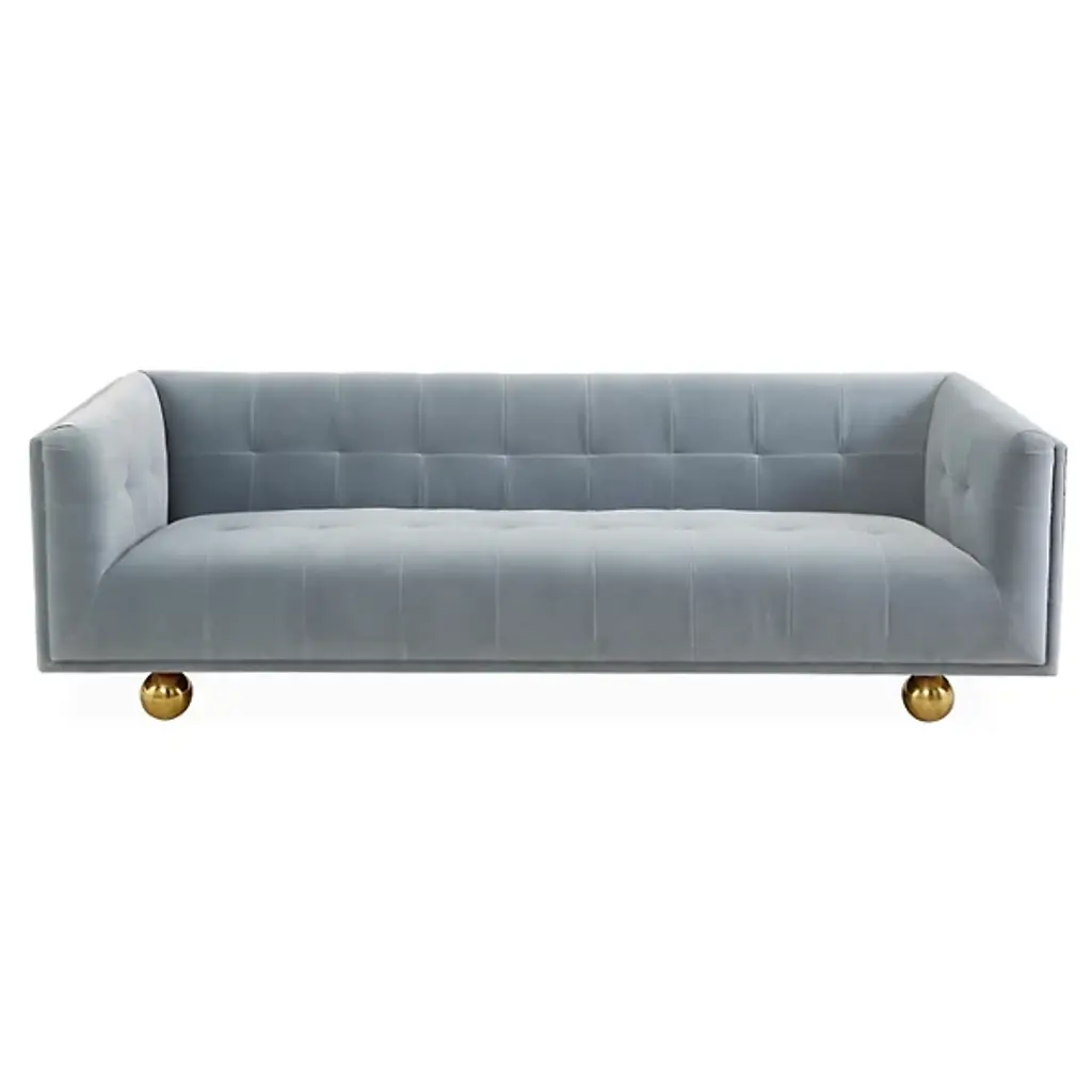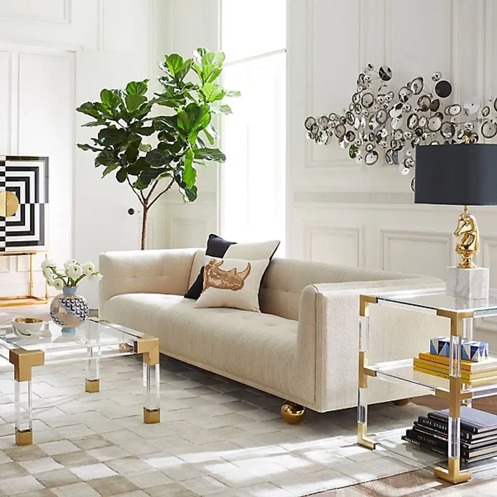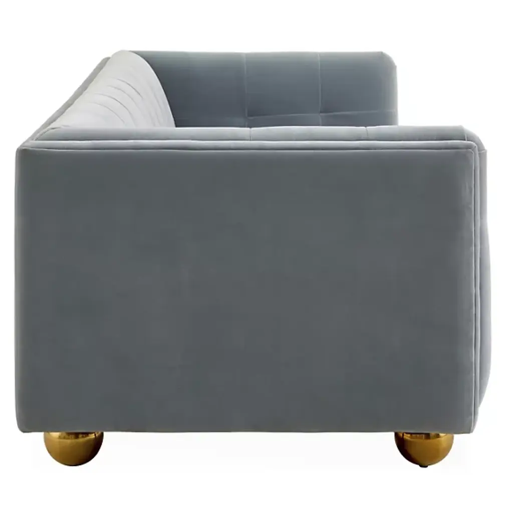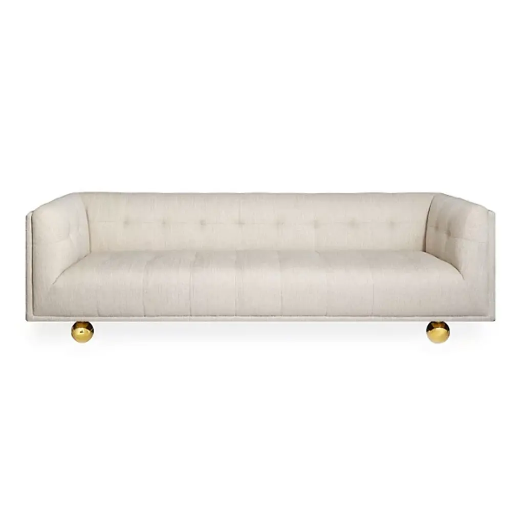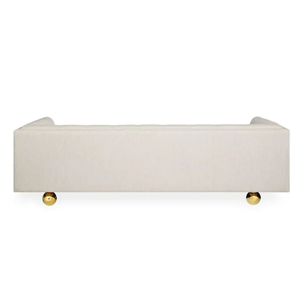 Introduce clean contours to the décor of your home with the Claridge Sofa from Jonathan Adler. Working with a range of styles and rooms within your home, this piece is elegant and appealing, with a silhouette pared down with tailored tufting for additional comfort. Replacing traditional wooden bun feet is a set of smooth brass orbs that add a unique visual touch. The loungey look and neutral colors make for an aesthetically pleasing experience throughout the year.