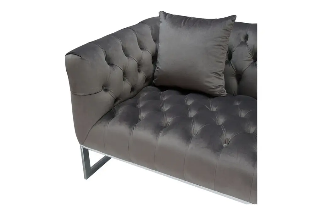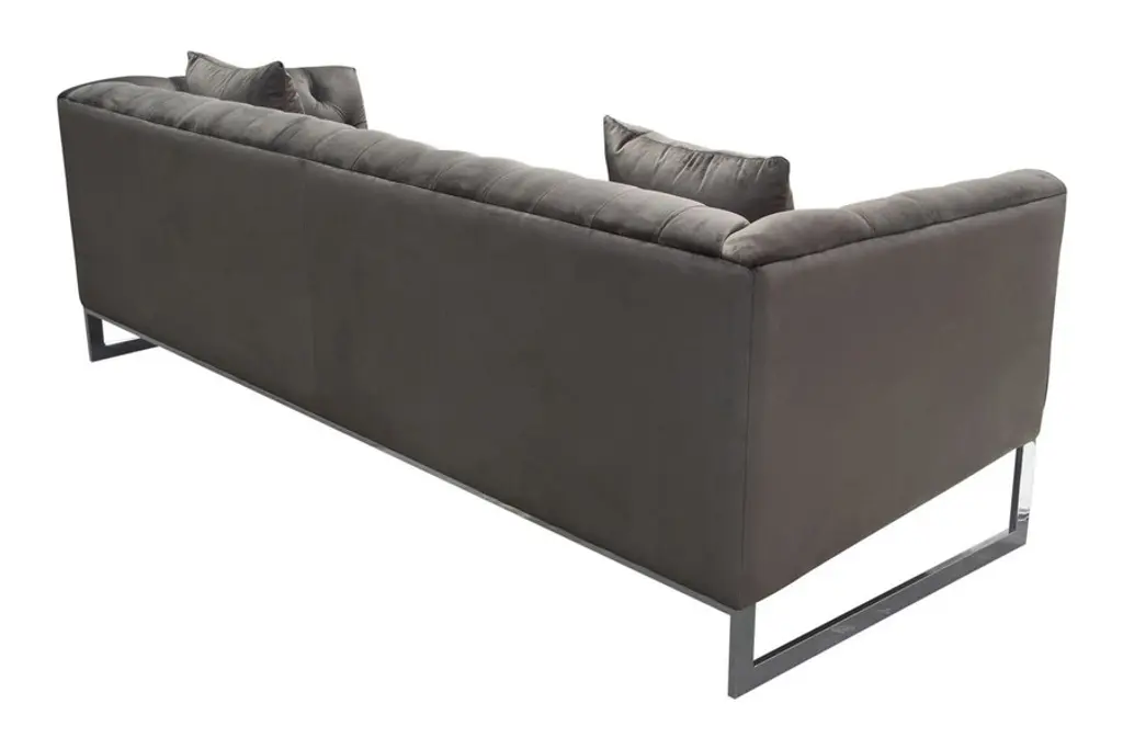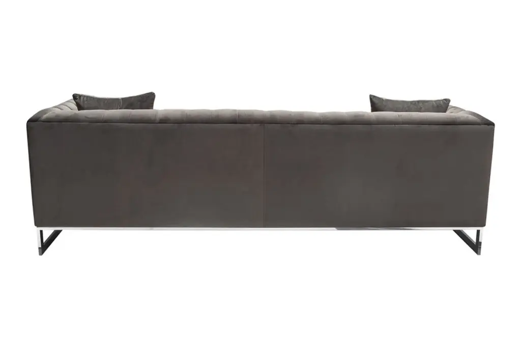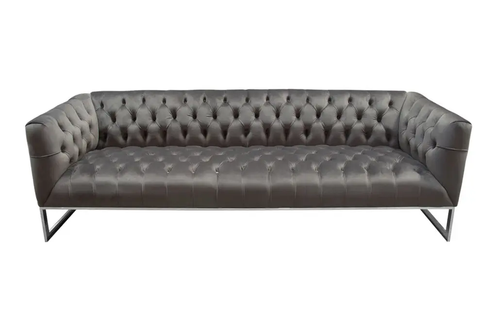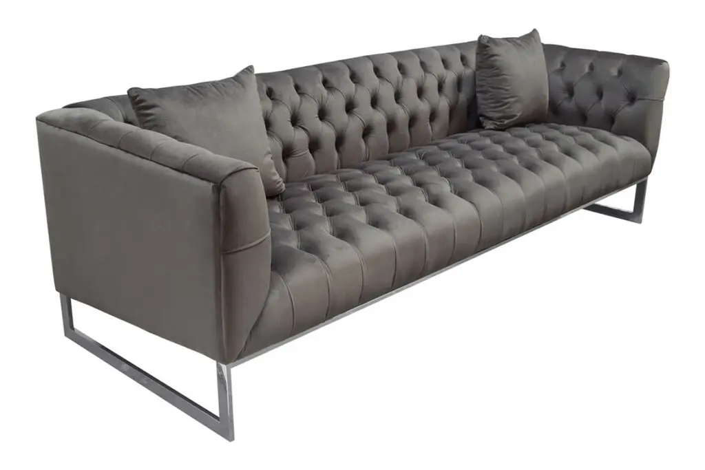 Richly luxurious, the Claudia Sofa is an exquisite representation of the comfort and regalty of the old world meets the contemporary clean style of the modern age. It is fully upholstered in soft velvet accented by precious button tufting along its fabric. It is supported by an exquisitely stunning polished metal base. It comes with perfectly placed matching accent pillows.
