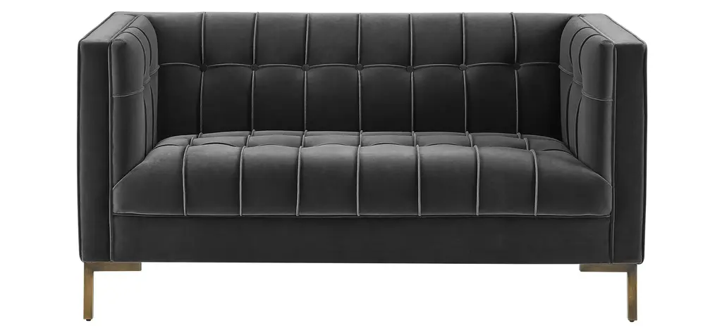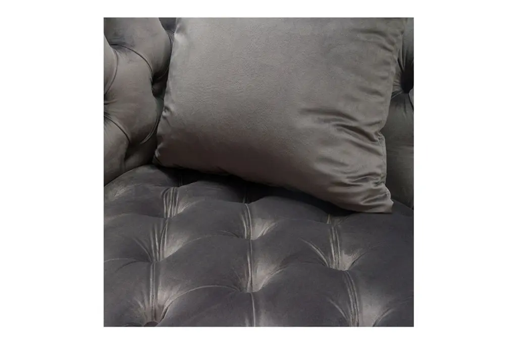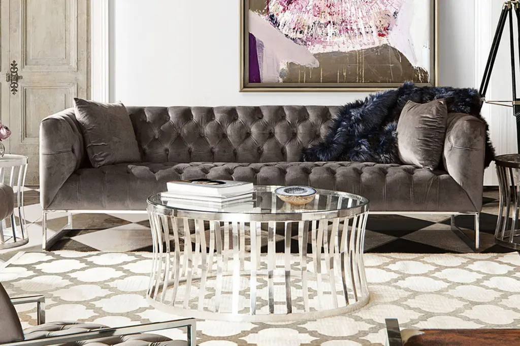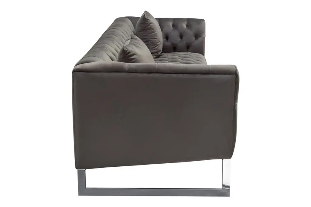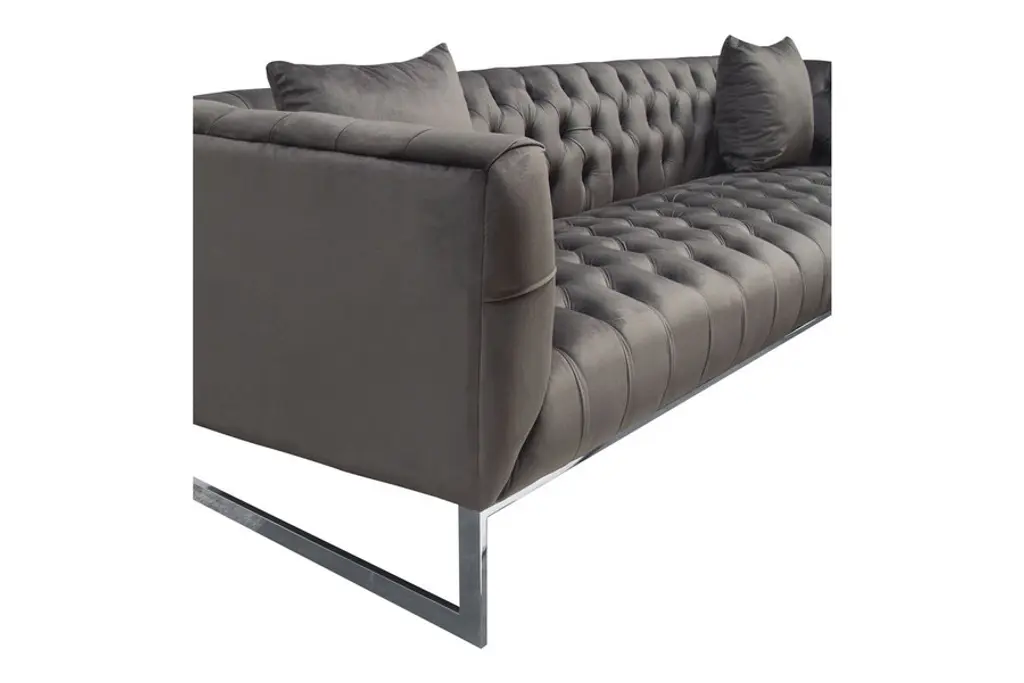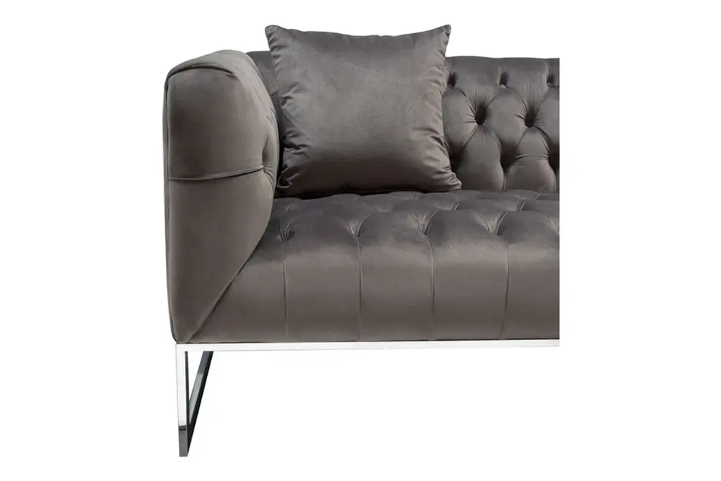 Richly luxurious, the Claudia Sofa is an exquisite representation of the comfort and regalty of the old world meets the contemporary clean style of the modern age. It is fully upholstered in soft velvet accented by precious button tufting along its fabric. It is supported by an exquisitely stunning polished metal base. It comes with perfectly placed matching accent pillows.
