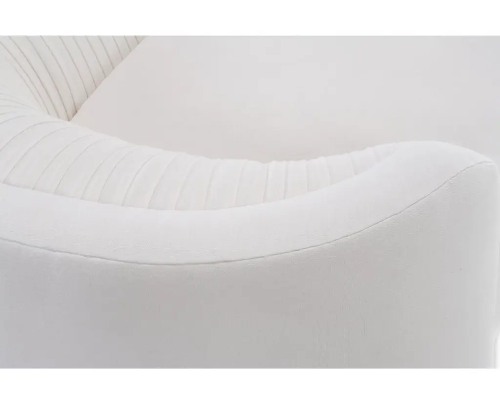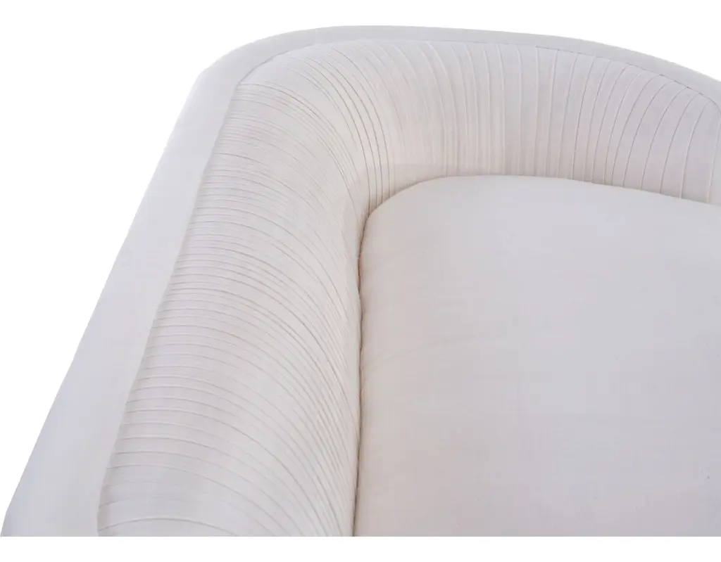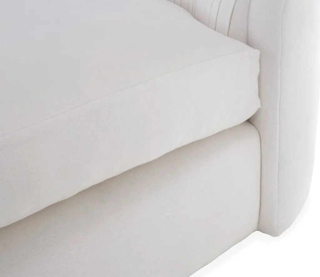 Designed by us and available only at One Kings Lane: Defined by a rounded silhouette with a tight back and wonderfully textural hand-ruching, this sofa lends a modern mood to any space. Its white linen upholstery is filled with feather and down and bolstered to a sturdy alder frame for long-lasting comfort and support. Made in the USA.