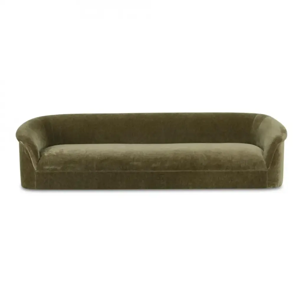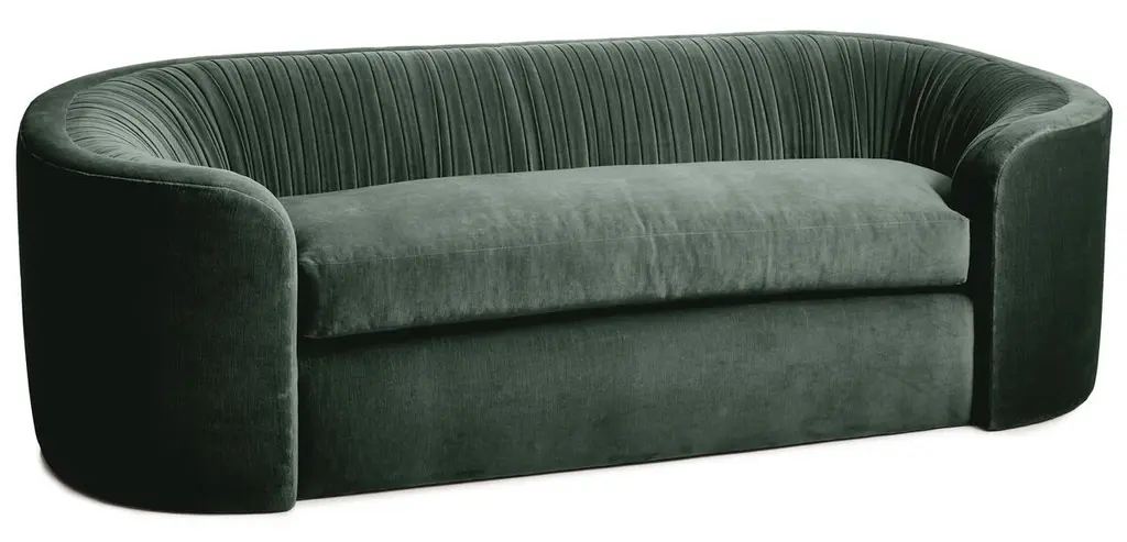 Designed by us and available only at One Kings Lane: Defined by a rounded silhouette with a tight back and wonderfully textural hand-ruching, this sofa lends a modern mood to any space. Its plush velvet upholstery is filled with feather and down and bolstered to a sturdy alder frame for long-lasting comfort and support. Made in the USA.